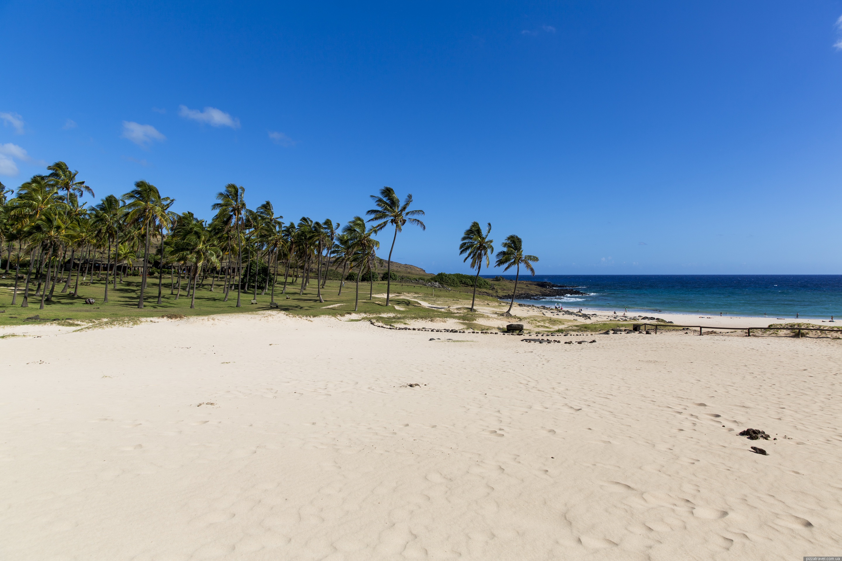 Anakena is the only sandy beach on the island. It looks like a real paradise beach: white coral sand, azure water and palm trees. The water temperature is about 20 degrees year-round. In March, before lunch, the beach is absolutely empty. In high season there are quite a lot of people here.