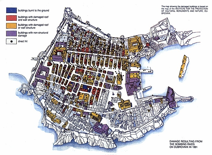 In 1667 the old city was destroyed by an earthquake and later rebuilt, but the most tragic time came in 1991. Croatia declared independence and the Yugoslav army began bombing of the city, which lasted for more than six months. On the following map you can see that most of the buildings were damaged or destroyed.