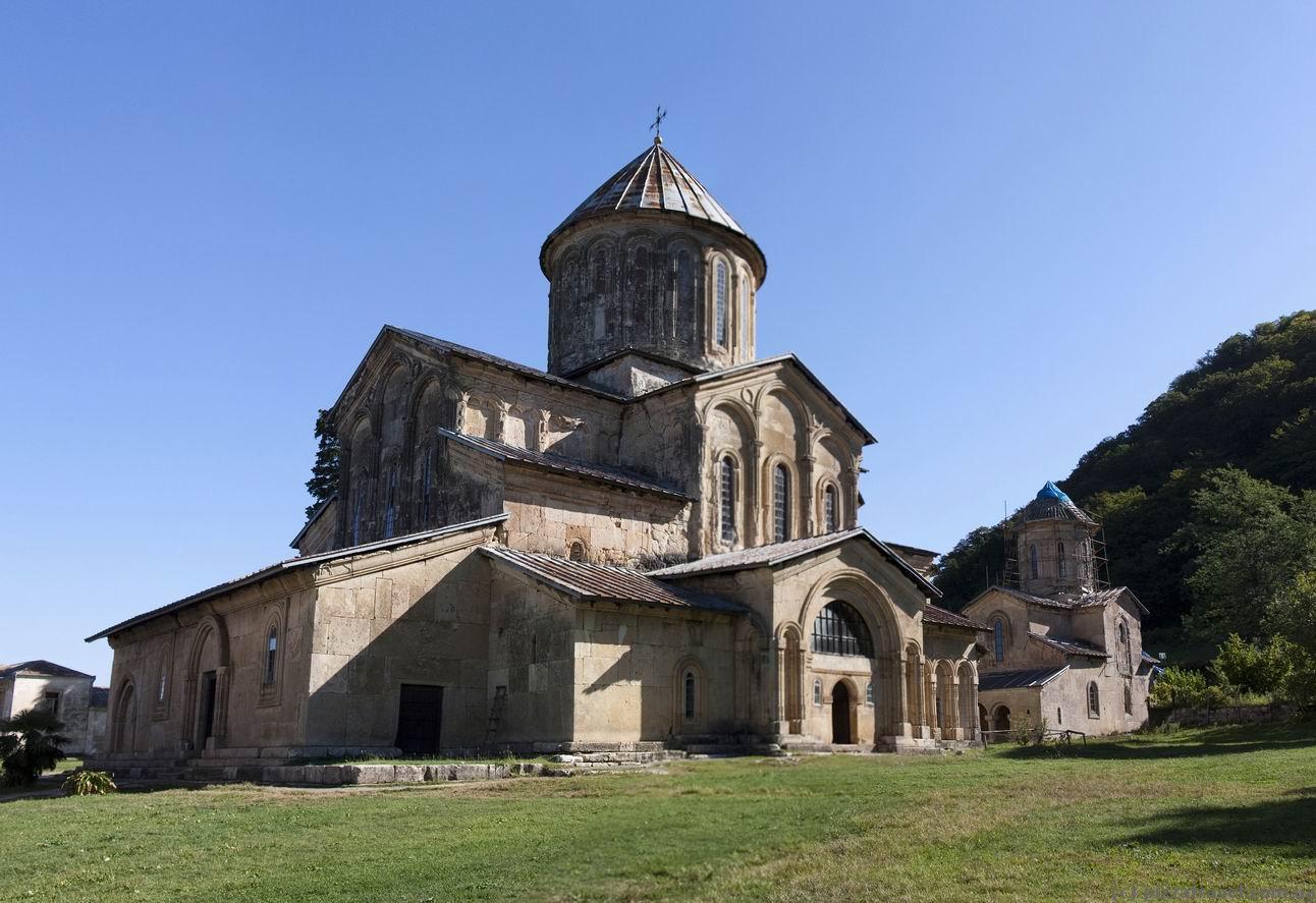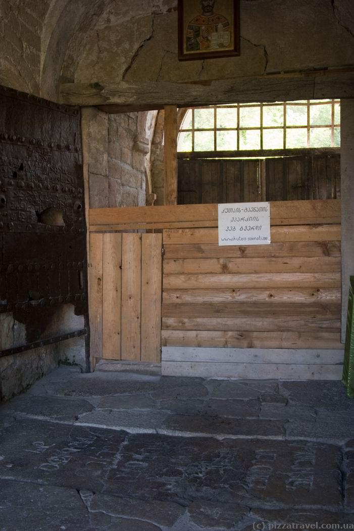 The most significant medieval monastery in Georgia is located near Kutaisi. It was founded by the King David IV the Builder in 1106. In addition to the well-preserved temples, there is one more interesting place in the monastery. According to the will, King David was buried under the gate of the monastery. The gate is not in the best condition, but note that it is 900 years old. The tombstone is right in front of the gate.