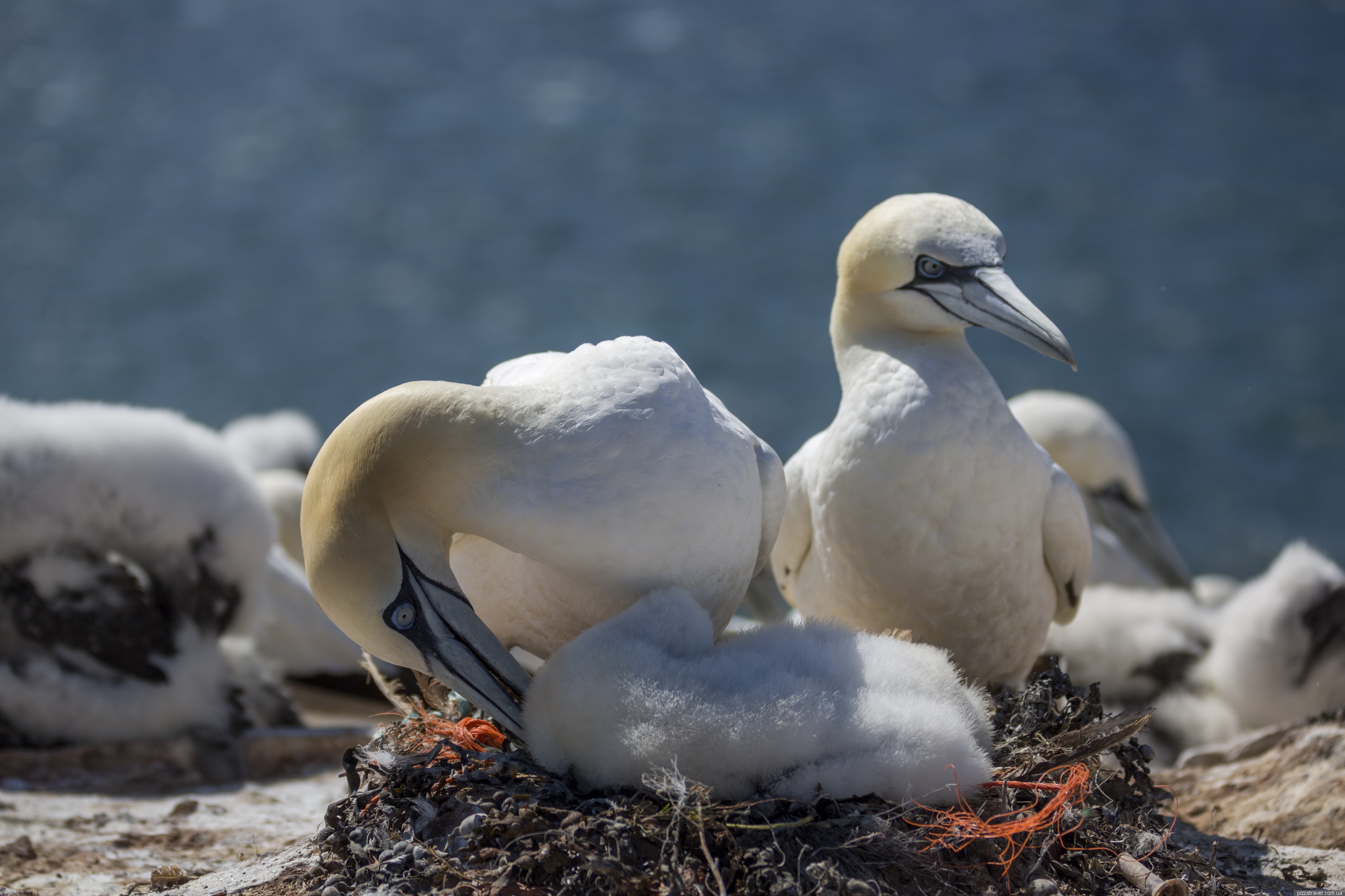 Here's one of the situations. There is a baby gannet in the nest. Mom takes care of him and dad is on guard, all the day!
