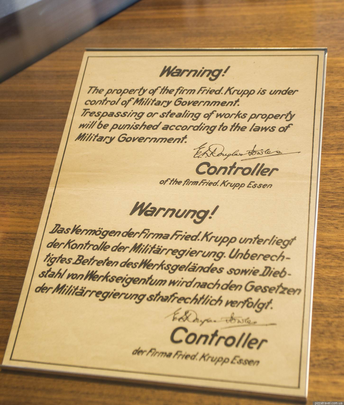 Warning that all property of "Friedrich Krupp" is controlled by the military. This is not surprising, since at all times of its existence Krupps were the largest arms manufacturers. And of course served to all rulers of Germany, including Hitler.
