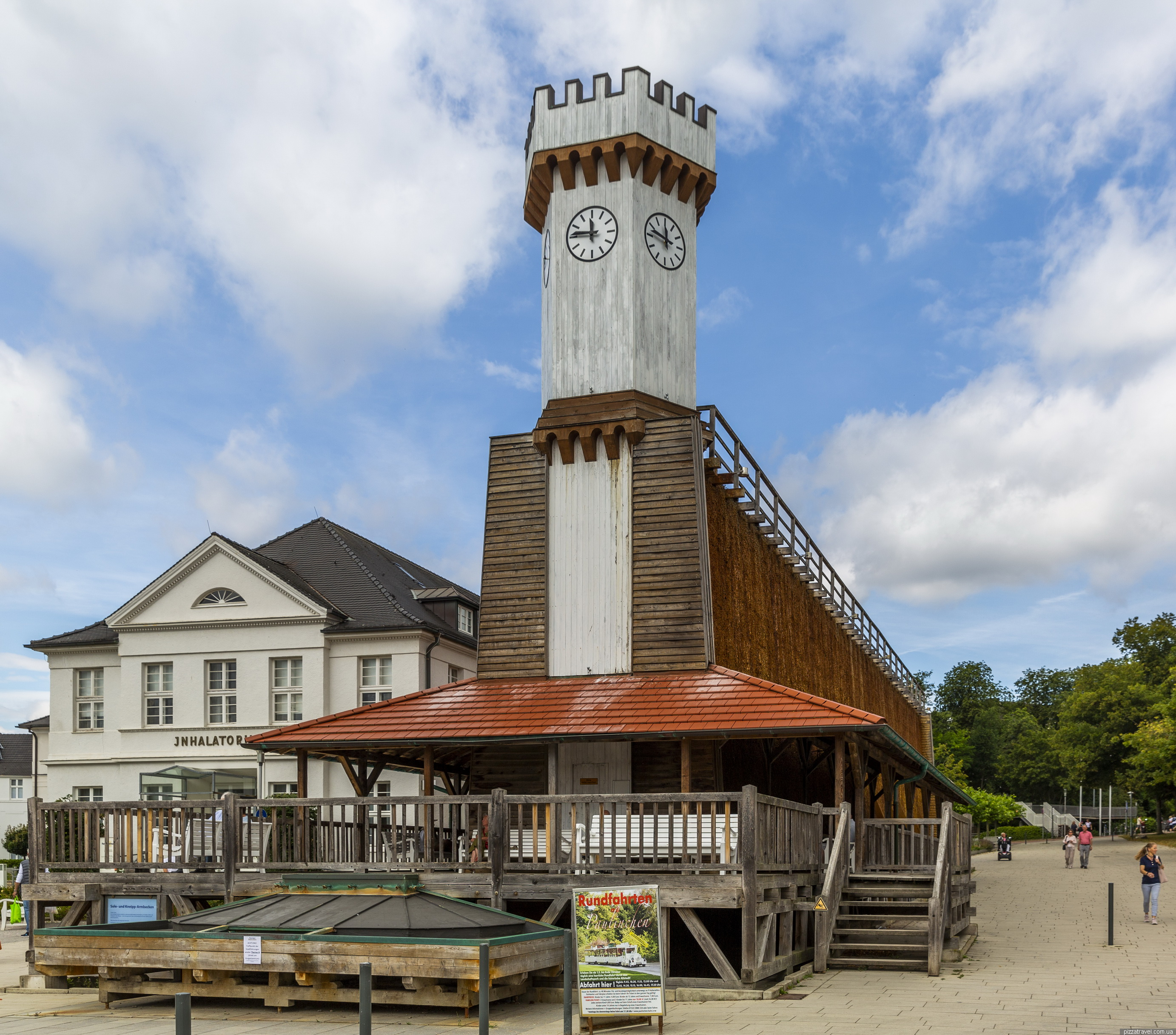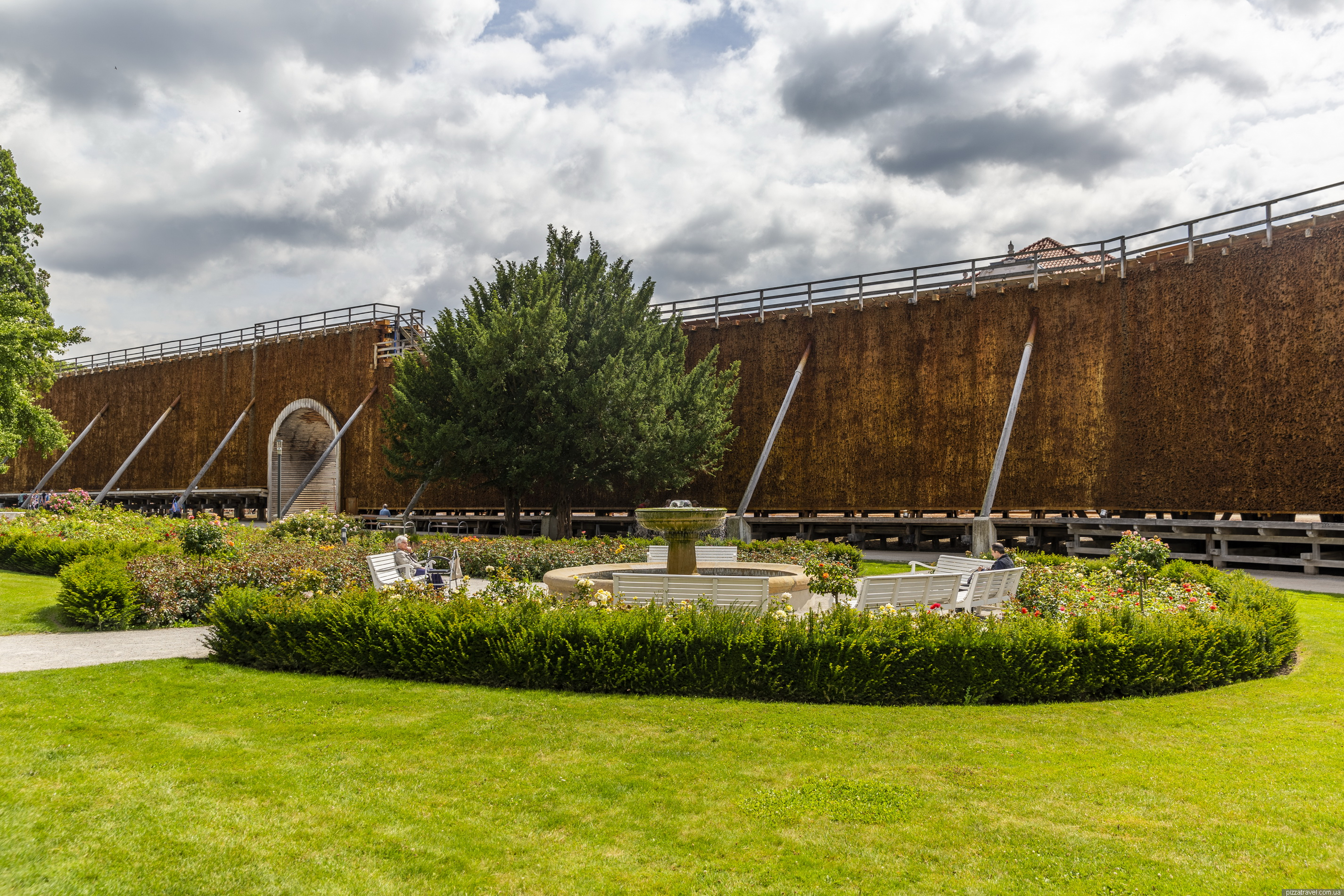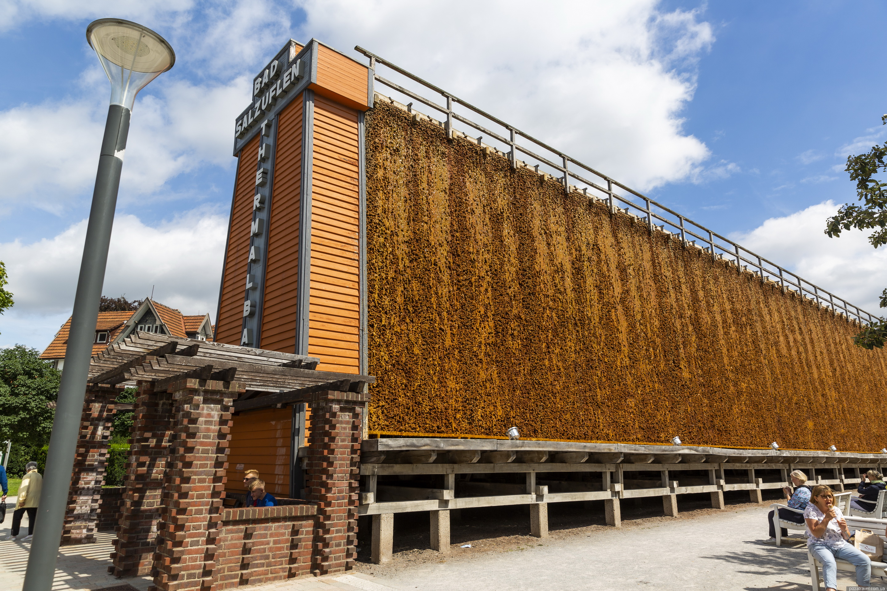 Even on the spot we could not understand what it this, so we went on the Internet. The official name of this construction is Graduation tower (Gradierwerk) and these walls were used for salt production. Mineral water was lifted from the ground by pumps, which worked with windmills. Then the water slowly flowed down the branches of blackthorn that made up the wall. Along the way it evaporated and the salt concentration increased.