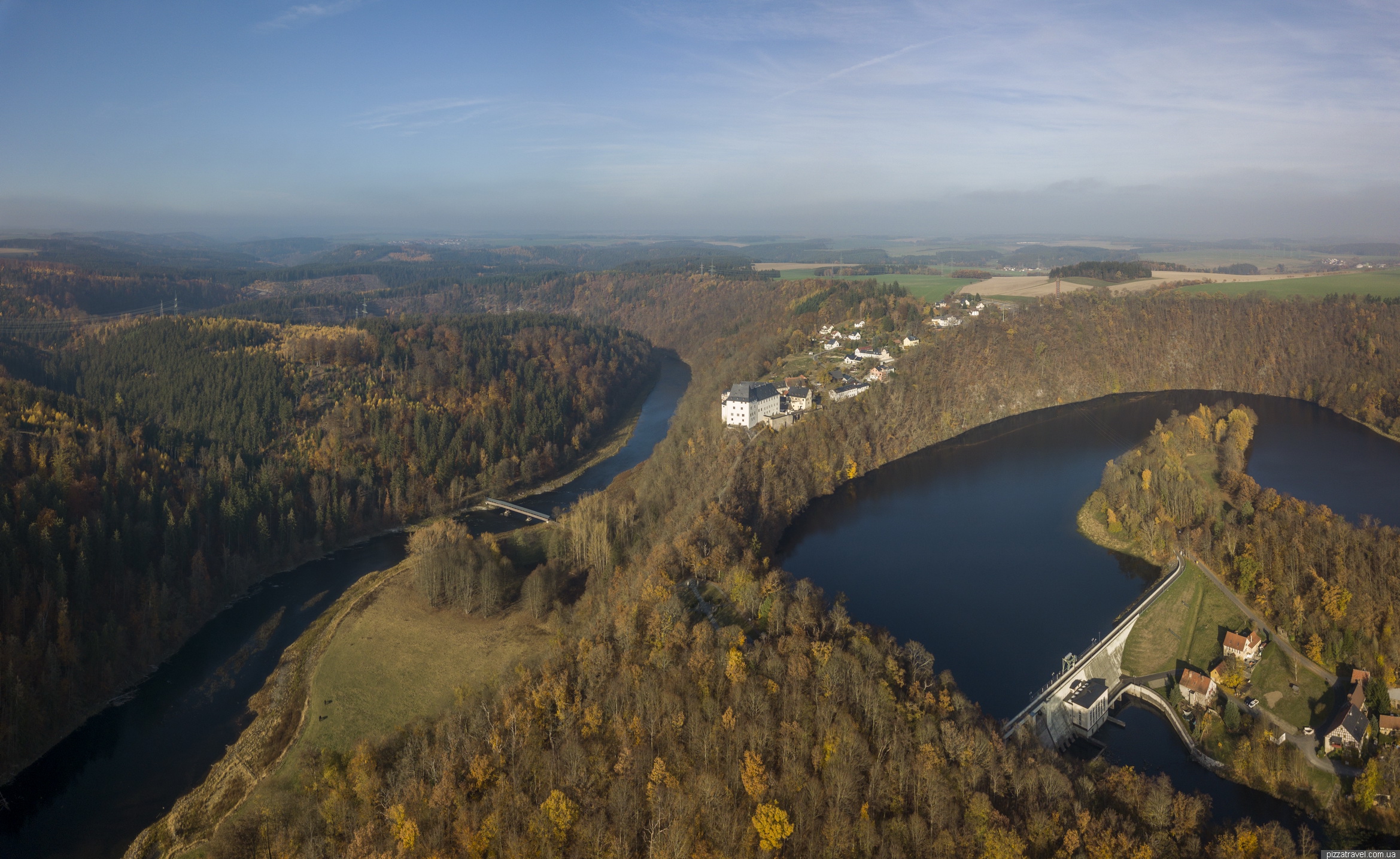 Located on a rocky plateau, surrounded by hills, there is a reservoir and many hiking trails. For example, you can go down to the bridge, which is visible on the left. Or take a walk along the dam (right).