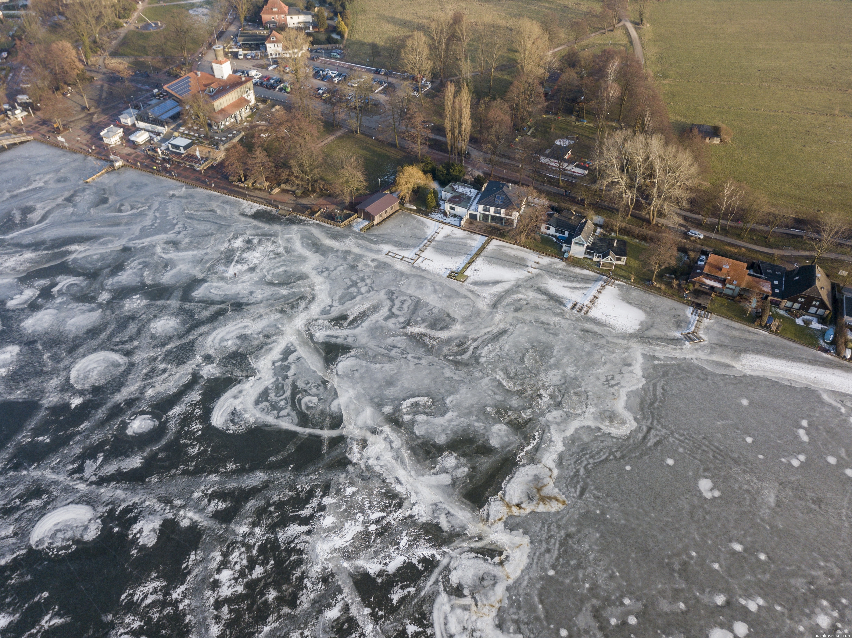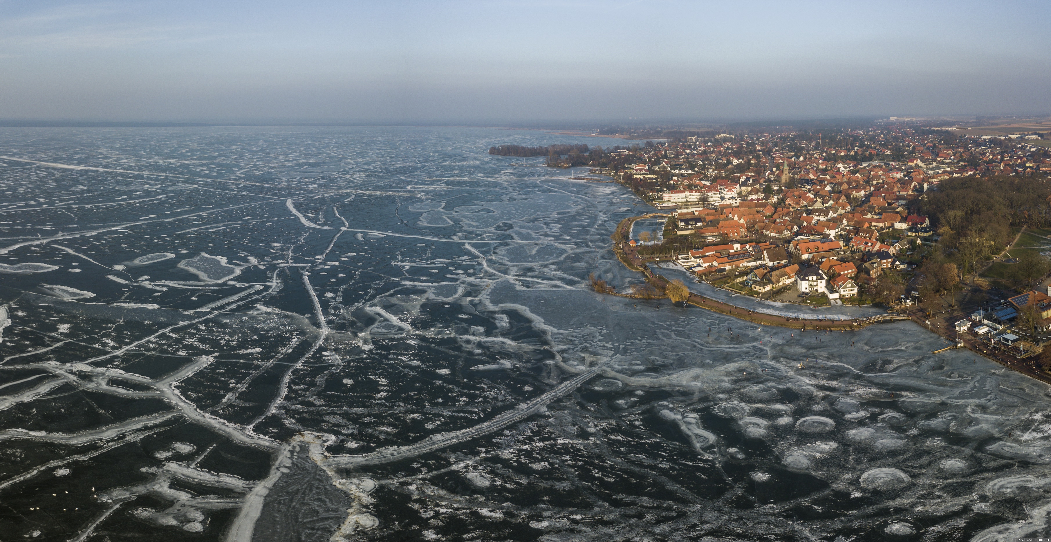 In winter, the lake periodically freezes and people come to walk on the ice.
