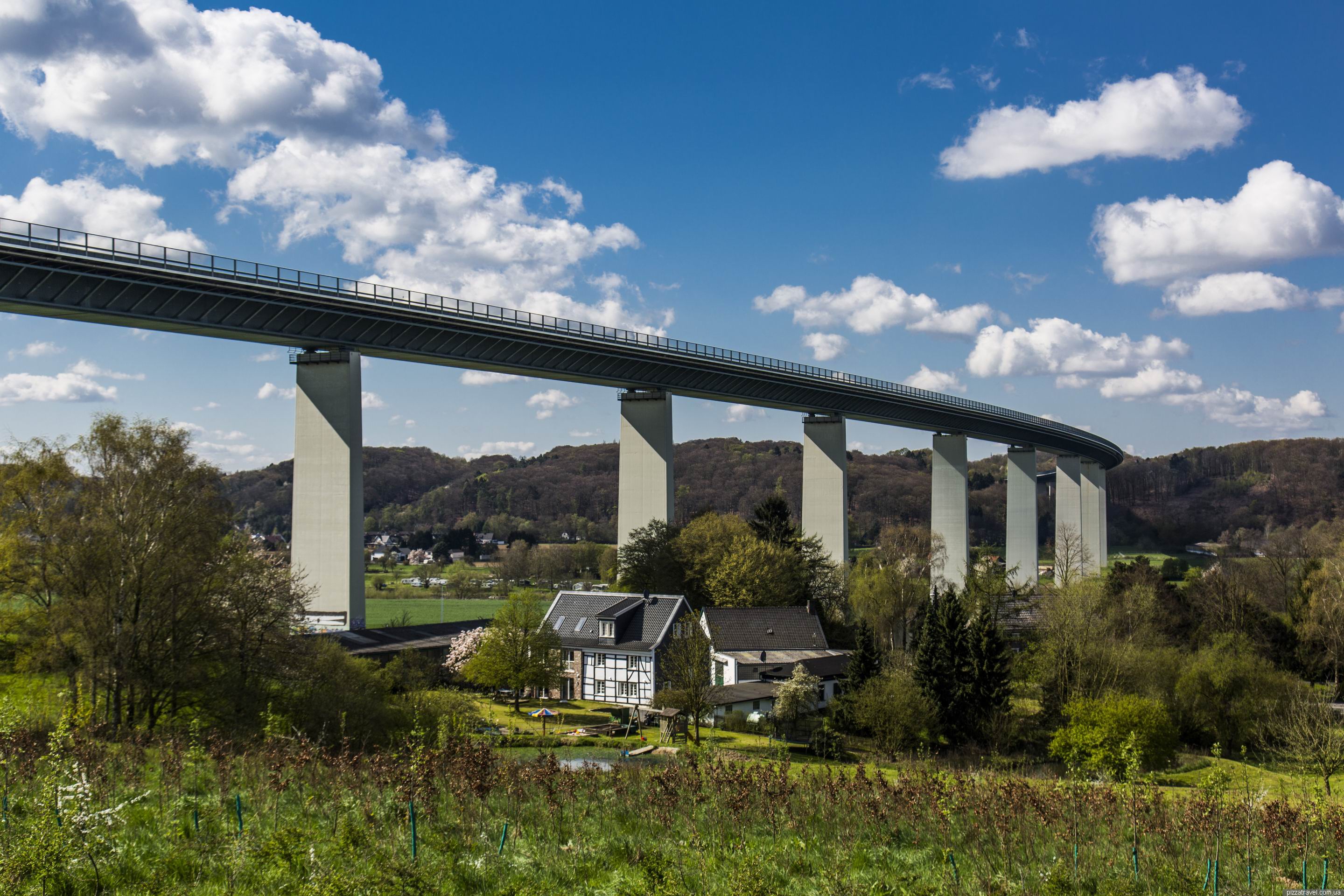 The Ruhrtal Bridge in Mülheim-Mintard is the longest steel-bridge in Germany and one of Europe’s biggest bridge construction projects after WWII. With a length of 1830 m it spans across the Ruhr Valley. Its construction dates back to 1962/1963 and sits on 18 pillars of ferroconcrete that range from 27 m to 60 m in height.