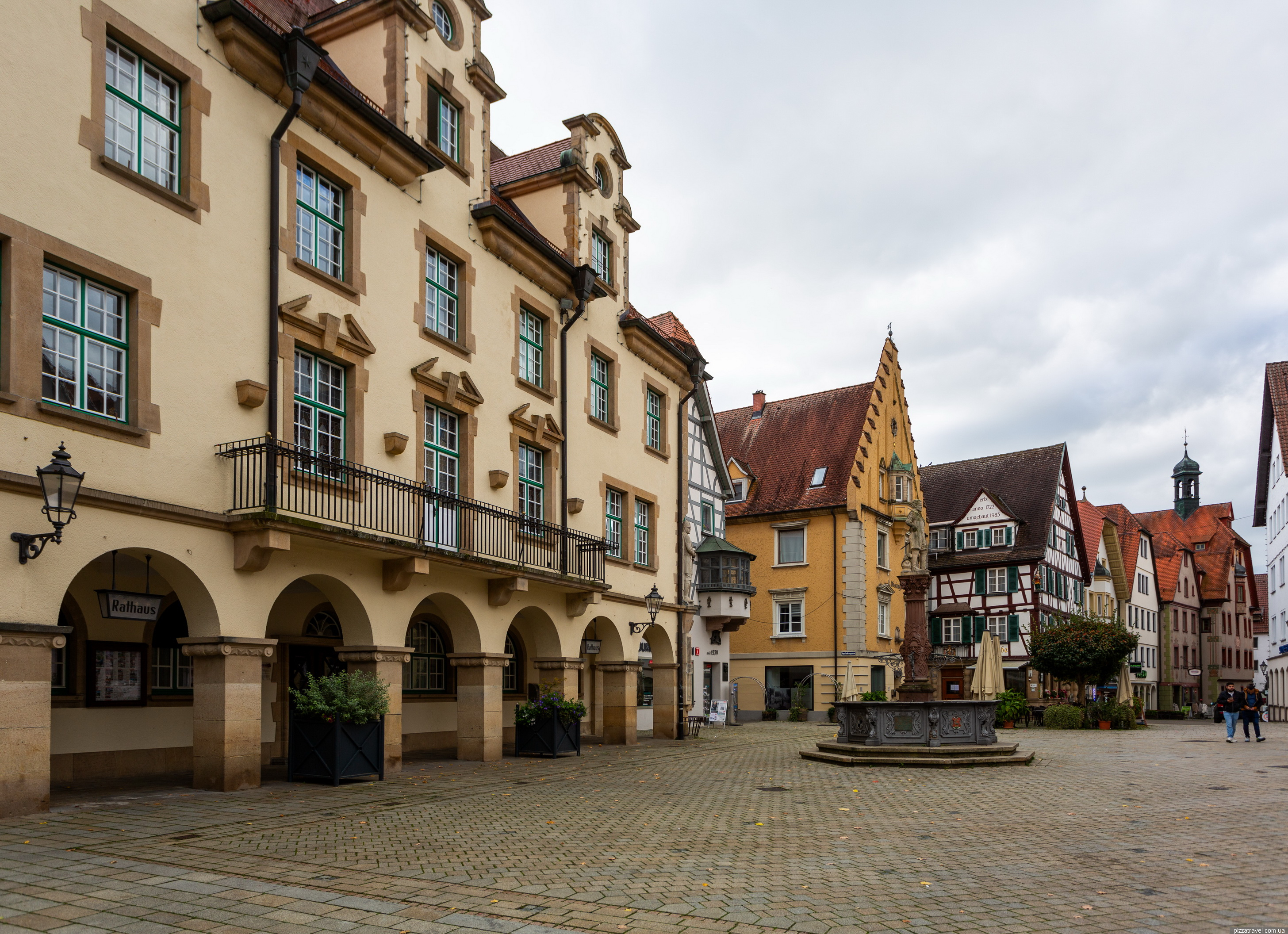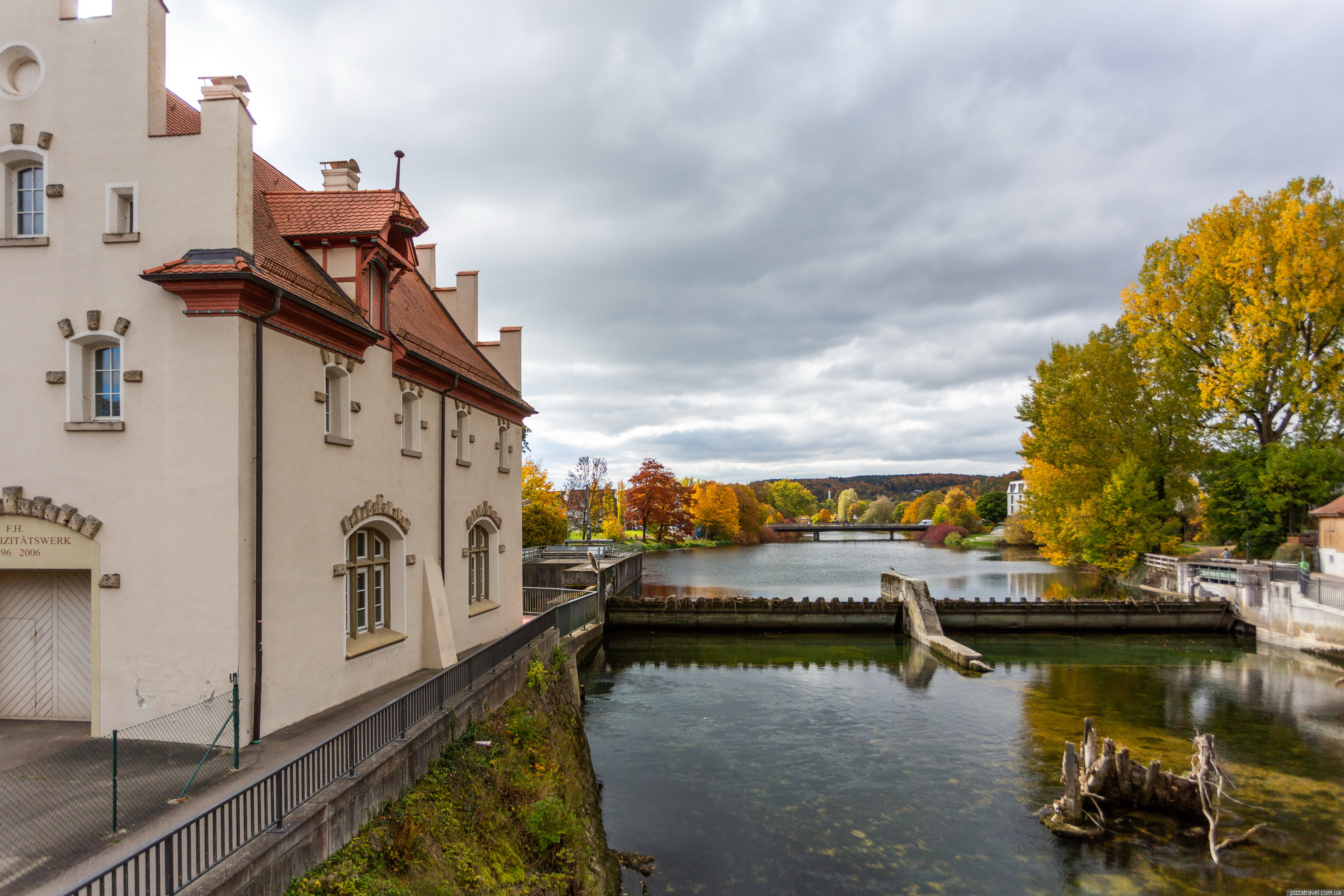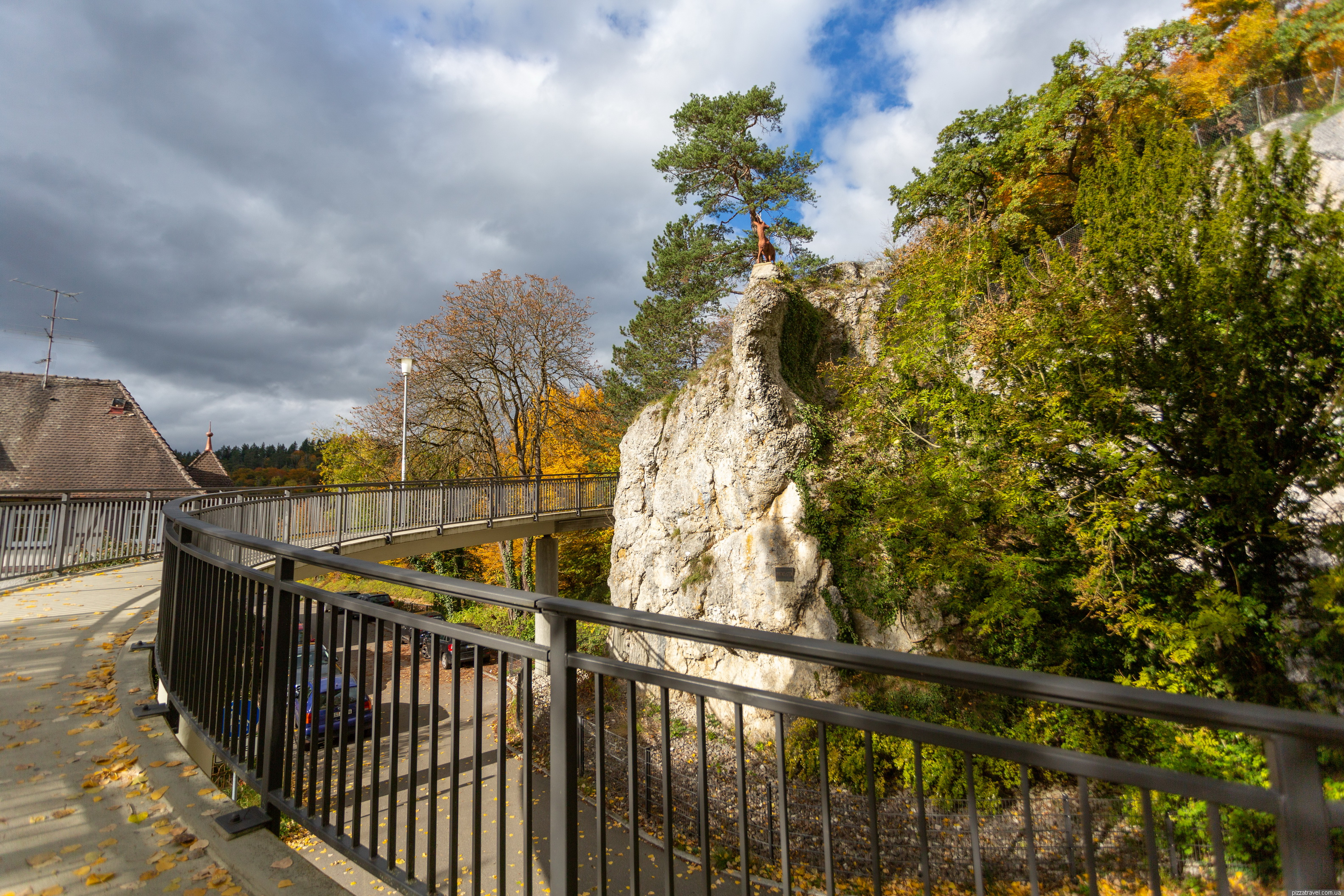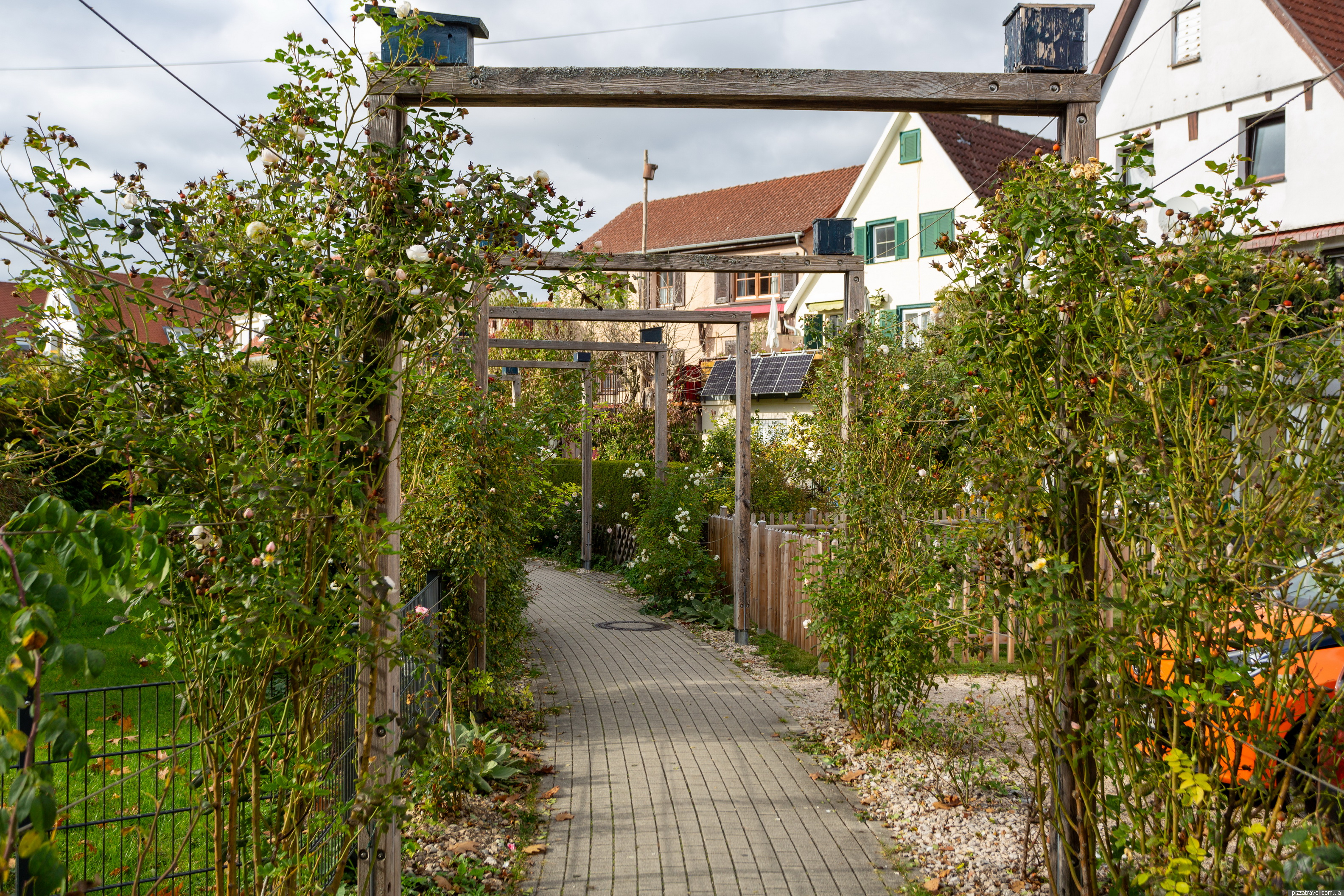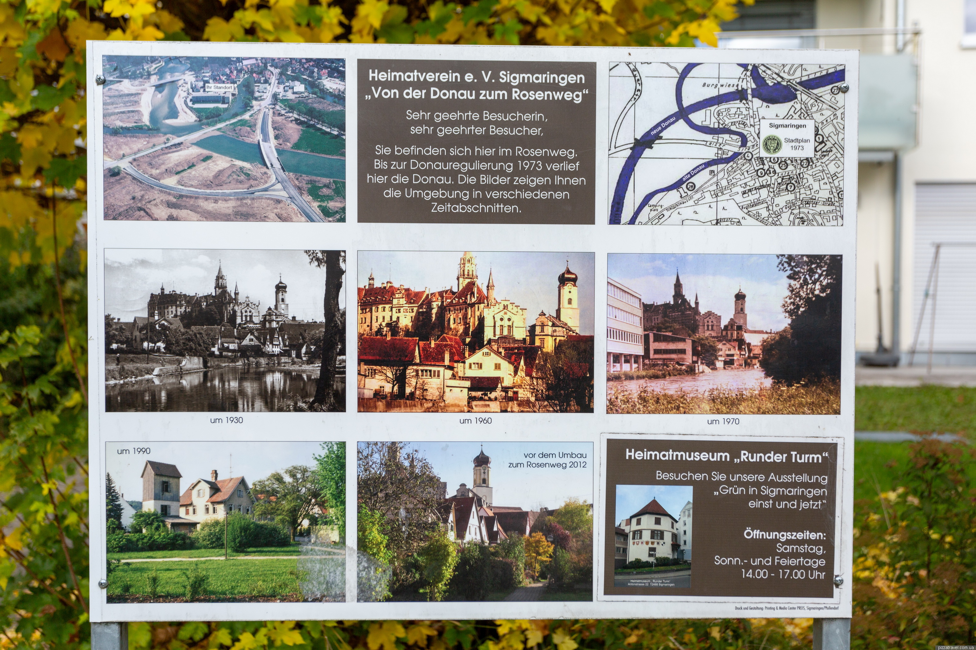 Here, at 48.086972, 9.213889, we went through a small rose garden and returned to the car via a different bridge. The rose garden has a display stand with old photographs of the city; it’s quite interesting because there used to be a marsh in this spot.