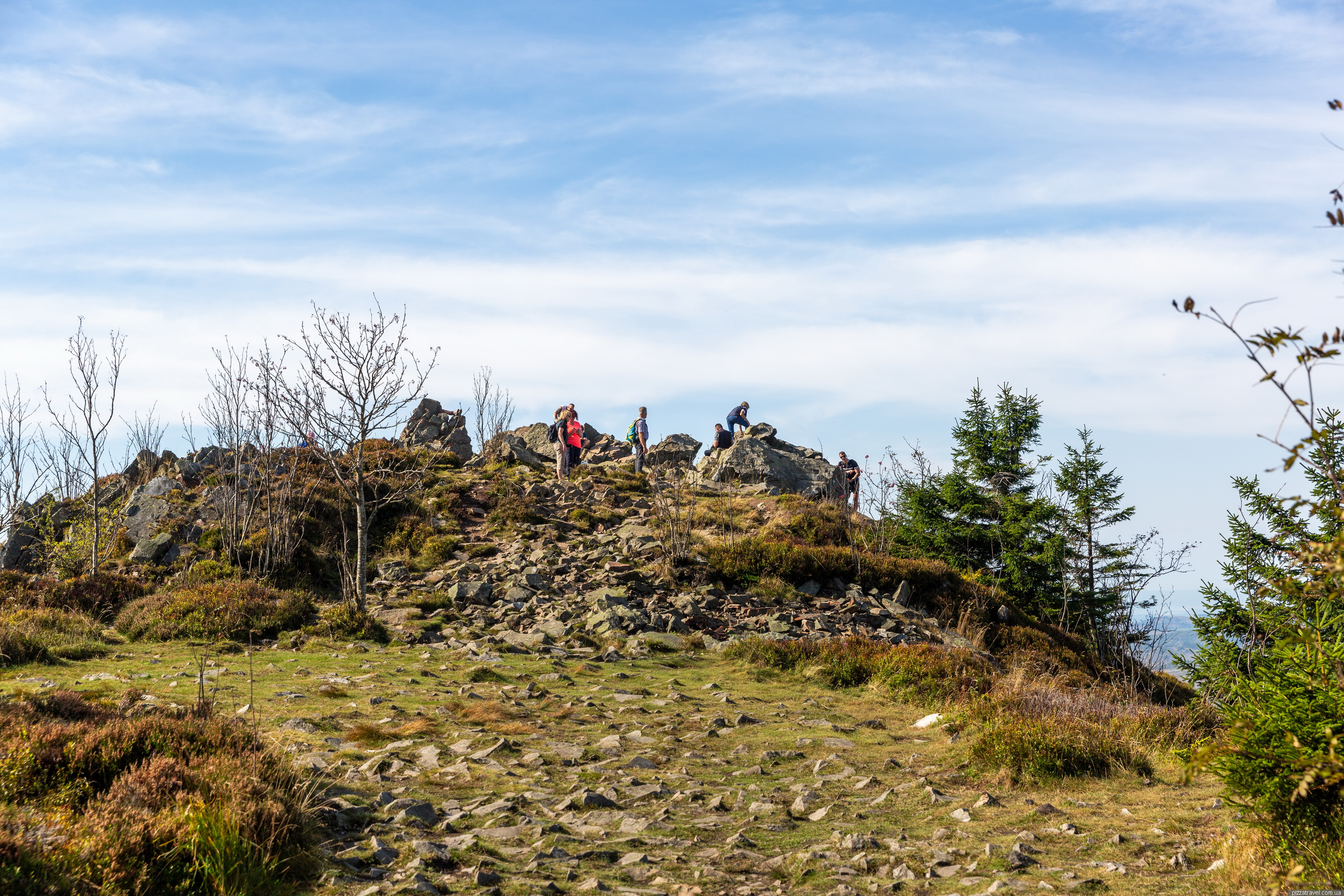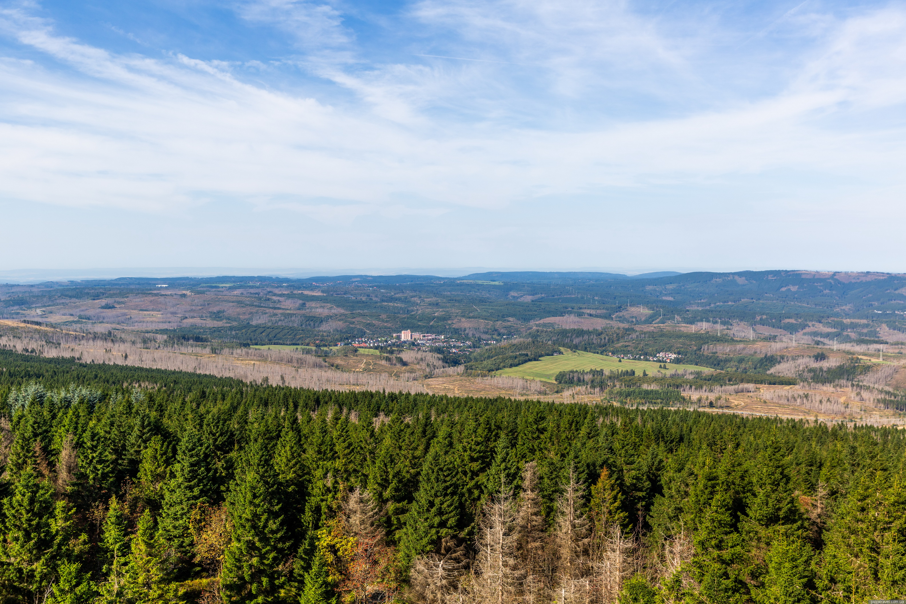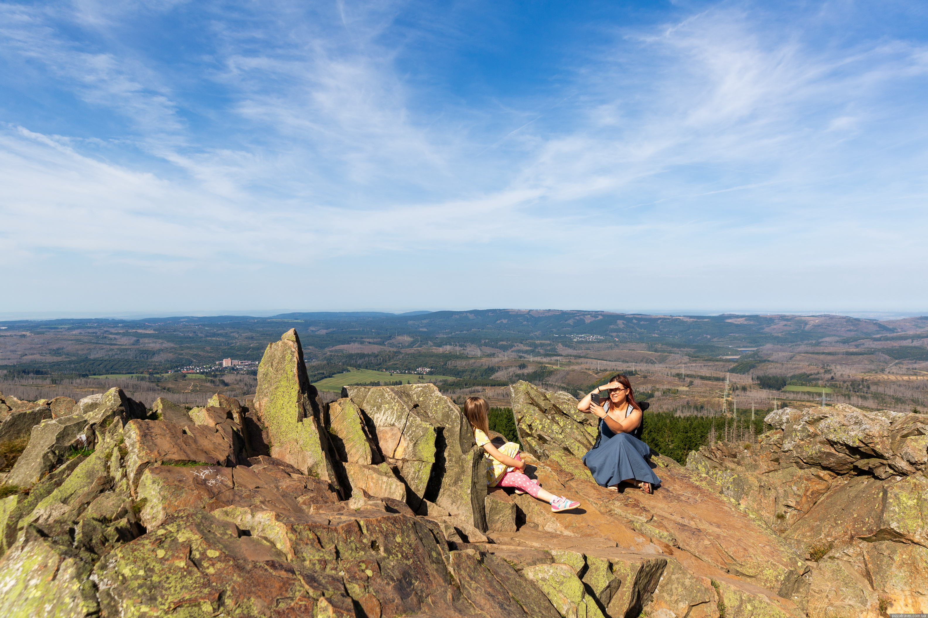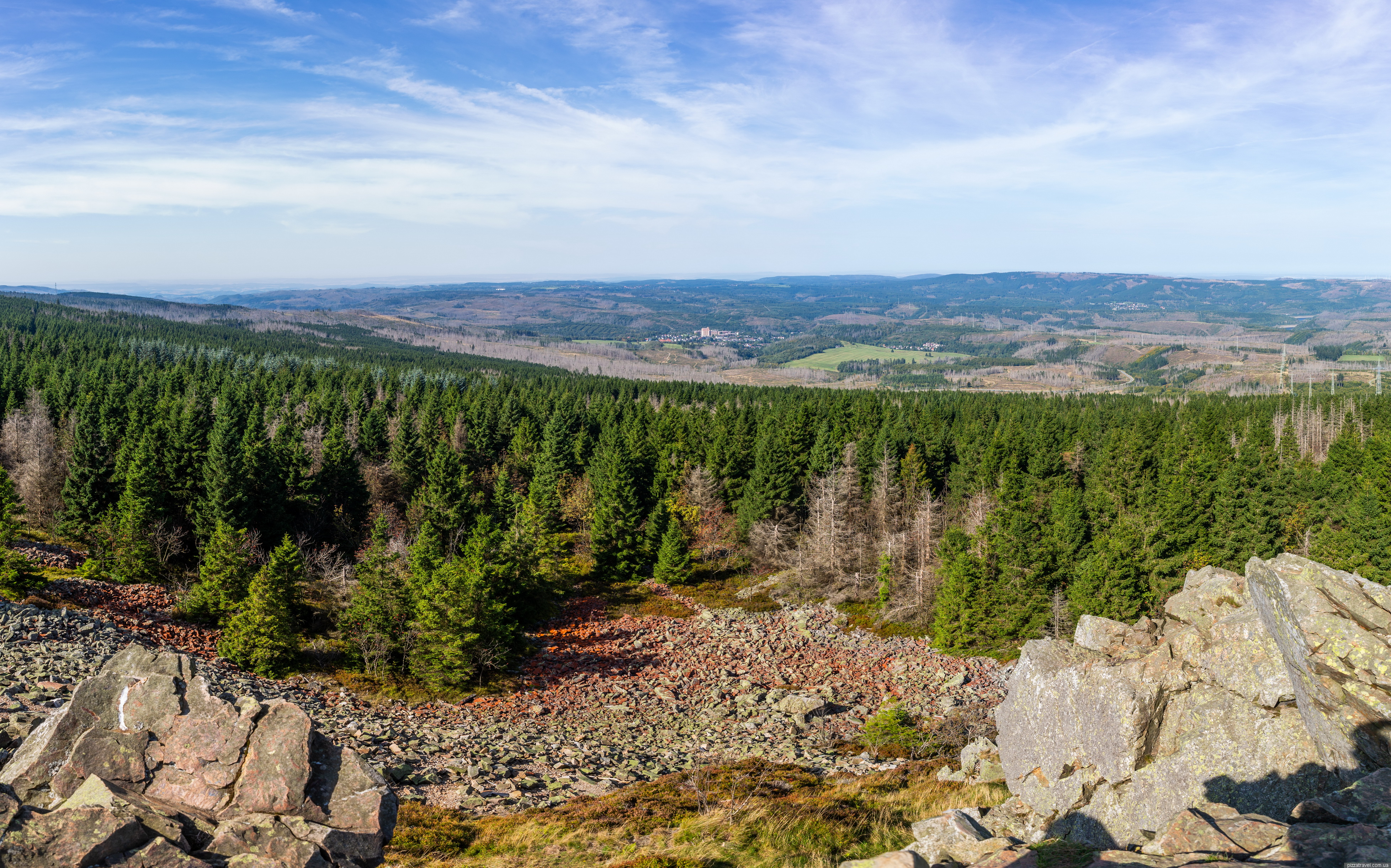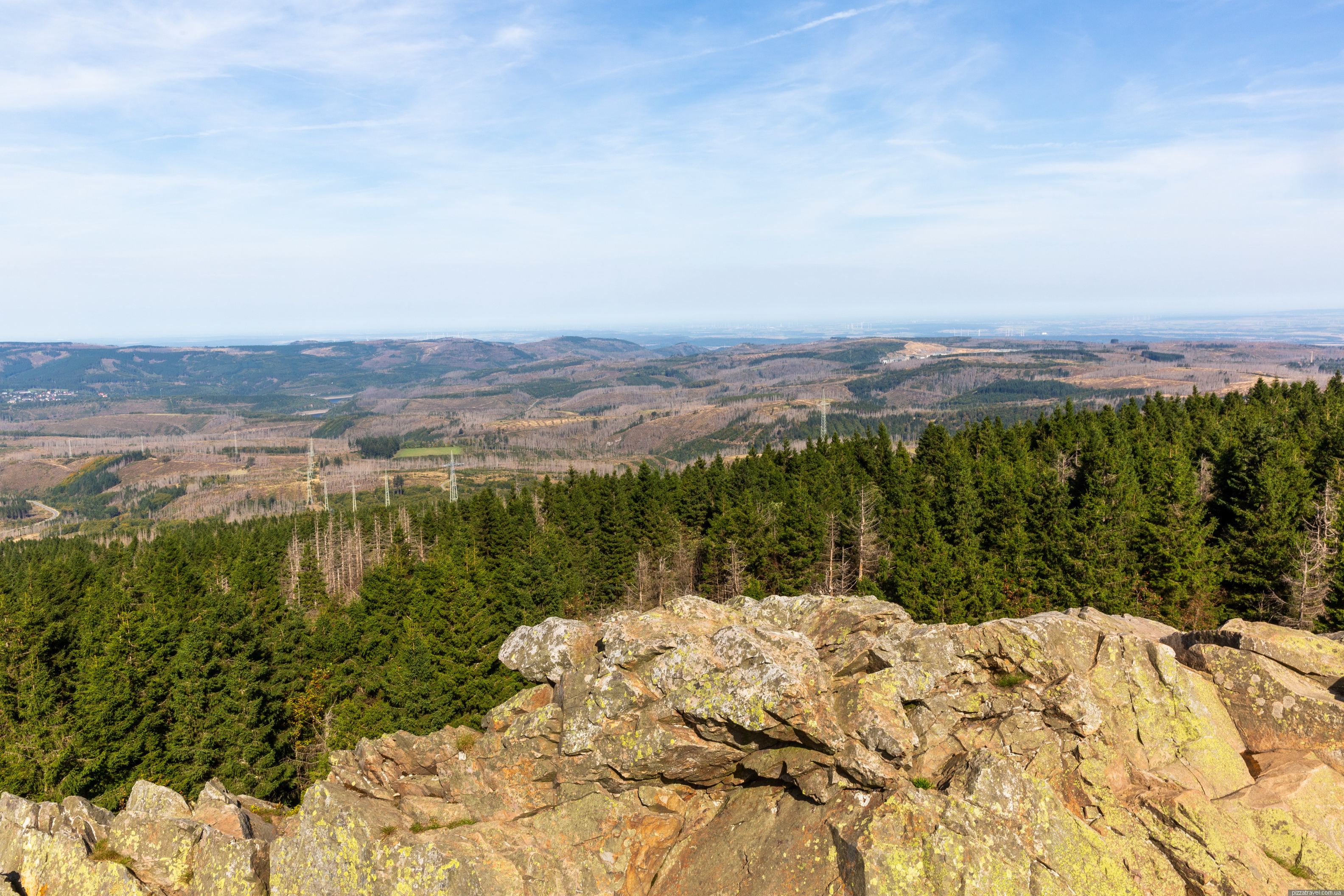 The Wolfswarte rock is located in the Harz mountain region at an altitude of over 900 meters and is a rock formation featuring a viewing platform. It is not an artificial tower, but a natural rock. From here, a panoramic view opens up over the Harz forests, which stretch to the horizon.