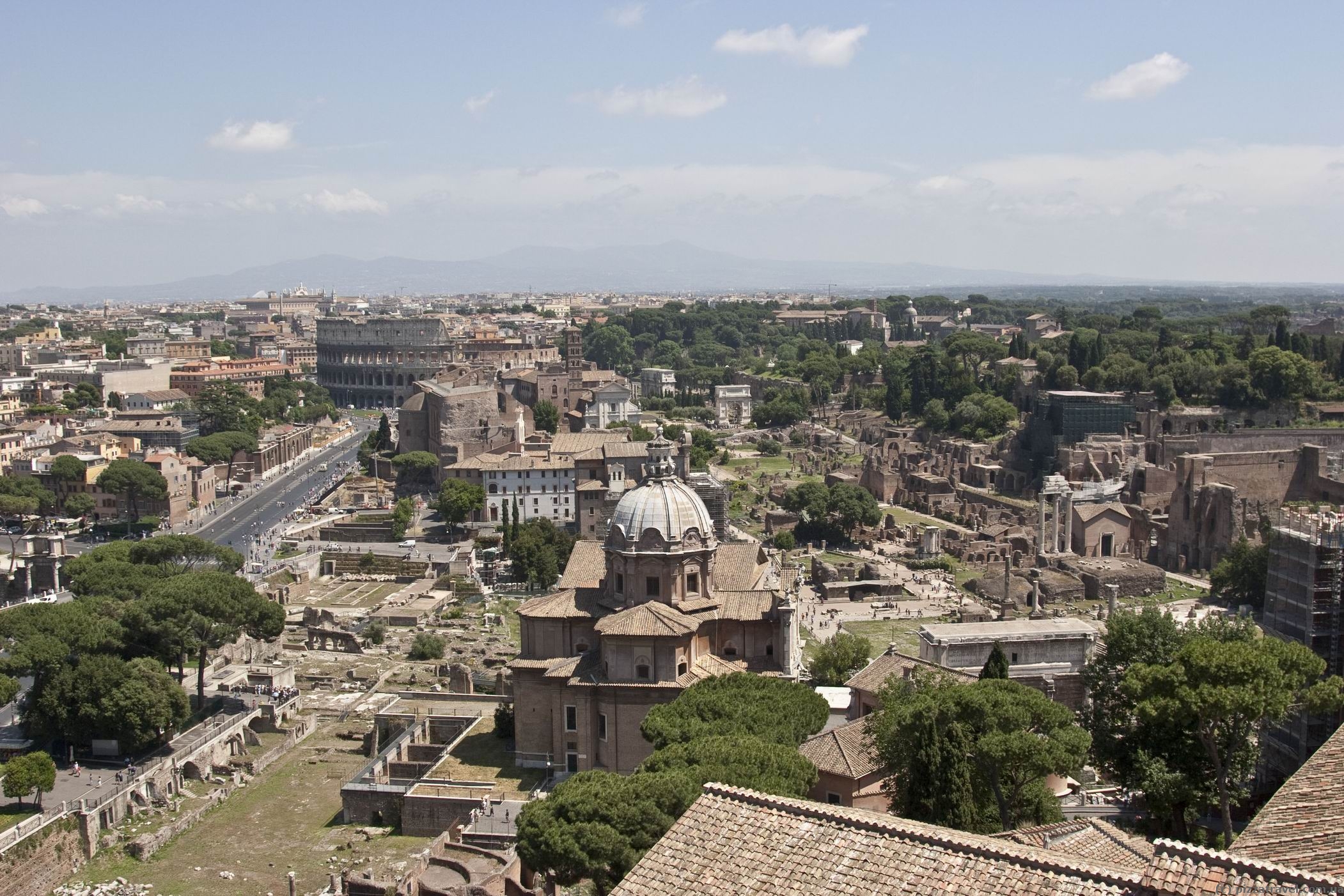 Walk through the square and go around the building with a tower on the left side. Behind you'll find an observation deck overlooking the Roman Forum.