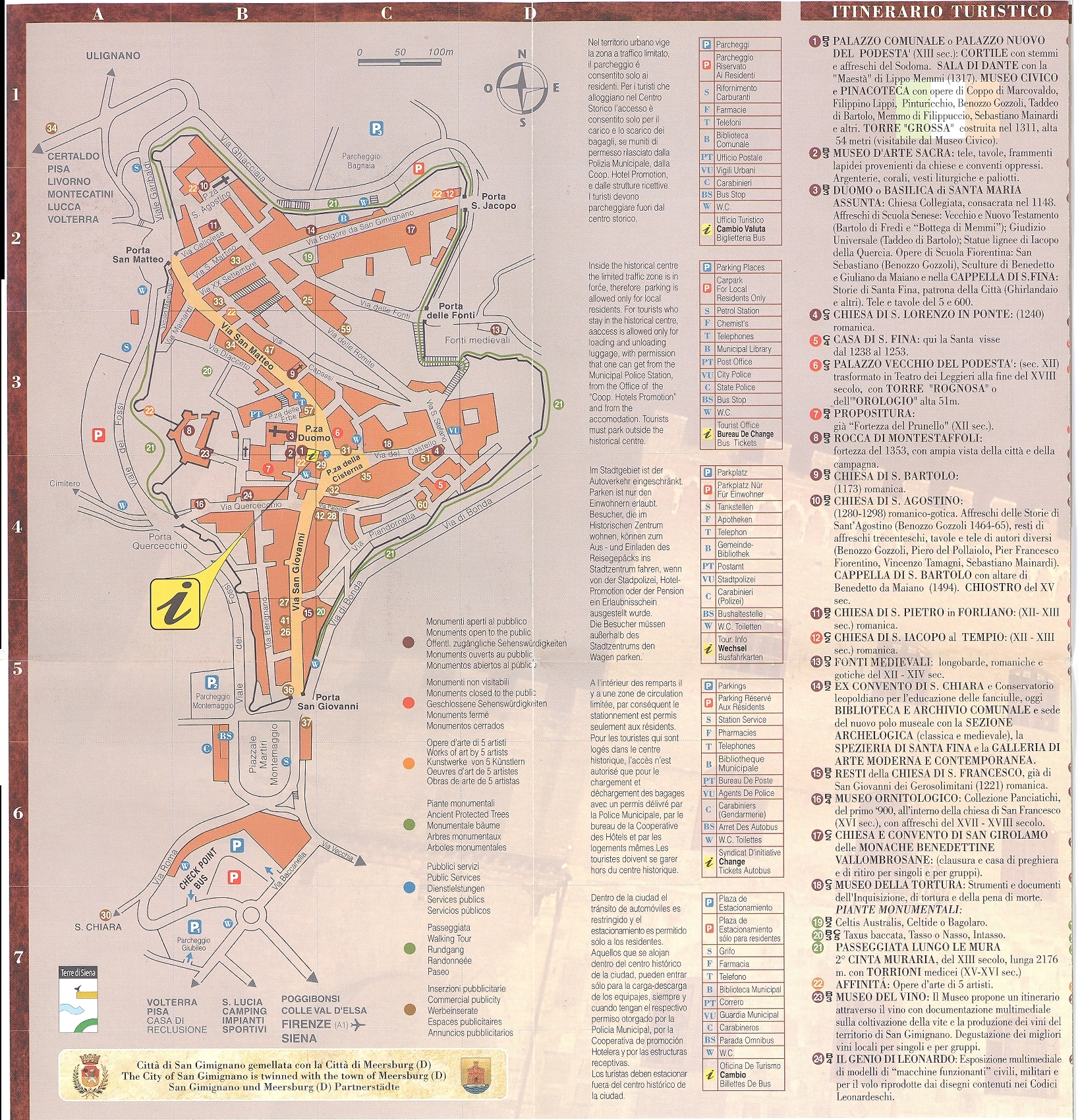 Getting there: The nearest airports are in Pisa and Florence. The nearest railway station is Poggibonsi (13 km), then take a bus #130 to San Gimignano (4-5 euros). The town can be reached from Siena by bus #130 (5-8 euros, 1.5 hours). Look here for map and schedule of bus routes in the Siena region. From Florence (bus station near the railway station) you can also go by bus (1.5 hours, 7-8 euros) which runs every hour. You may need to change in Poggibonsi. So, leave your bus and in 10-30 minutes take a bus #130 to San Gimignano.