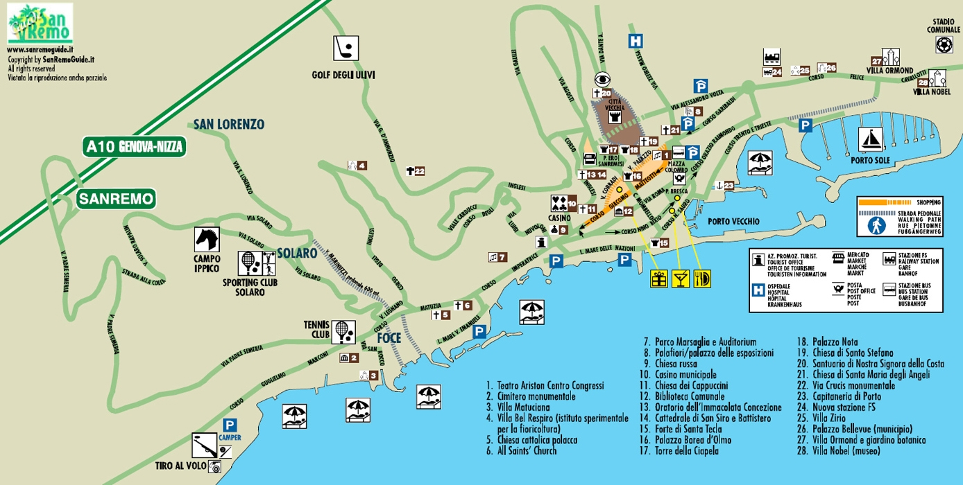 Getting there: The nearest airports are in Genoa (137 km) and Nice (50 km). From both airports, better take a bus to the railway stations and then go by train to San Remo. There are also direct buses that stop in Arma di Taggia, near San Remo. Buses in the city come to Piazza Colombo. Schedule of some bus routes in the area of ??the city can be found here. And here's another good website with a schedule of public trasport in the region of Liguria. Every hour trains from Genoa, Turin and Ventimiglia go to San Remo.
