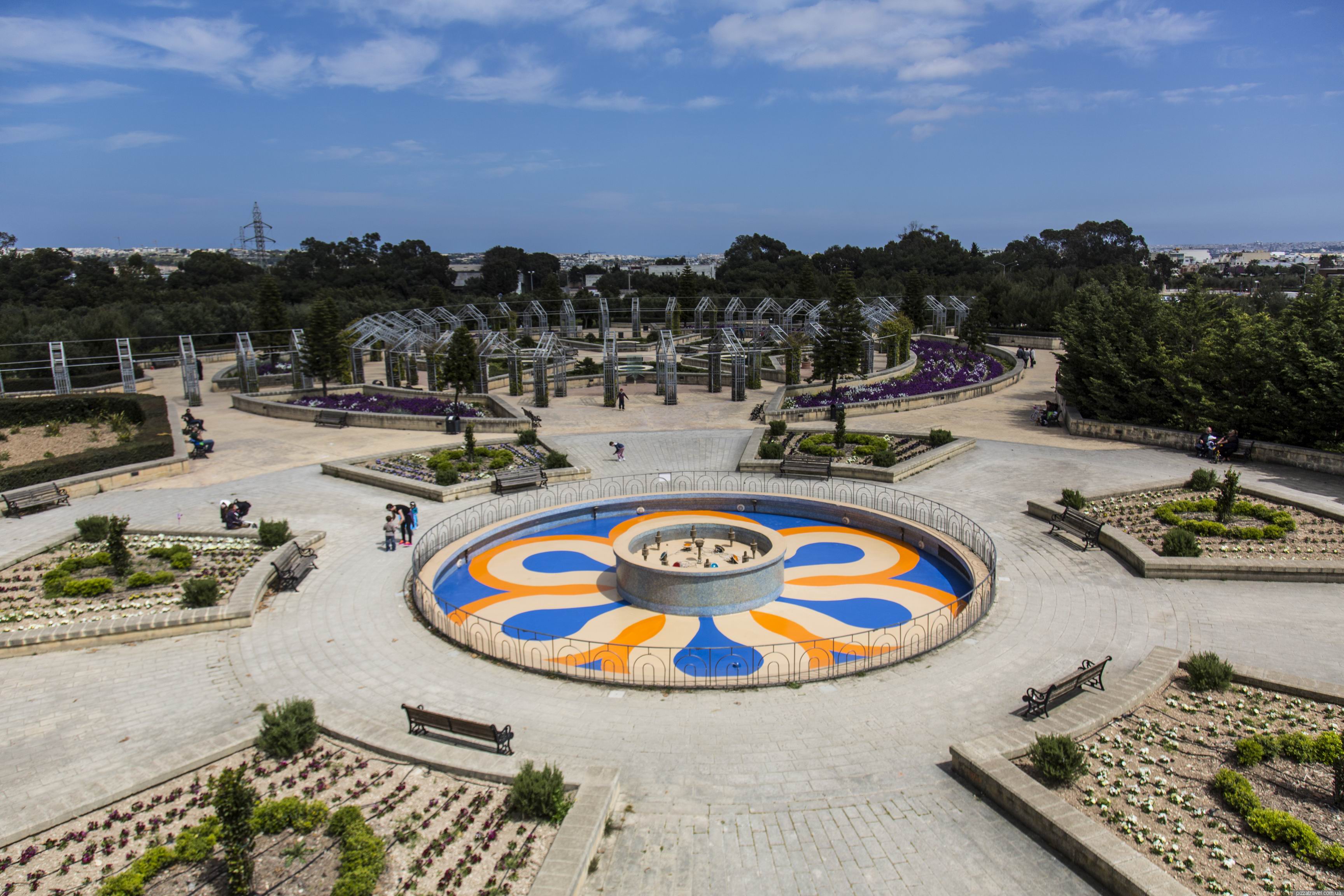 Nowadays park is mostly used as a picnic area. We visited it on Sunday and saw a huge number of Maltese families with children. Here are many different unusual plants, flowers, many birds, everything is very well maintained. There is an arched gallery with a walkway on the top which offers the view of the pasr from above.