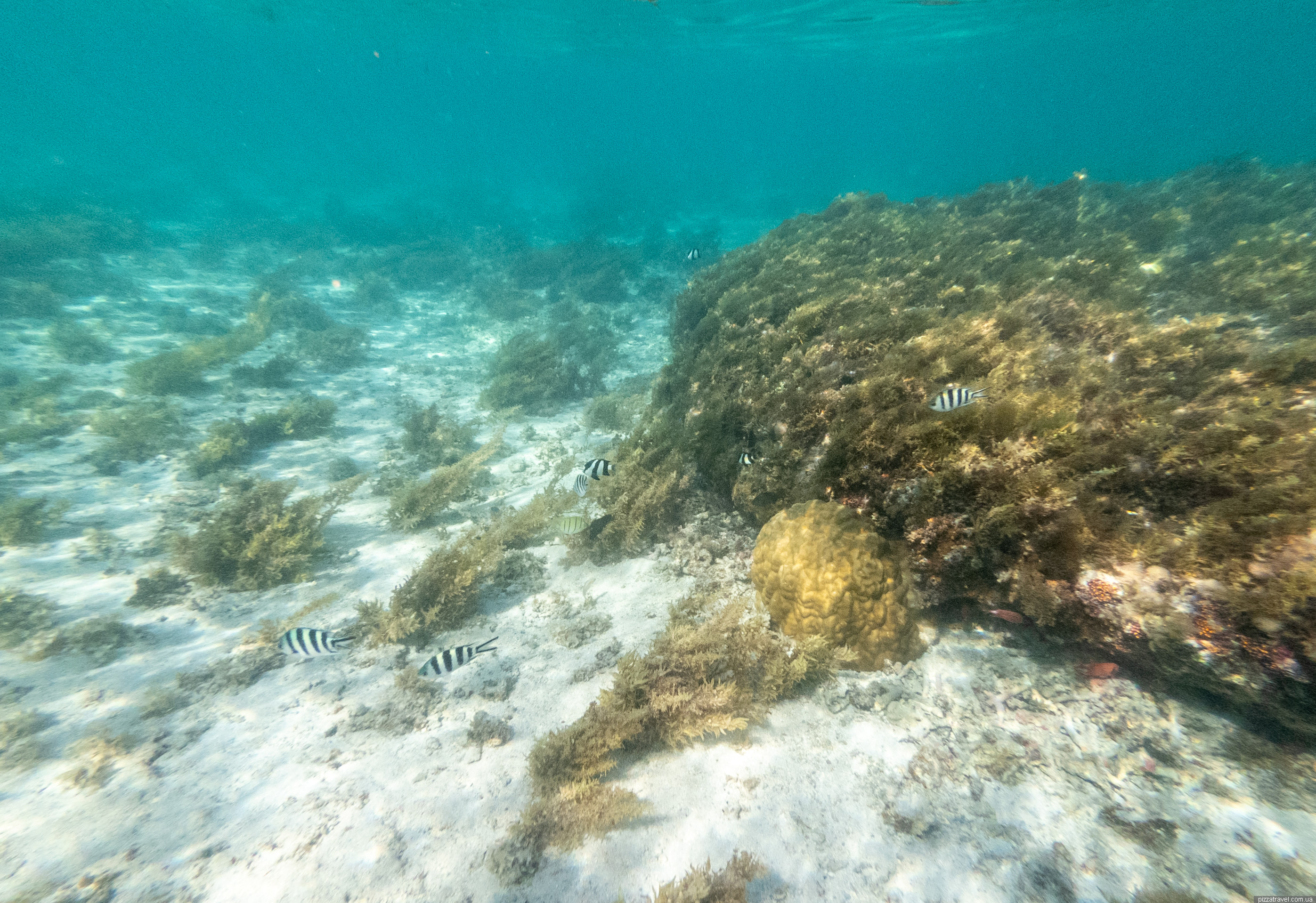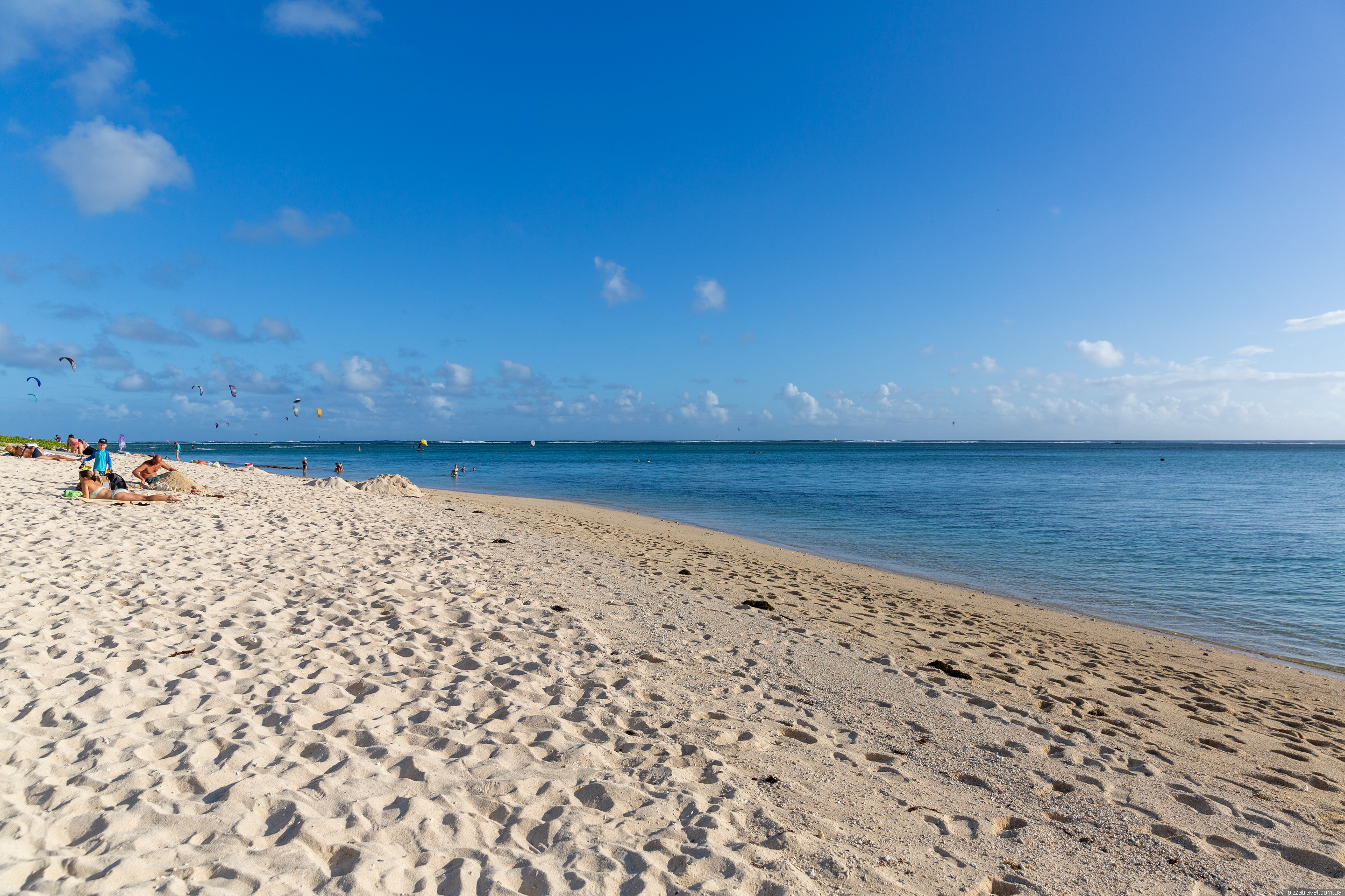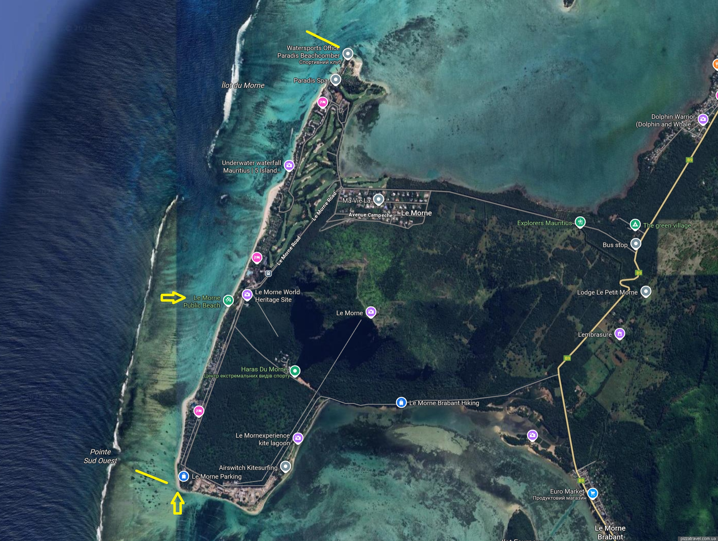 Practically the entire coastline is occupied by hotels, and there are two places where you can drive up to the beach. The main car park, in the centre, is at -20.452083, 57.313750, and the car park for windsurfers, in the south, is at -20.465472, 57.308944. We swam at the second location, here -20.464583, 57.308389, as it was easy for us to walk there from the hotel.