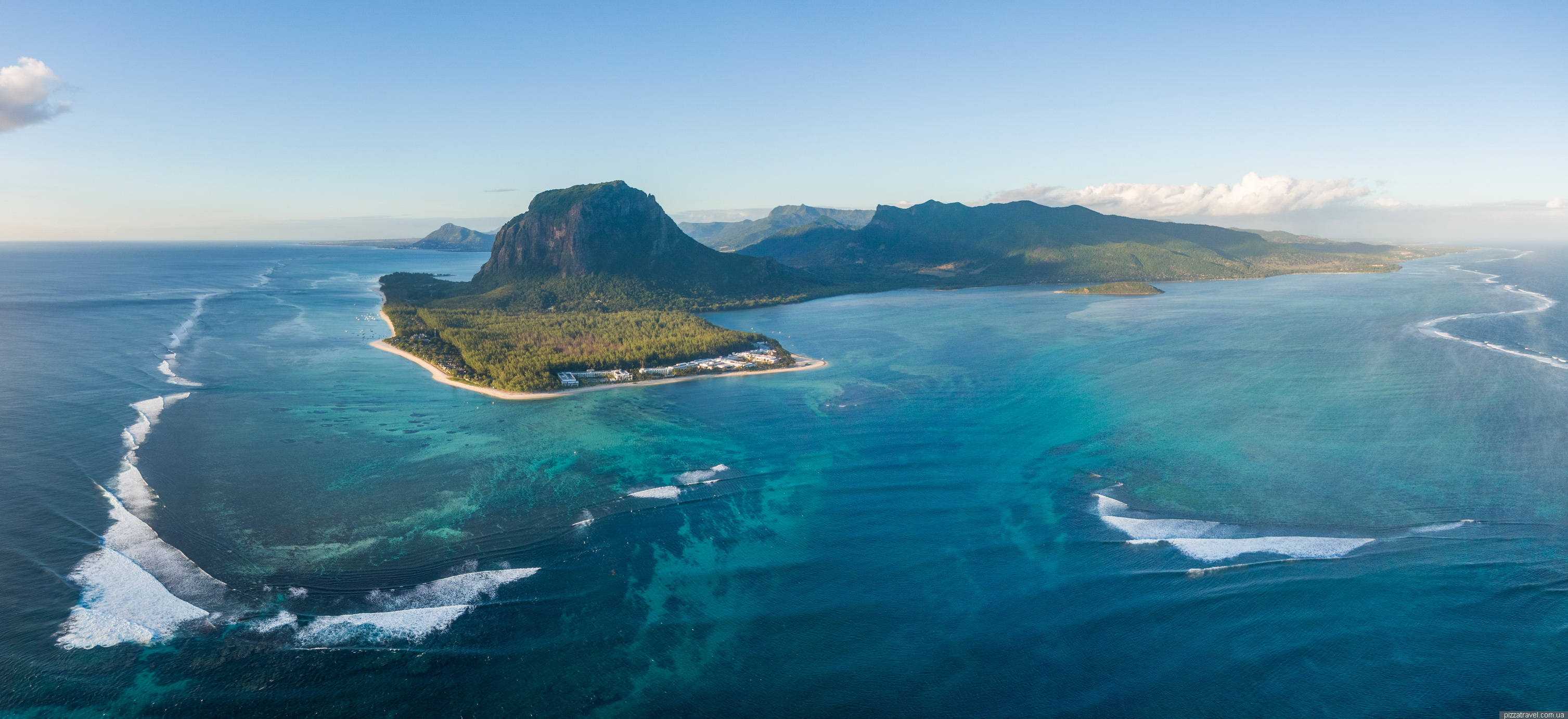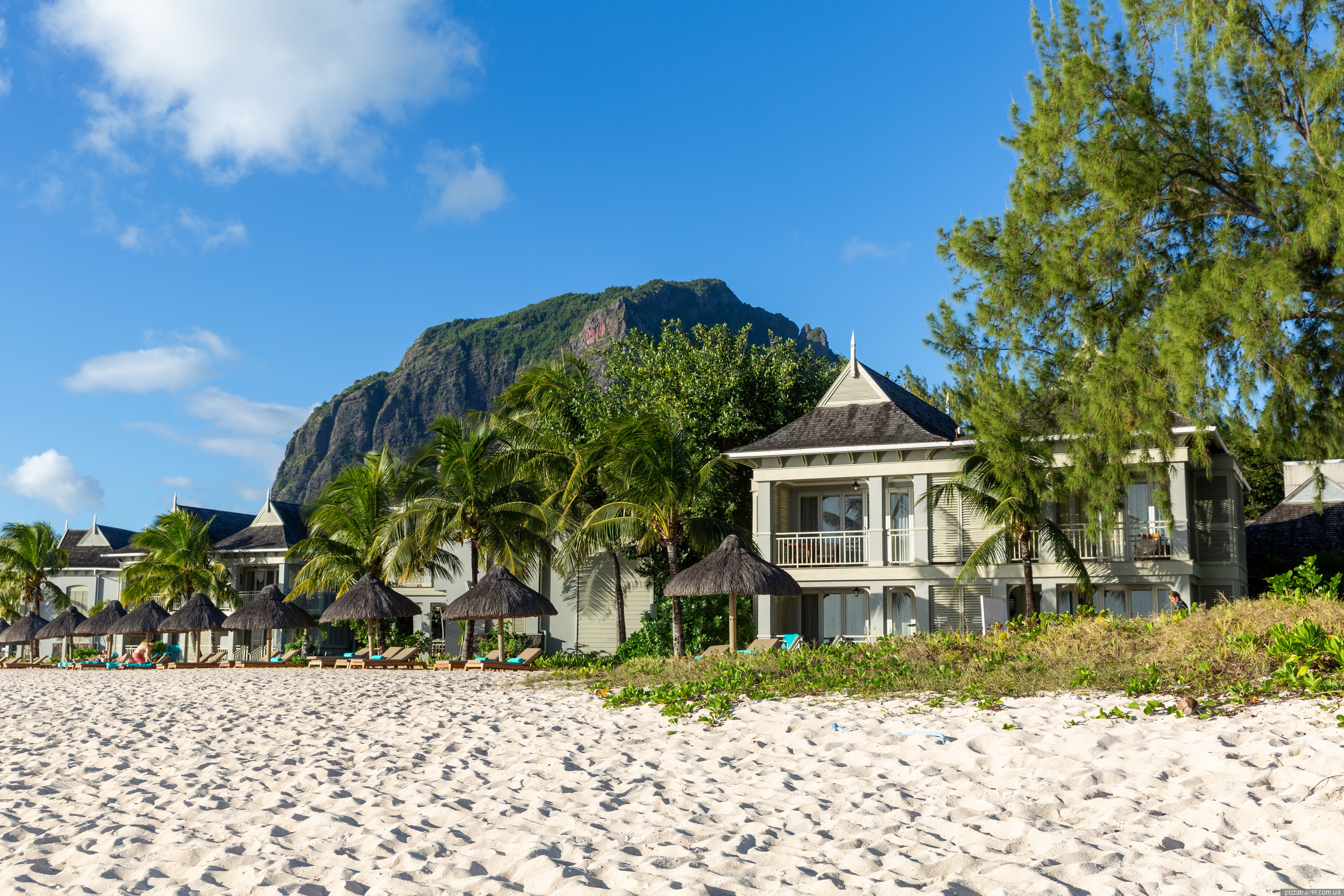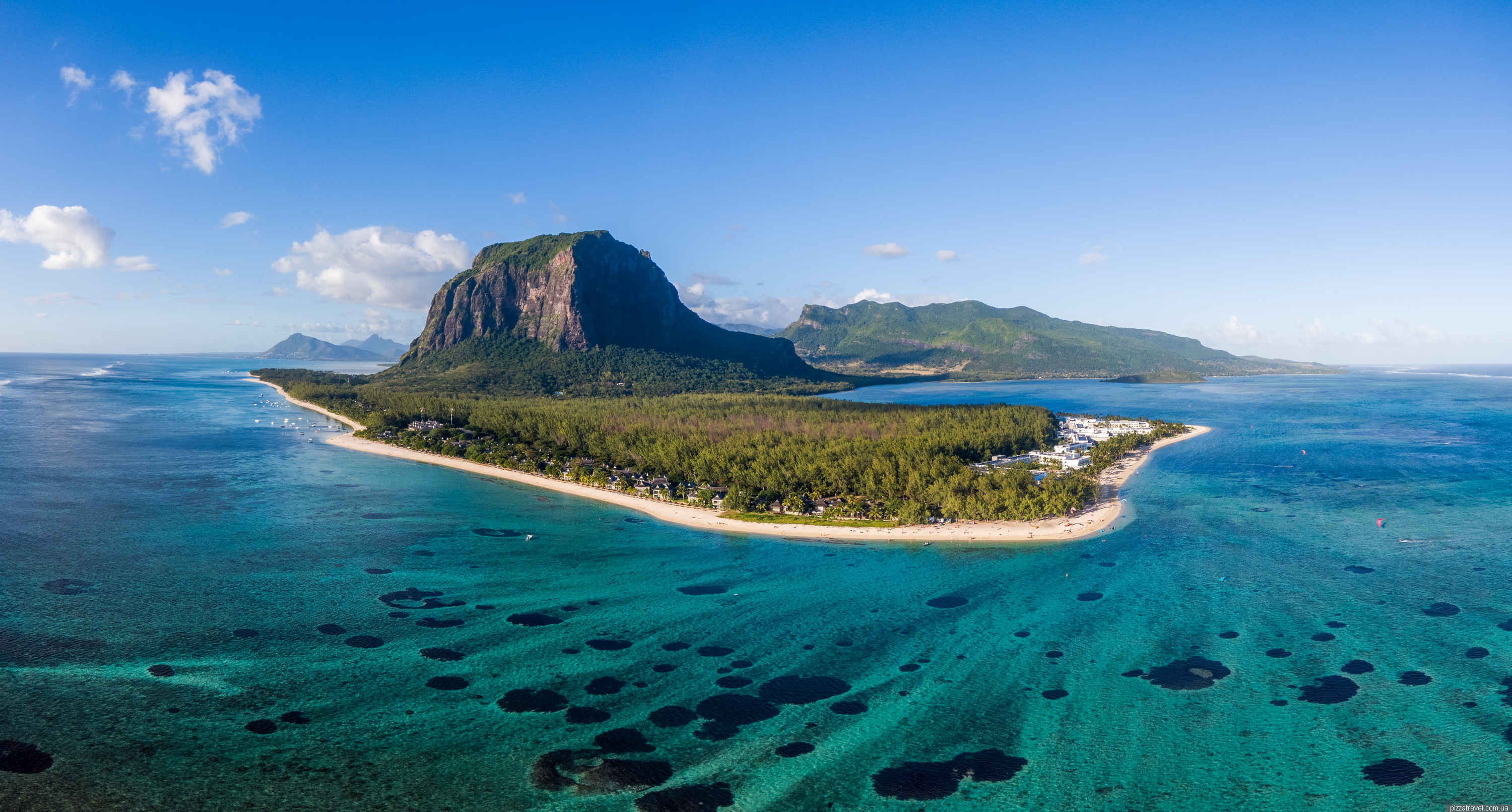 Practically the entire coastline is occupied by hotels, and there are two places where you can drive up to the beach. The main car park, in the centre, is at -20.452083, 57.313750, and the car park for windsurfers, in the south, is at -20.465472, 57.308944. We swam at the second location, here -20.464583, 57.308389, as it was easy for us to walk there from the hotel.
