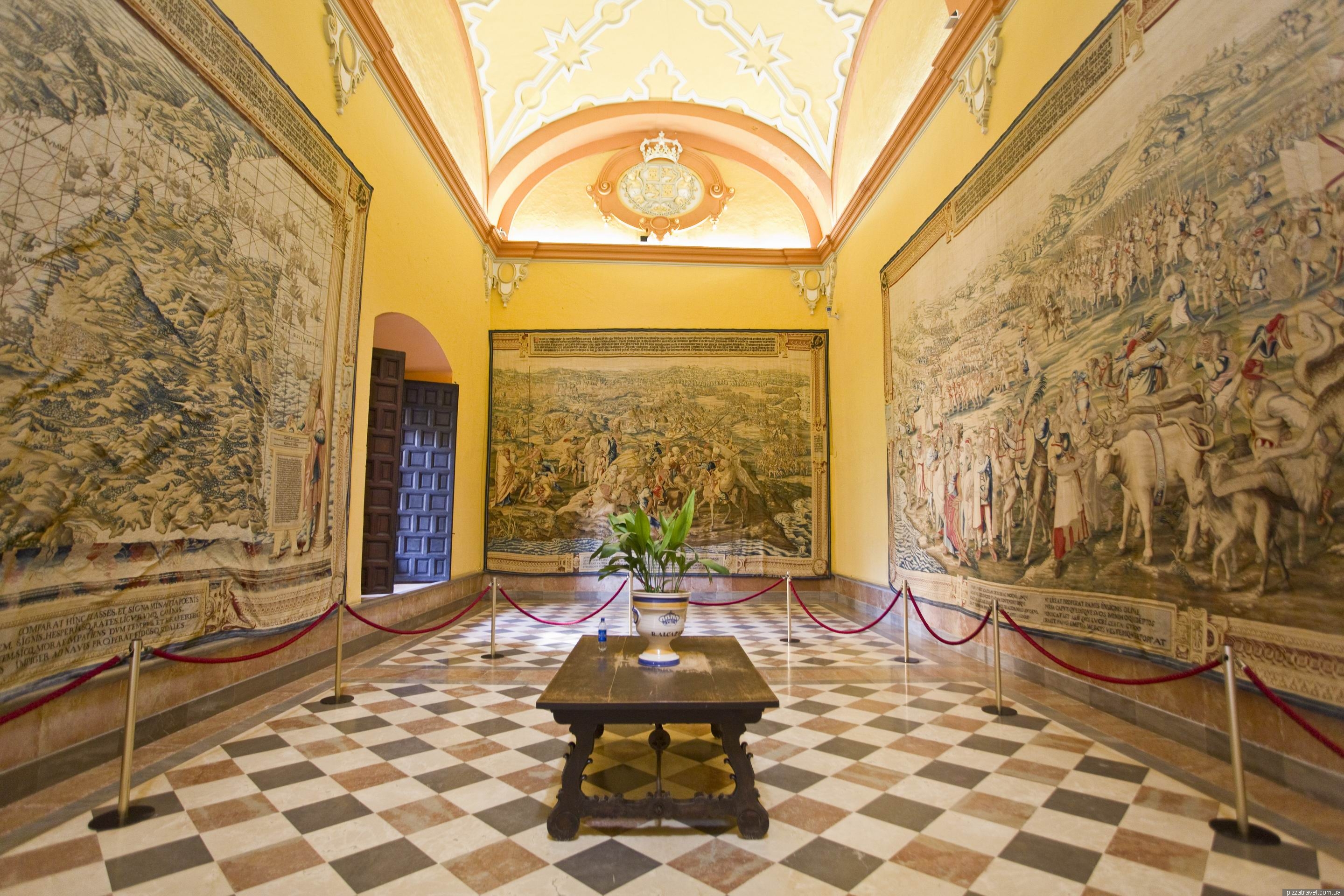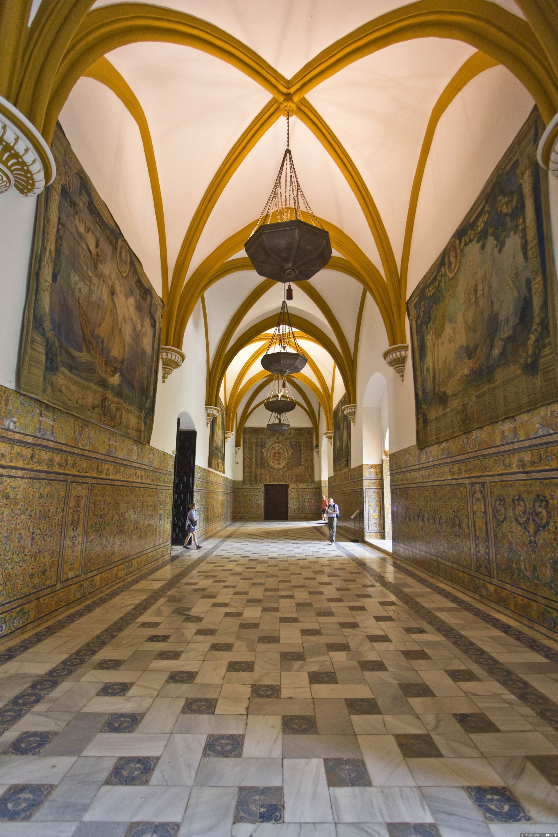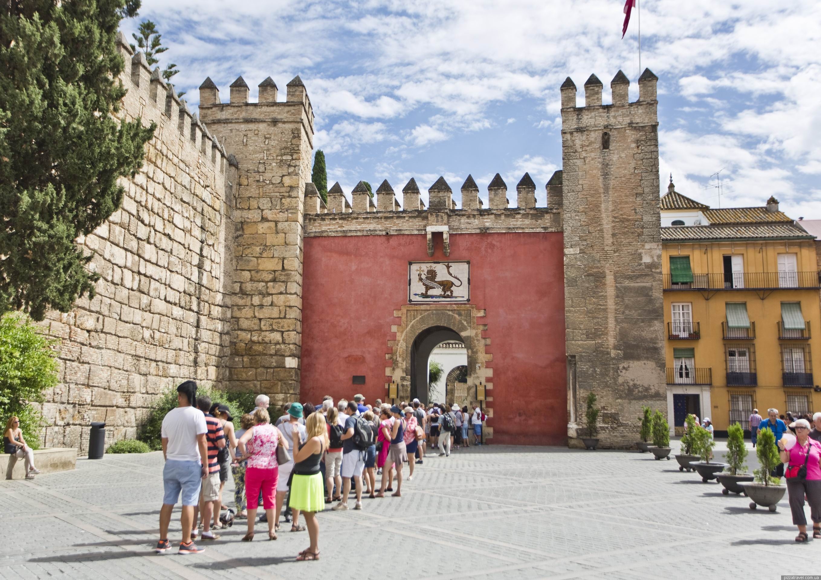 In 20 meters from the cathedral is the entrance to the Royal Alcazar, a former Moorish palace. Read about the Moors in the general article about Spain. The upper chambers of the Alcázar are now used as the official residence of the Spanish royal family. The place is popular with tourists, so we bought tickets in advance online here.