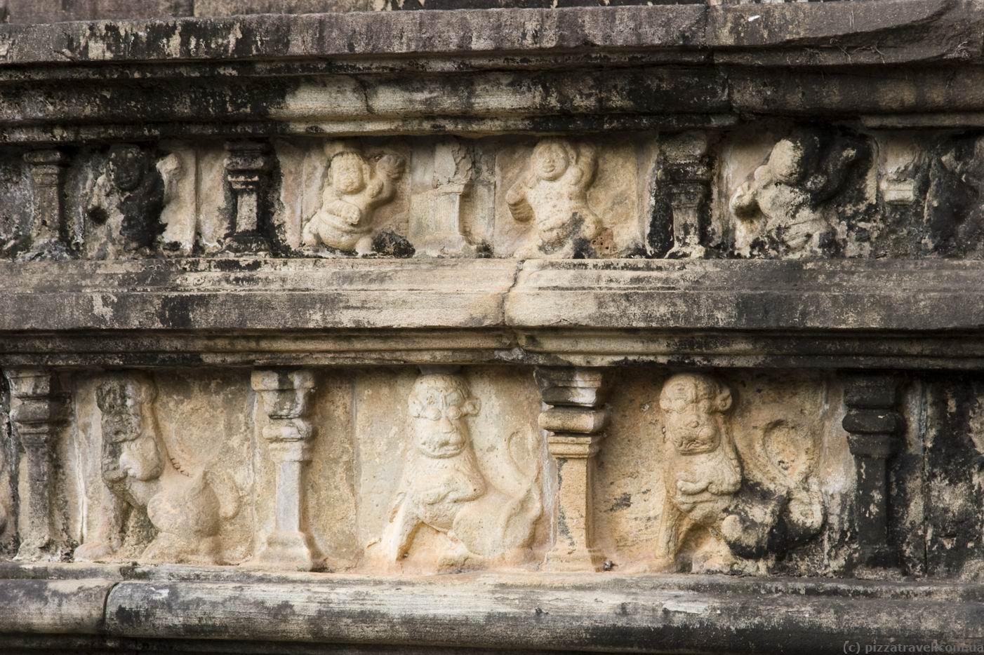 Along the perimeter of the ancient King's Council Chamber (audience hall) of King Parakramabahu I different elephants are depicted. Entrance to the hall is very picturesque with sculptures of elephants, dragons and a moonstone.