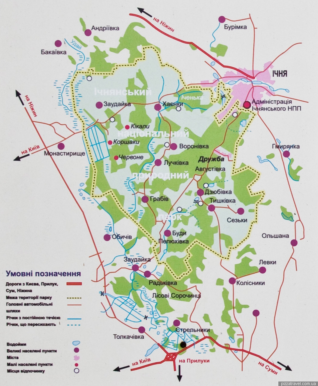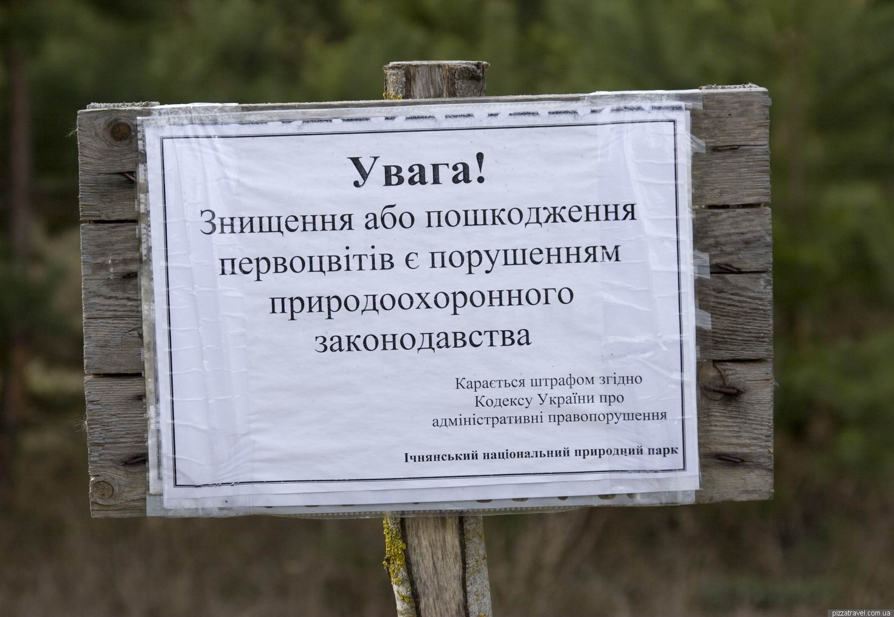 Як дістатися: Їхати потрібно на автомобілі. Без нього, я не уявляю, що ви будете там робити. Хіба що візьмете велосипеди на прокат в центральному офісі парку (він позначений на карті внизу). Туди можна зателефонувати і домовитися про екскурсію, я б радив зробити саме так, тим більше це не дорого. Просто ділянки лісу розкидані то там, то тут, і навіть знайти ділянки з первоцвітами буде не так просто. В Ічні є залізнична станція, розташована між Прилуками та Бахмачем, однак радити цей вид транспорту ми не можемо. Хіба що у вас пряме сполучення, без пересадок. З Києва є прямі автобуси, але ходять невдало, так що на один день з'їздити не вийде (розклад), а де там ночувати, крім як у наметі - не зрозуміло. Так що їхати потрібно на автомобілі, в такому випадку можна влаштувати денний виїзд на природу з Києва. Дорога (не дуже гарна) в одну сторону займе 2.5 - 3 години.