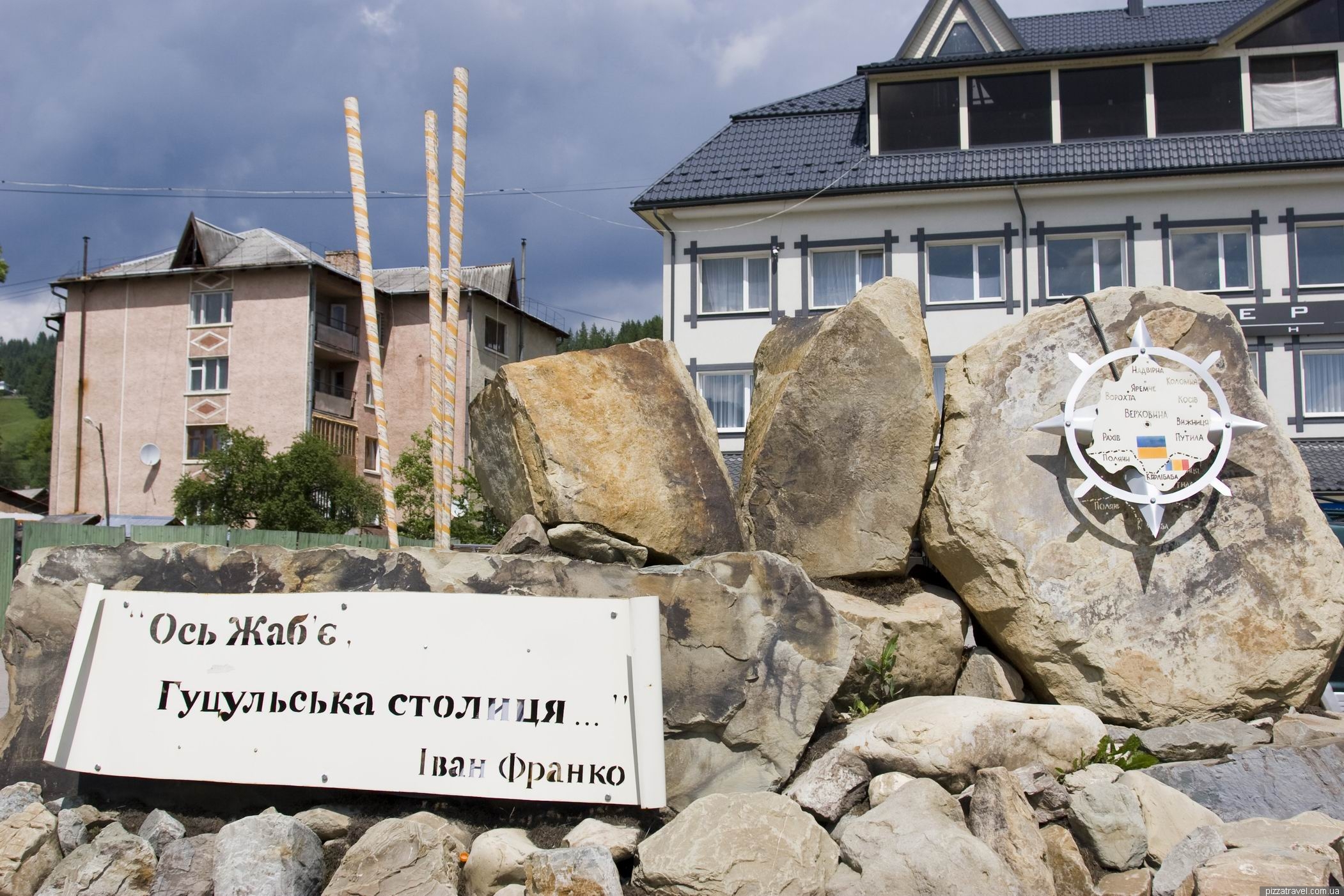 У центрі селища, біля готелю, є дивний напис. Насправді нічого тут дивного немає, Жаб'є - колишня назва селища до 1962 року.