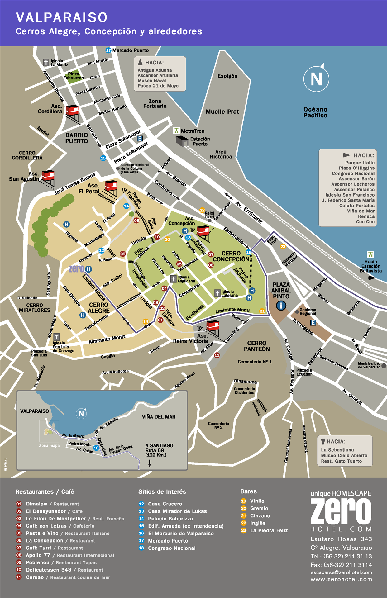 На цій карті кольором виділена історична частина міста. Це два пагорби: Cerro Alegre і Cerro Concepción.