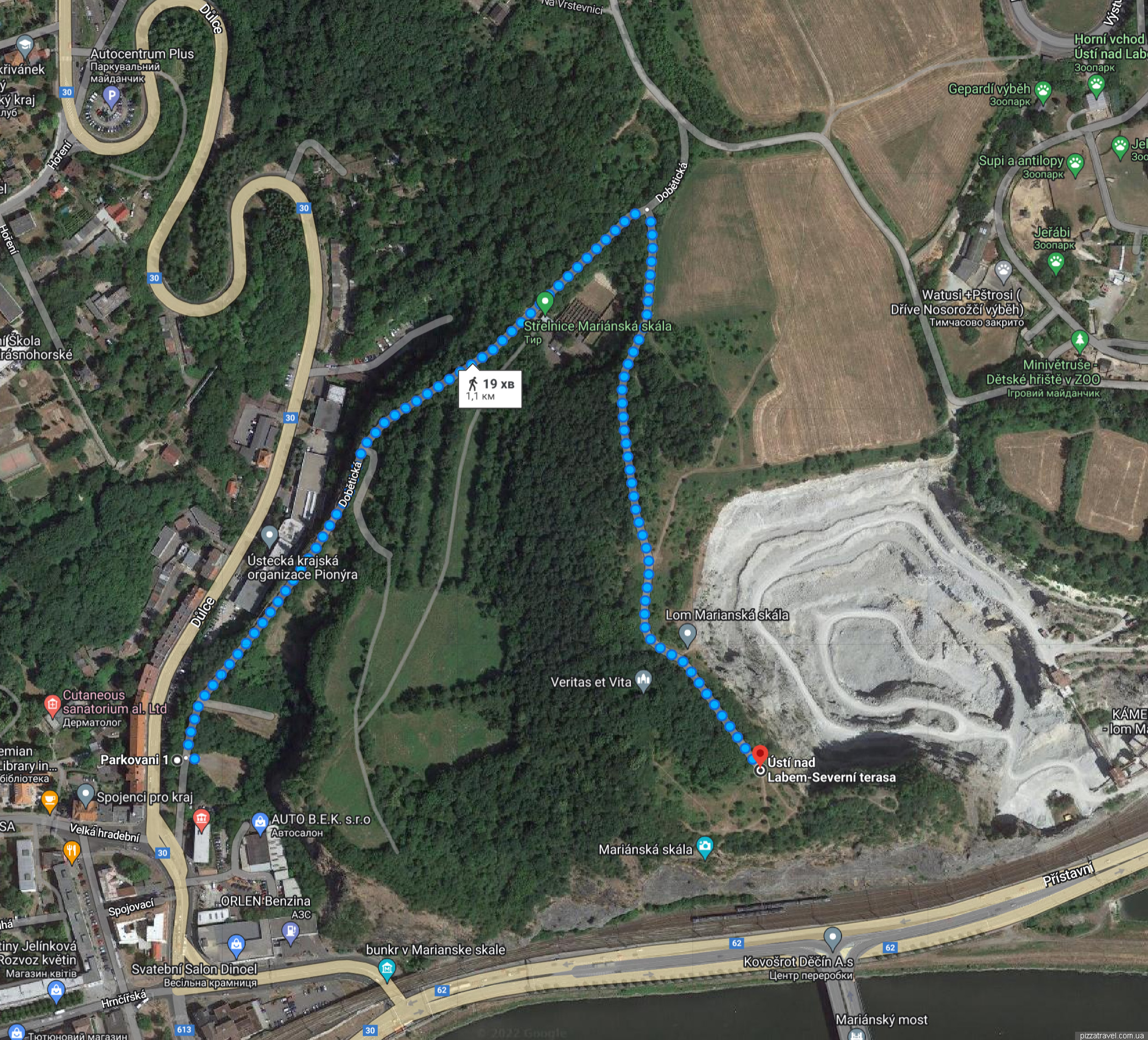 З готелю ми побачили велику скелю за річкою (Mariánská skála) та вирішили побувати ще й там. Машину залишили тут 50.662542, 14.045797 і далі пішли пішки до самого урвища 50.662003, 14.051864. Йти приблизно 20 хвилин.