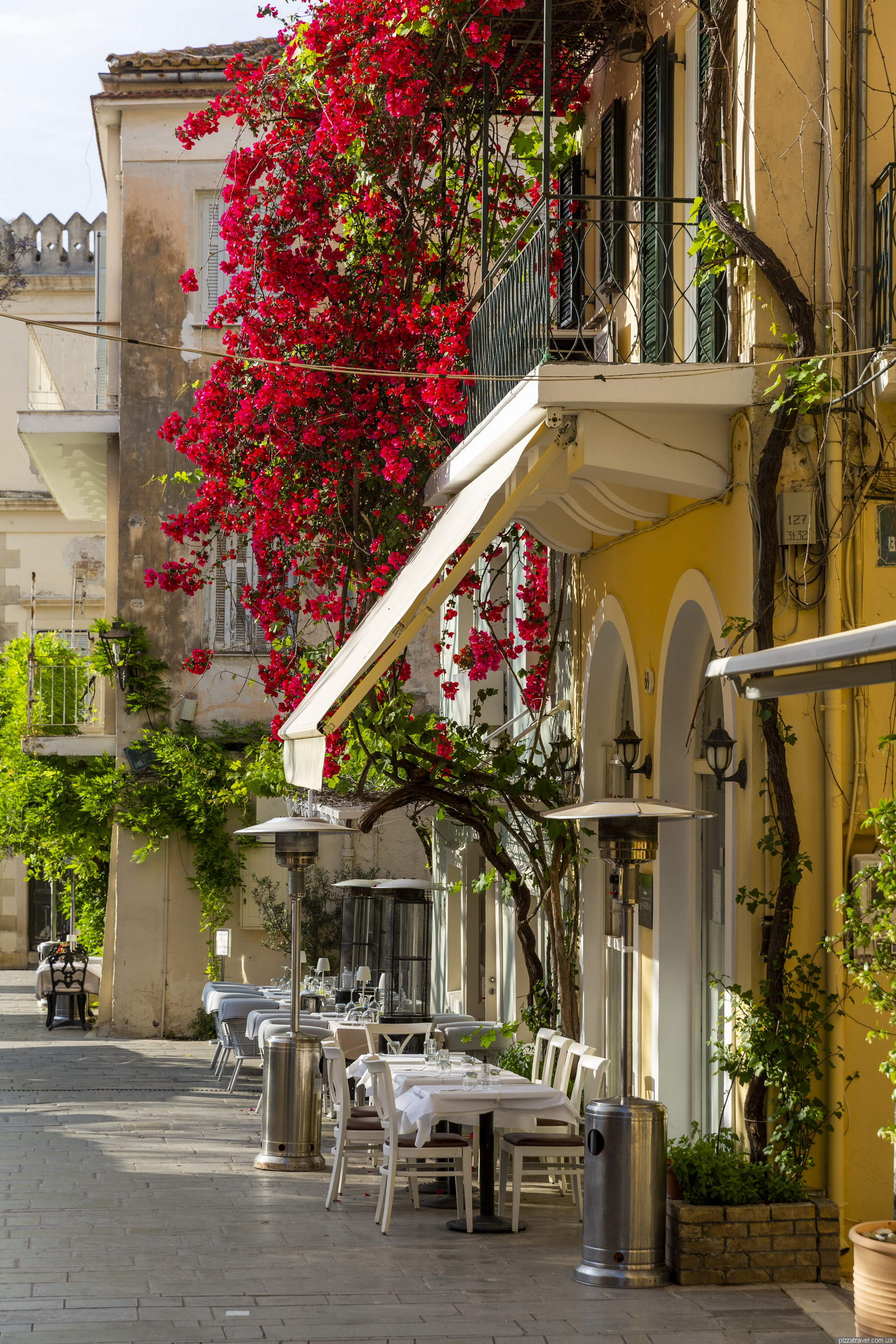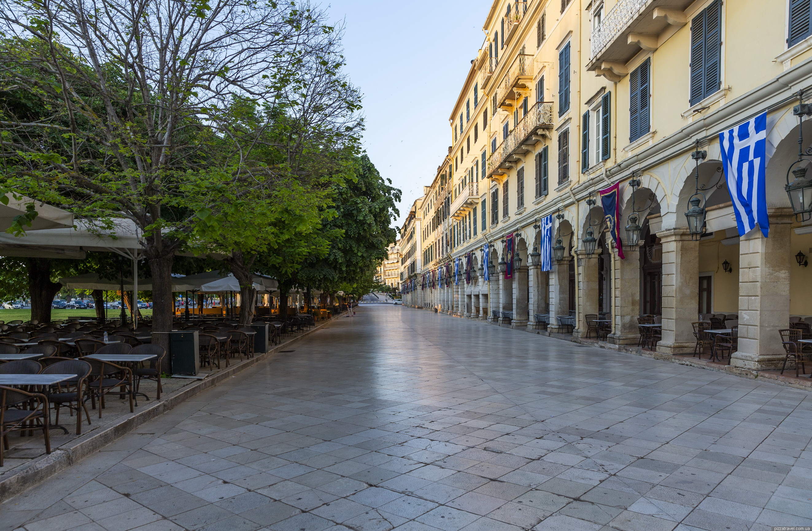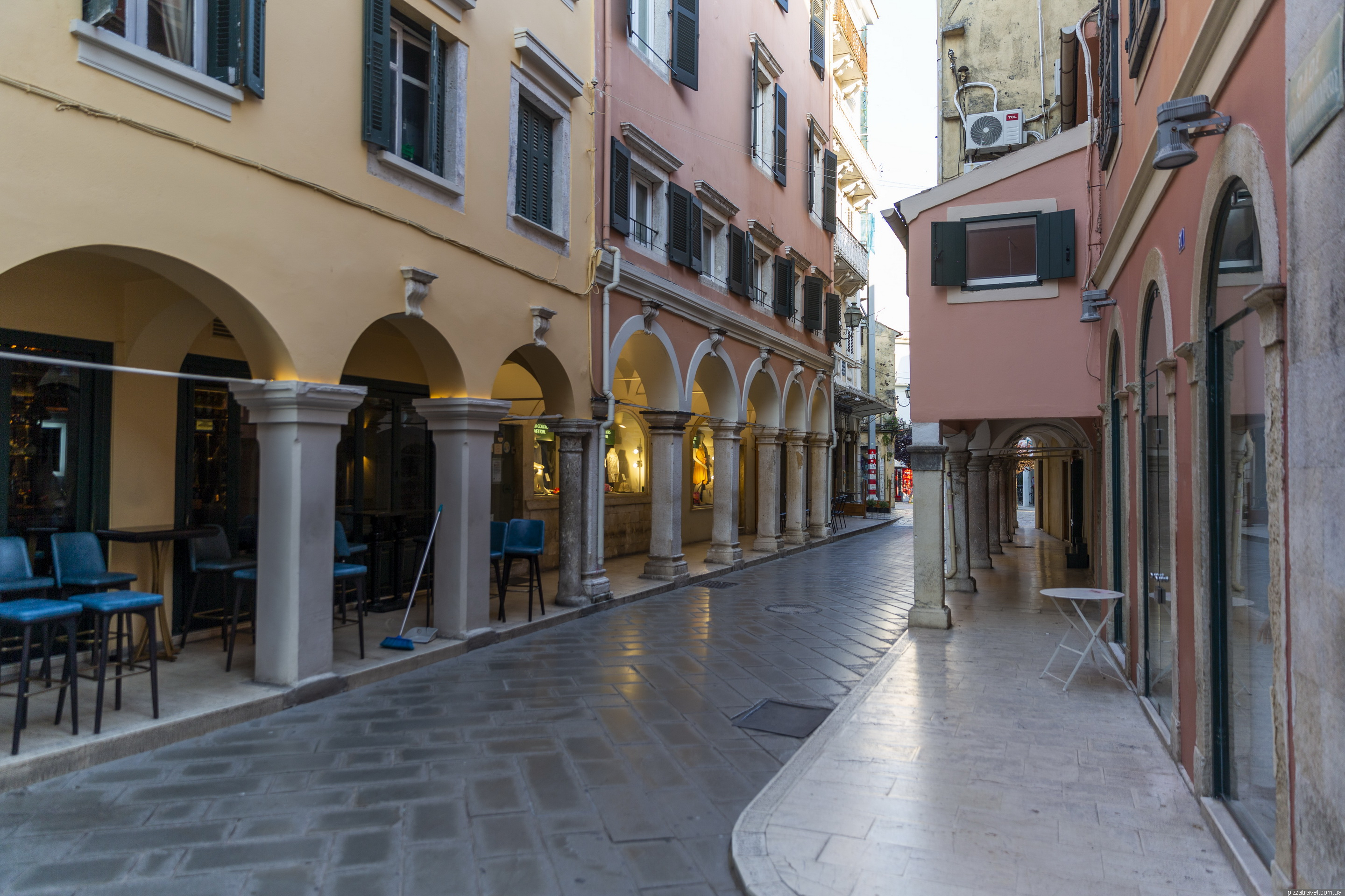 Потім погуляли старим містом. Деякі фотографії зняті рано вранці, тому на вулицях порожньо. Це ось самий центр і найвідоміша вулиця Liston - Eleftherias. Побудована вона була під час другої французької окупації в 1807-1814 роках, а за зразок було взято вулицю Ріволі в Парижі. Я порівняв, дійсно схоже.