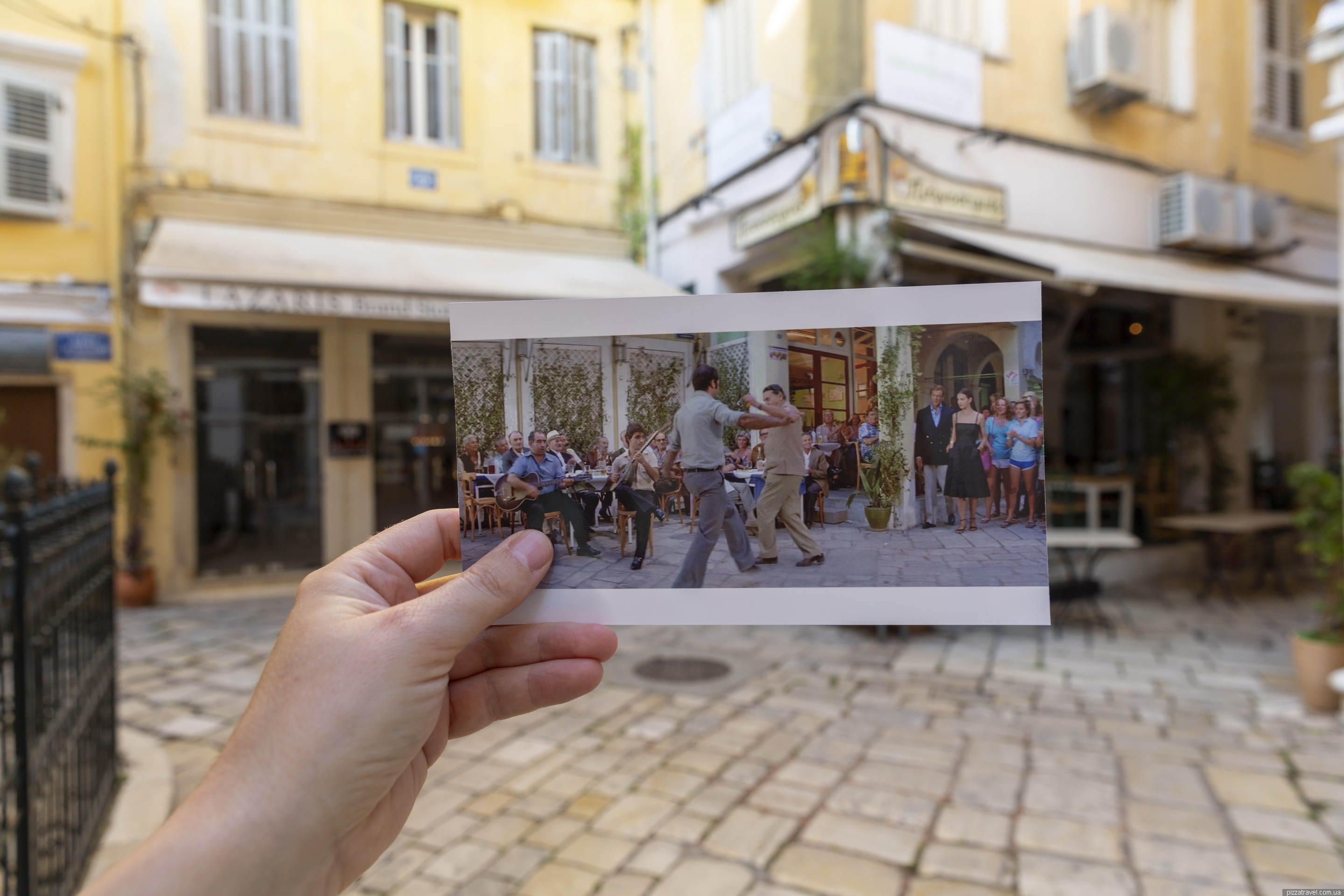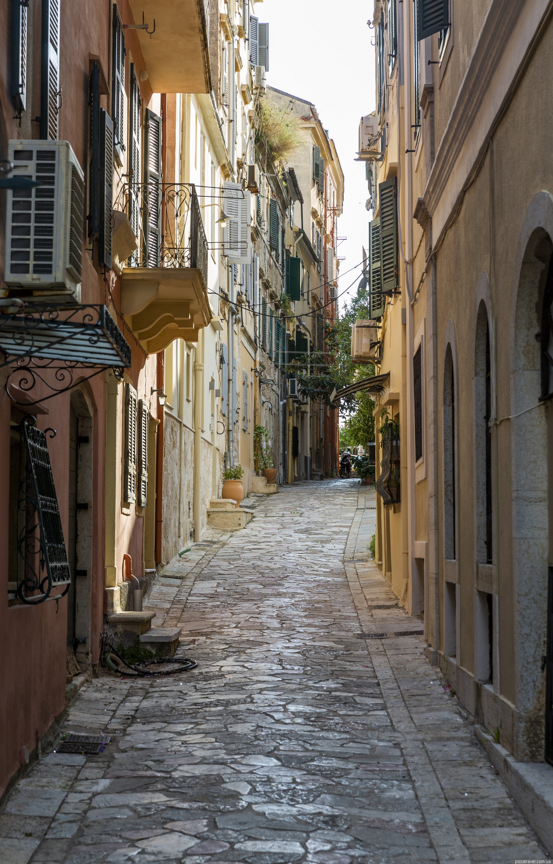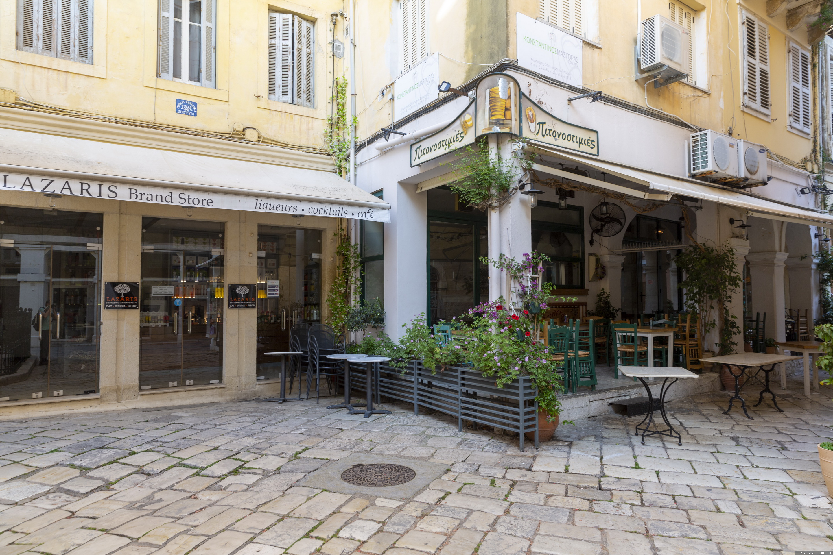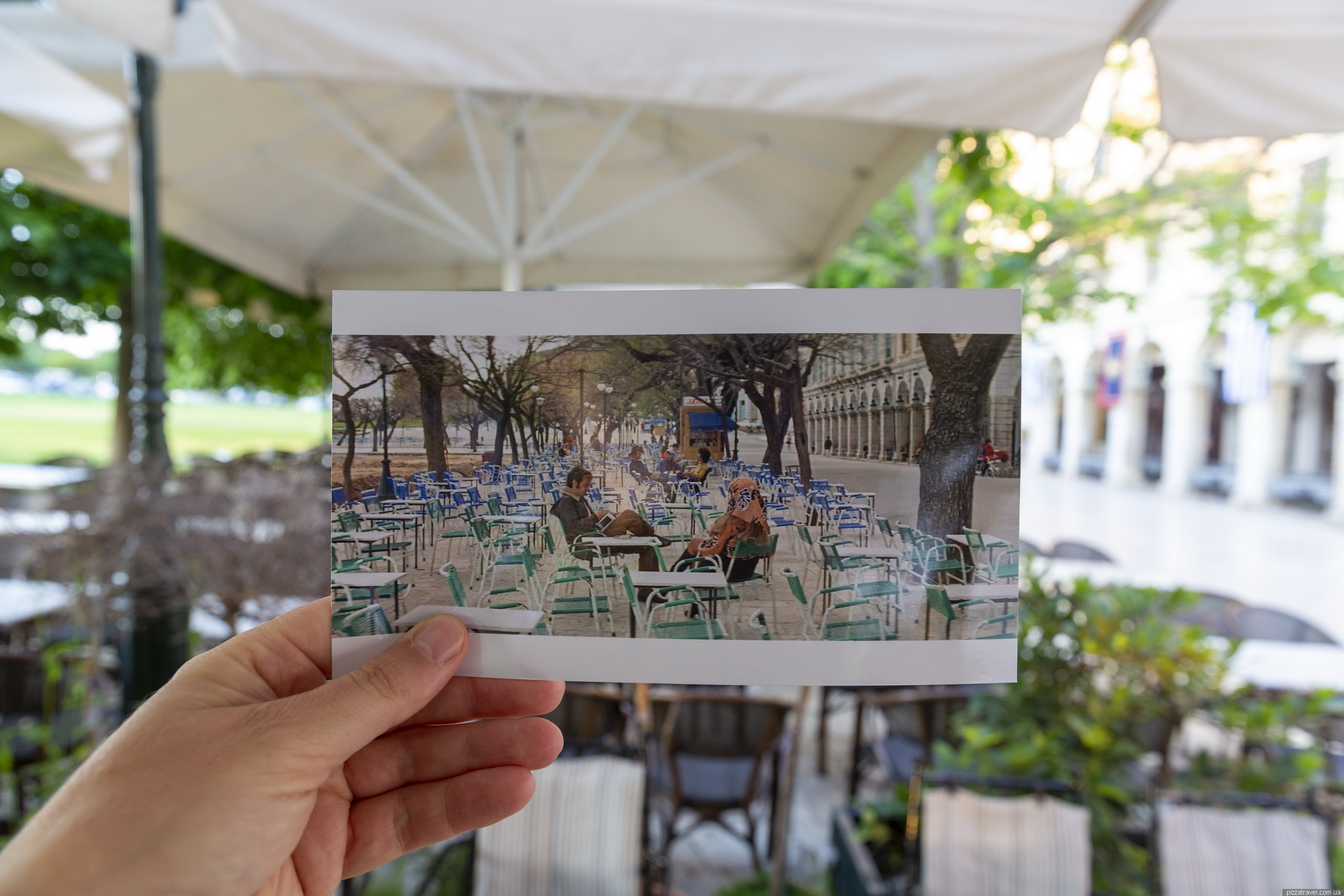 Потім погуляли старим містом. Деякі фотографії зняті рано вранці, тому на вулицях порожньо. Це ось самий центр і найвідоміша вулиця Liston - Eleftherias. Побудована вона була під час другої французької окупації в 1807-1814 роках, а за зразок було взято вулицю Ріволі в Парижі. Я порівняв, дійсно схоже.