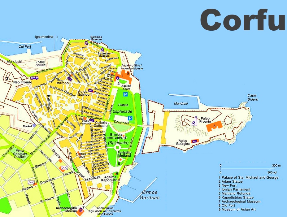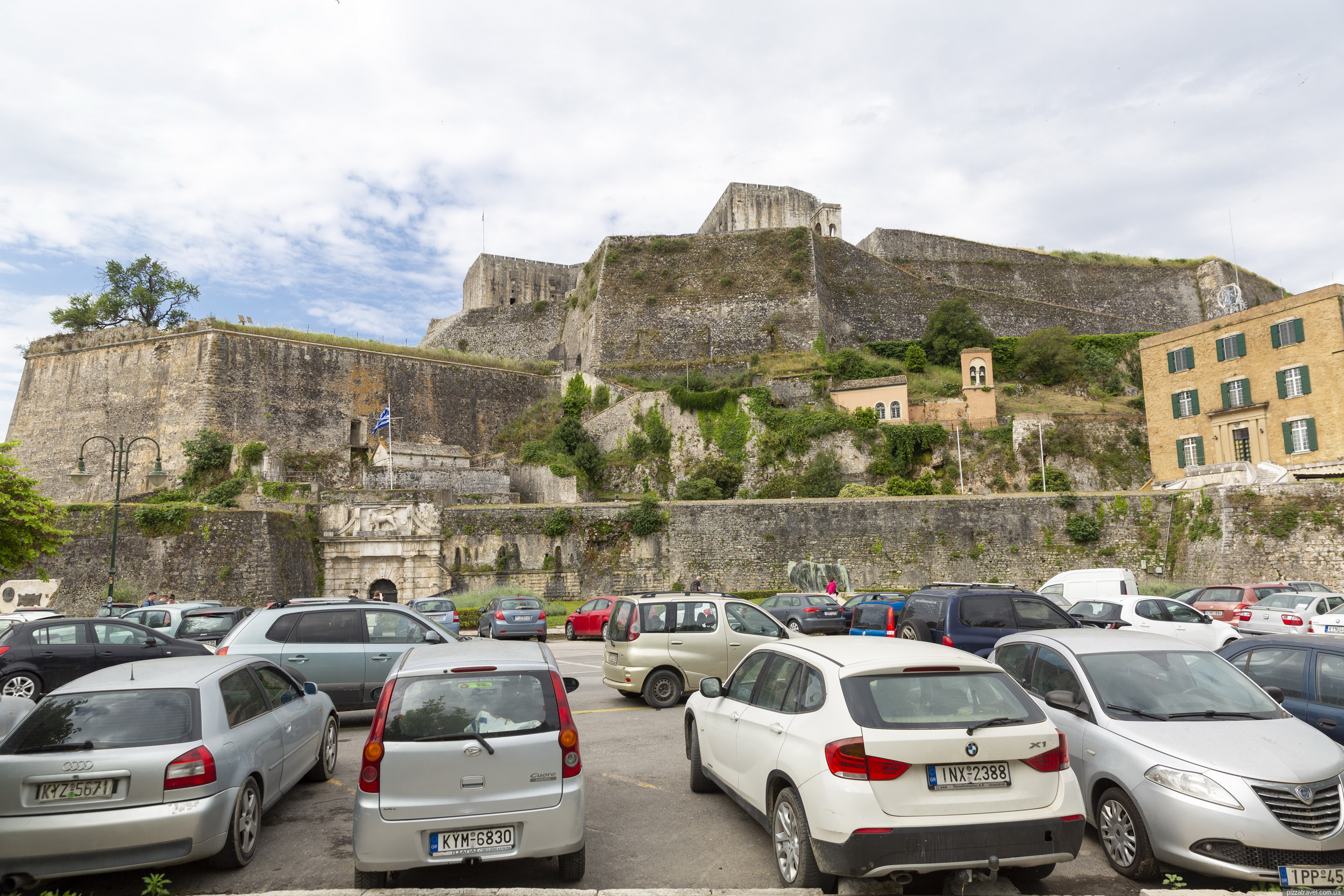 З паркуванням повне лихо, власне, більш жахливе місце для автомобіля у Європі важко знайти. Жодних підземних парковок немає, у центрі односторонній рух і всього одна парковка, на великій галявині 39.624861, 19.925139, вона ж центральна площа міста Спіанада ("Spianada" або "Esplanade"). Якщо промахнувся або немає місць, то крутишся ще 20 хвилин, навколо всього старого міста.