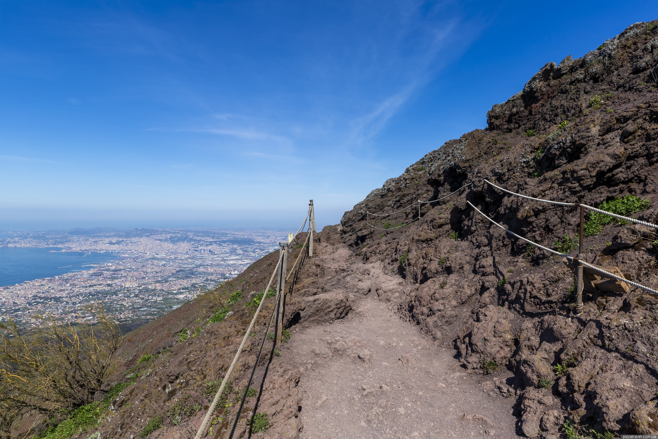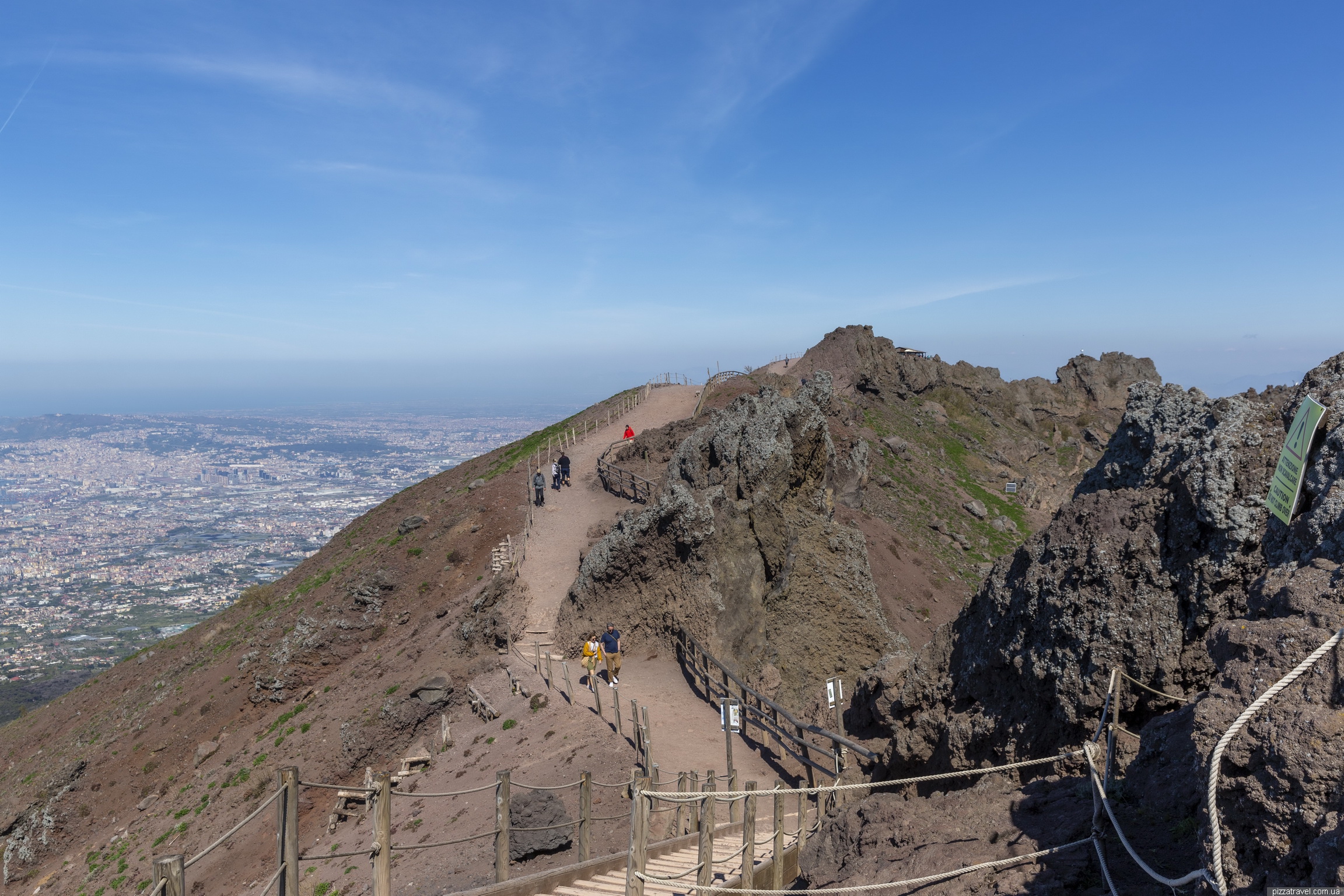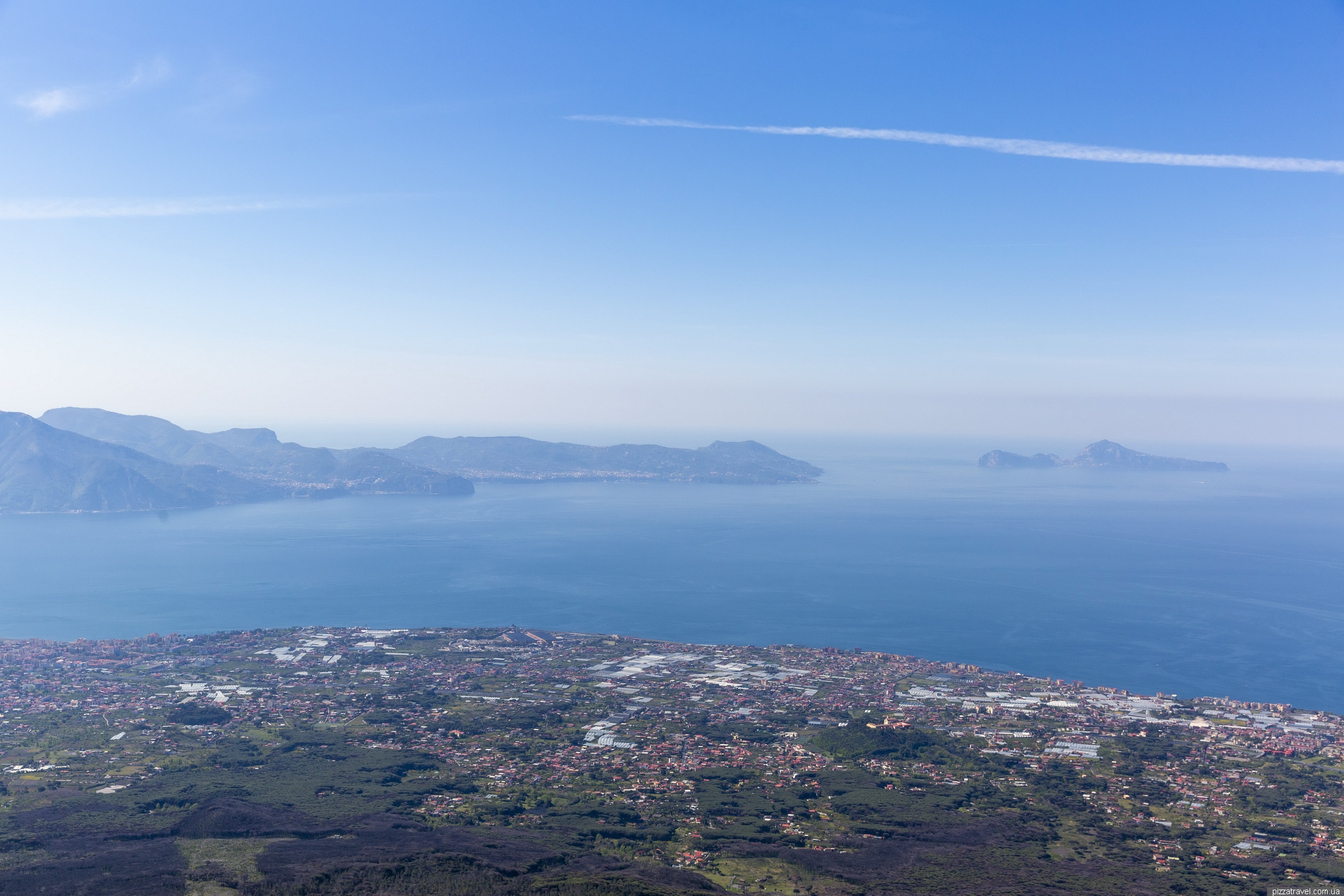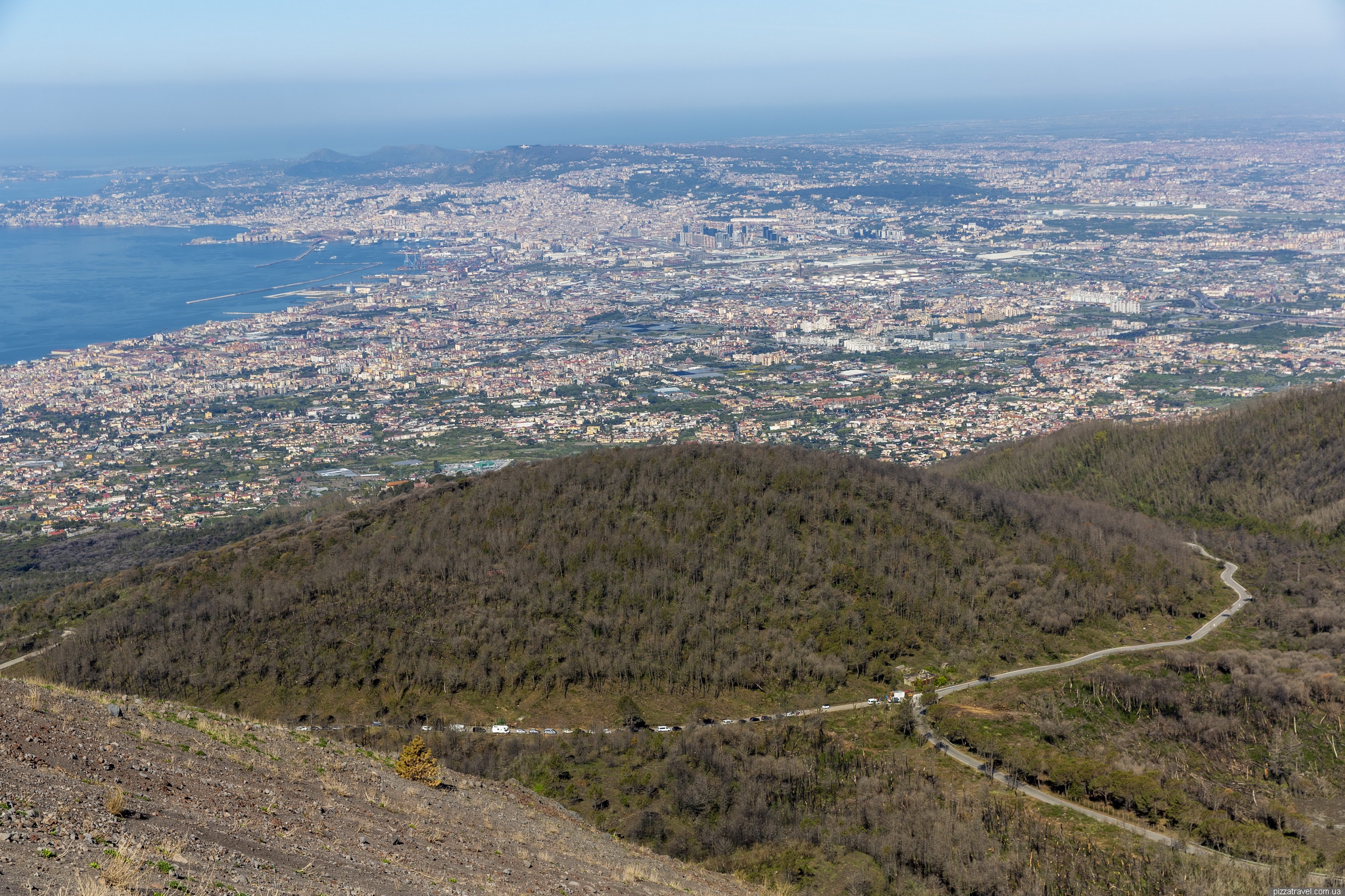 На цьому фото видно, де починається парковка до Везувію, ближче під'їхати на своєму транспорті не можна. На задньому плані Неаполь і супервулкан Флегрейські поля.