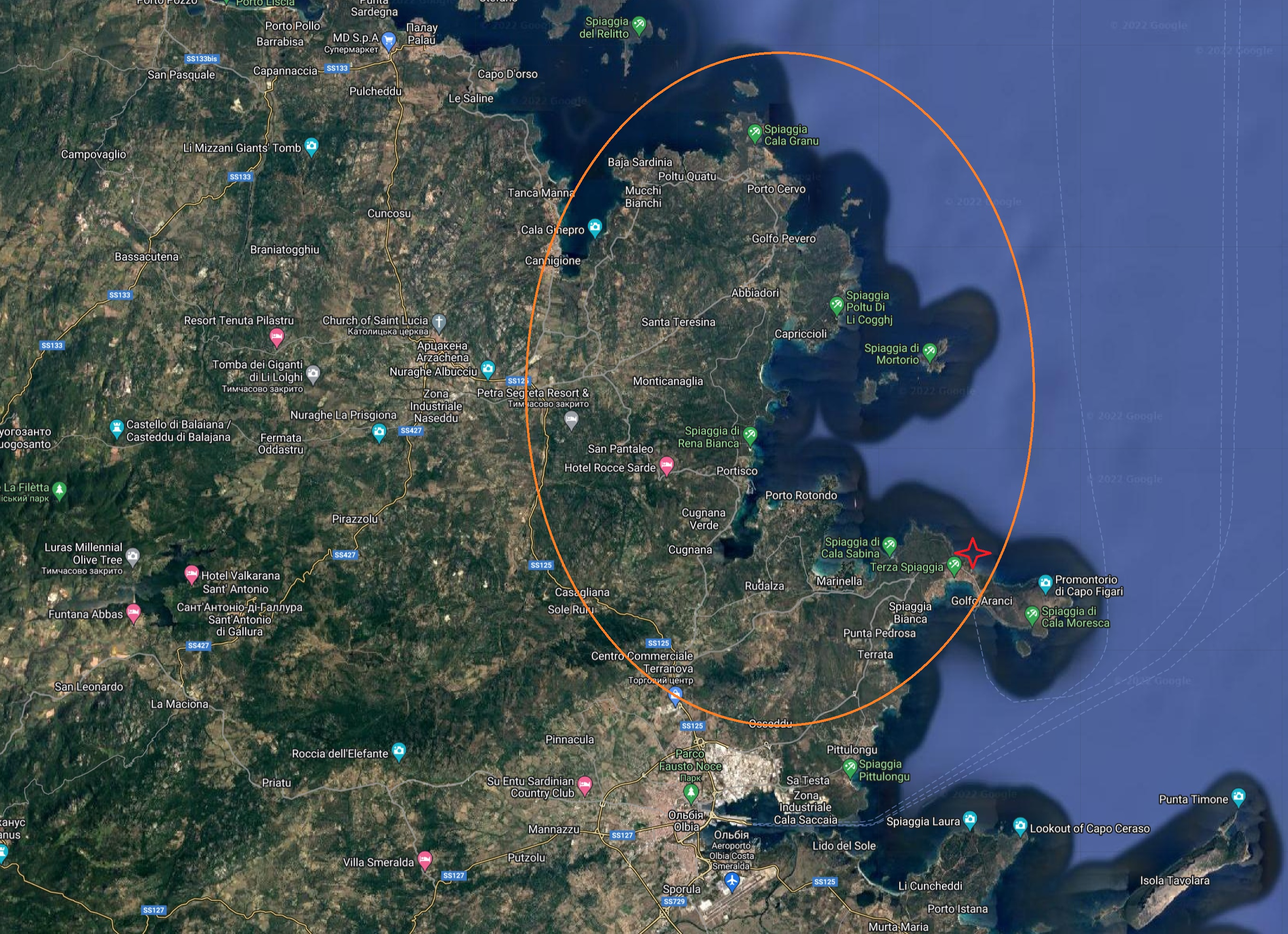 Ось, приблизно в цьому овалі, знаходиться узбережжя Costa Smeralda, відоме своїми пляжами.