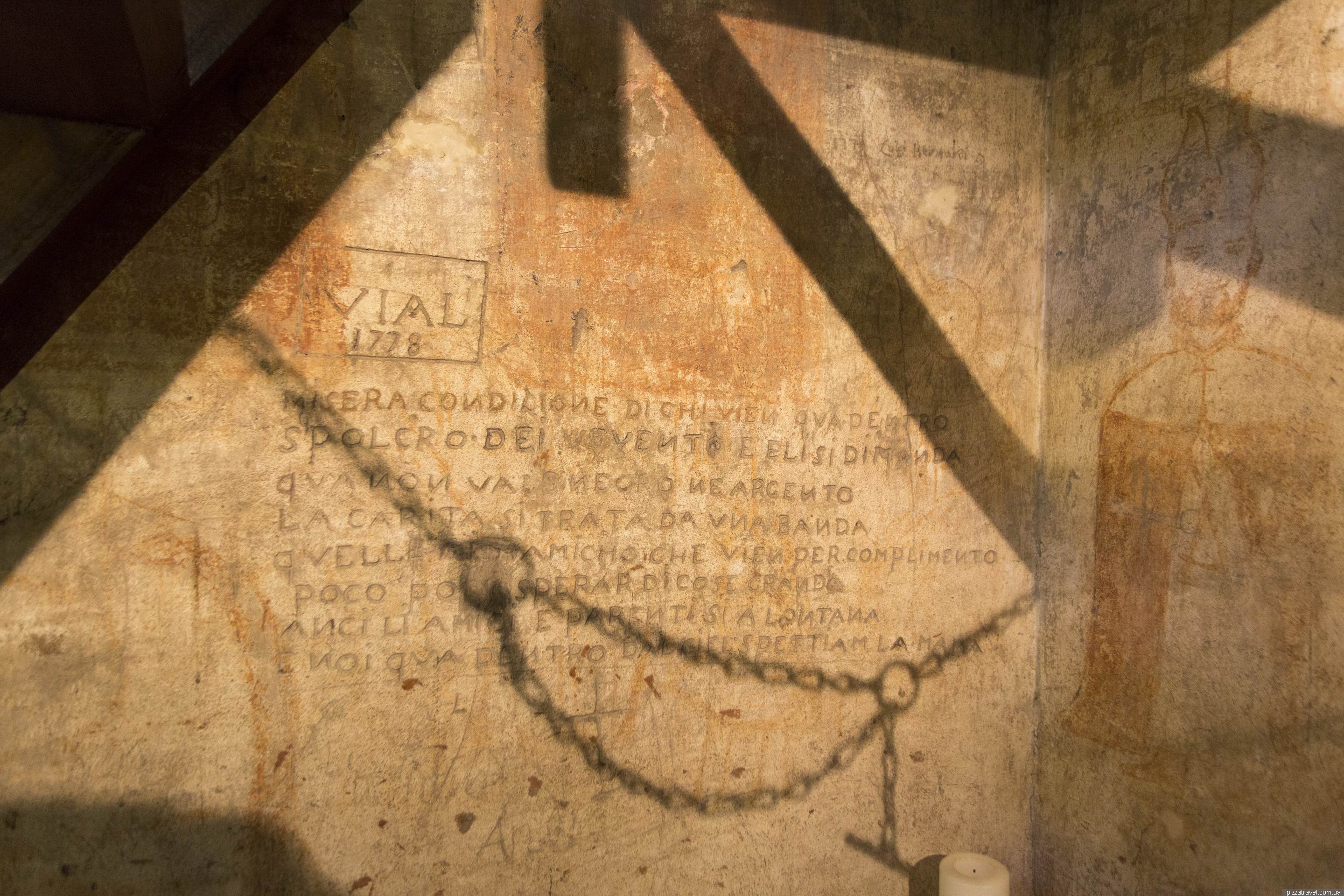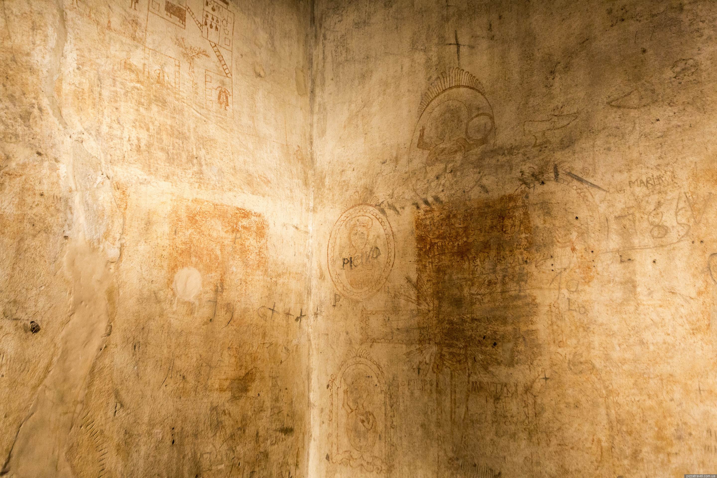 Наступне, найцікавіше приміщення вежі - в'язниця. Вона справжня, всі зображення і написи на стінах оригінальні.