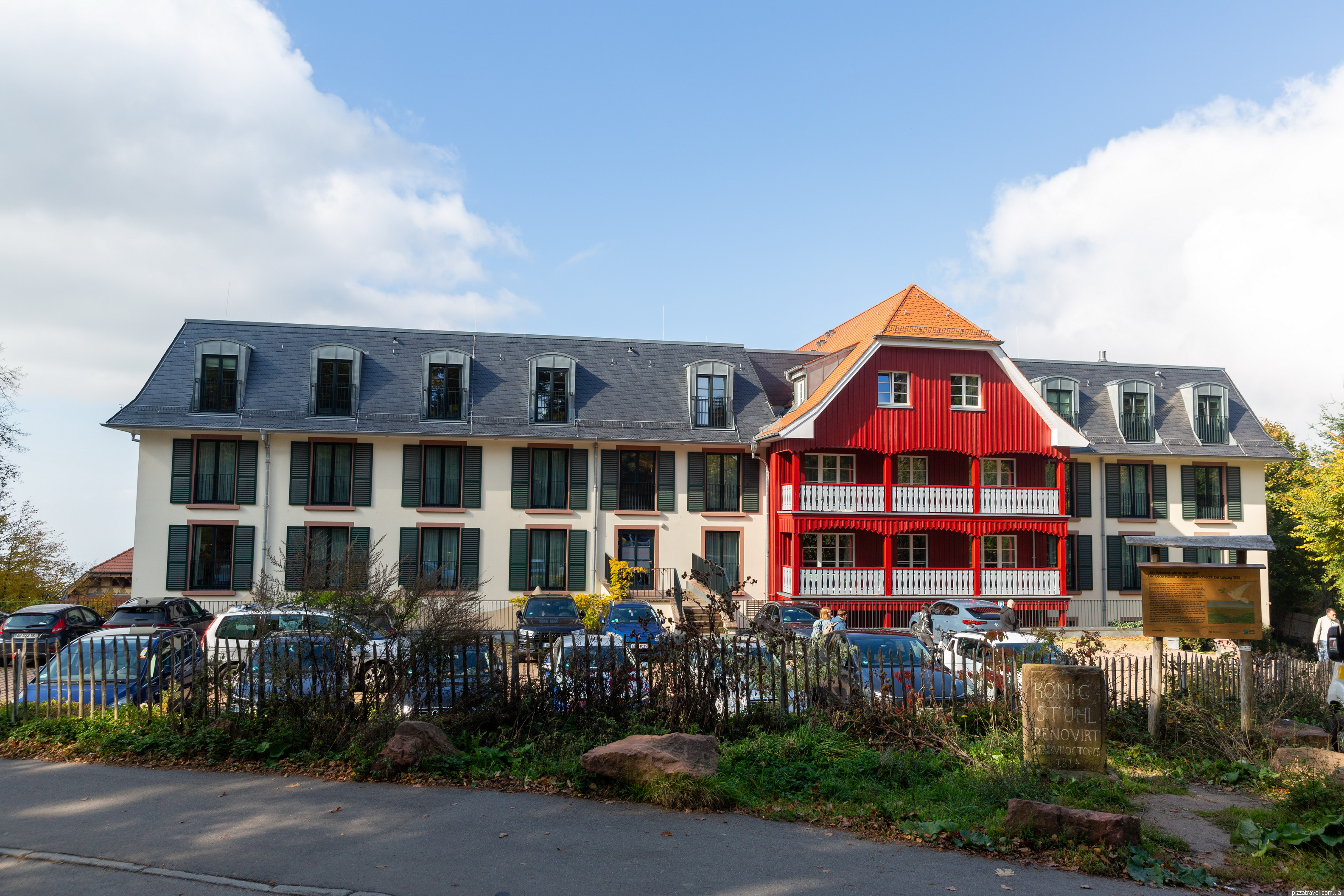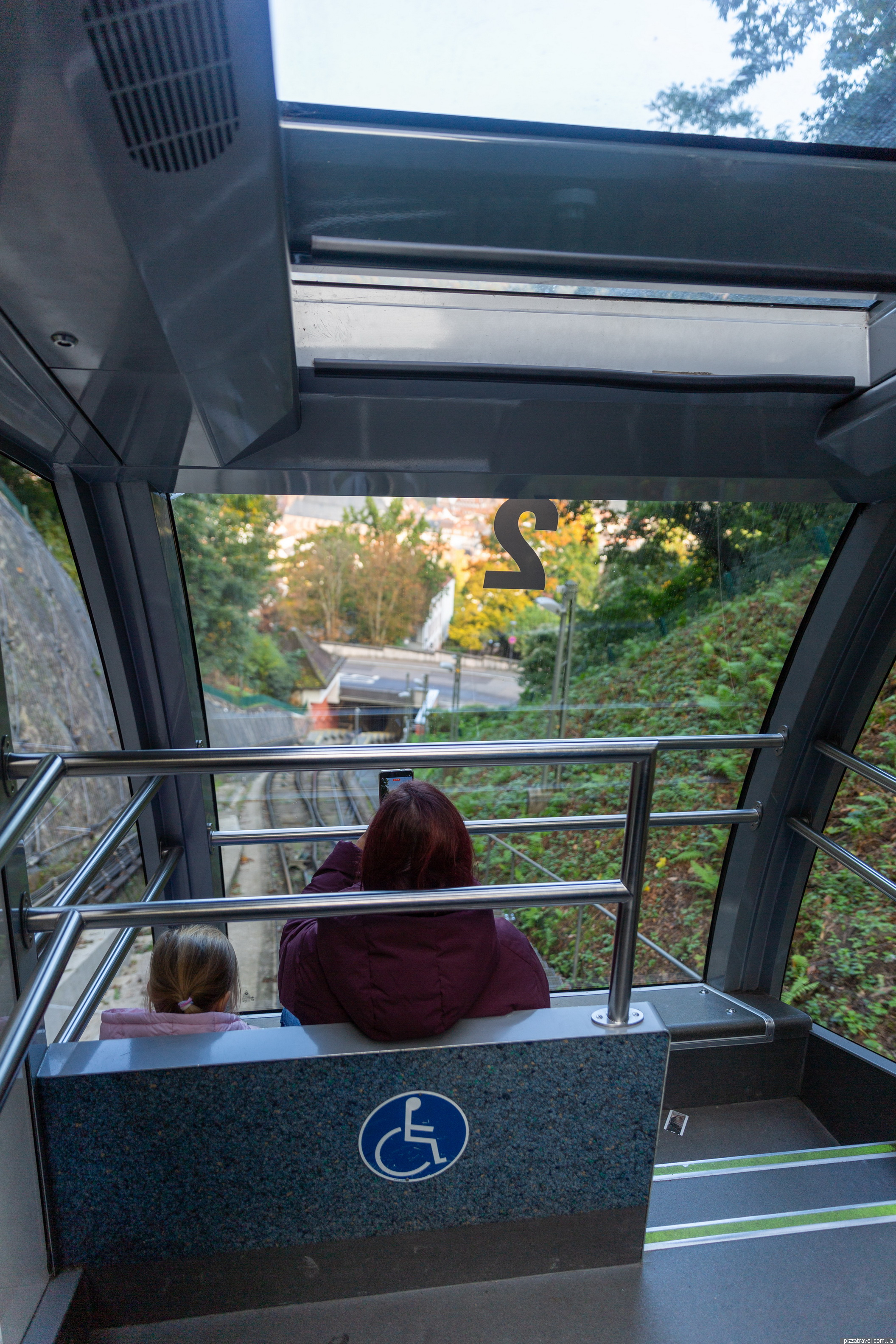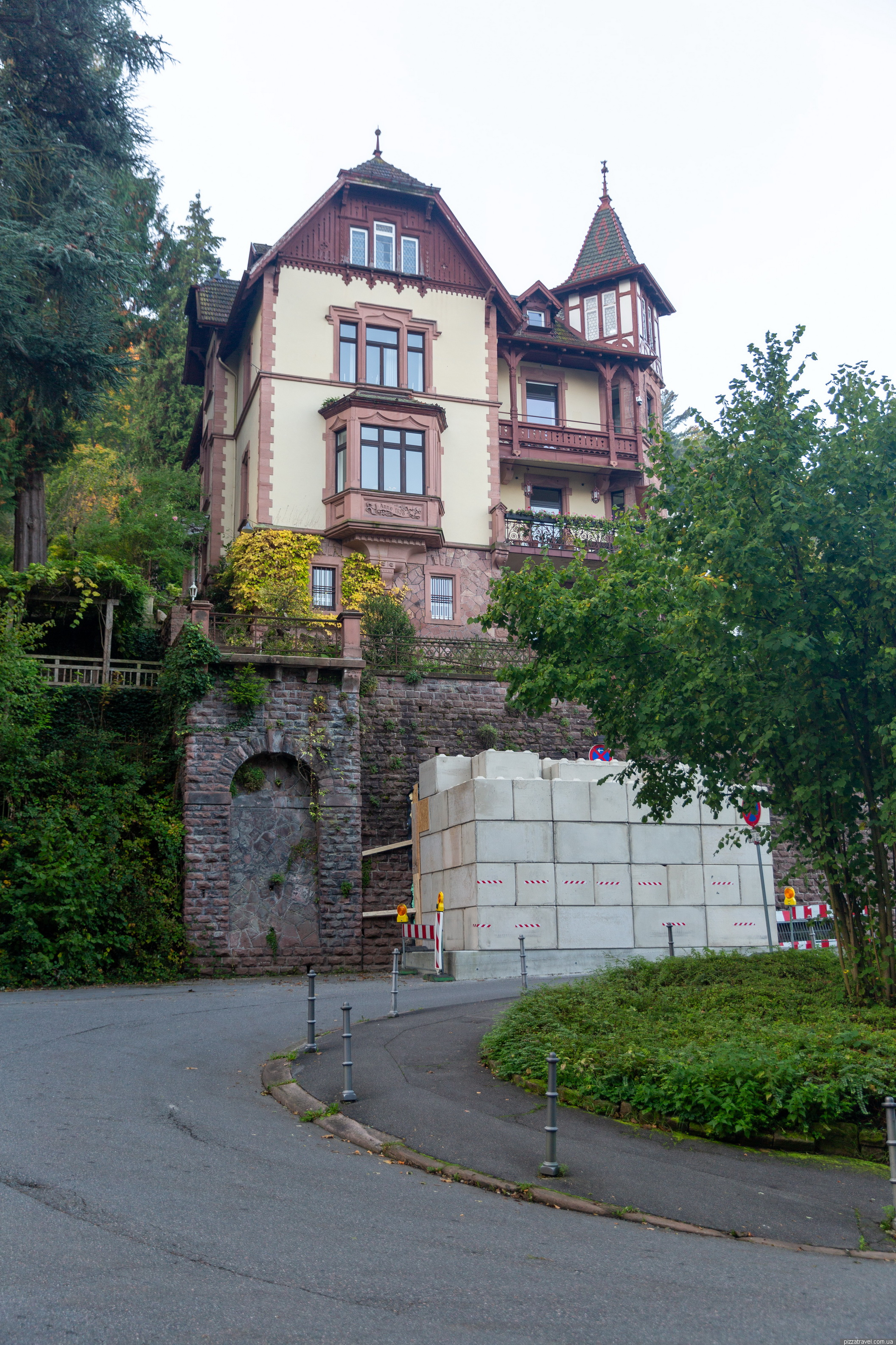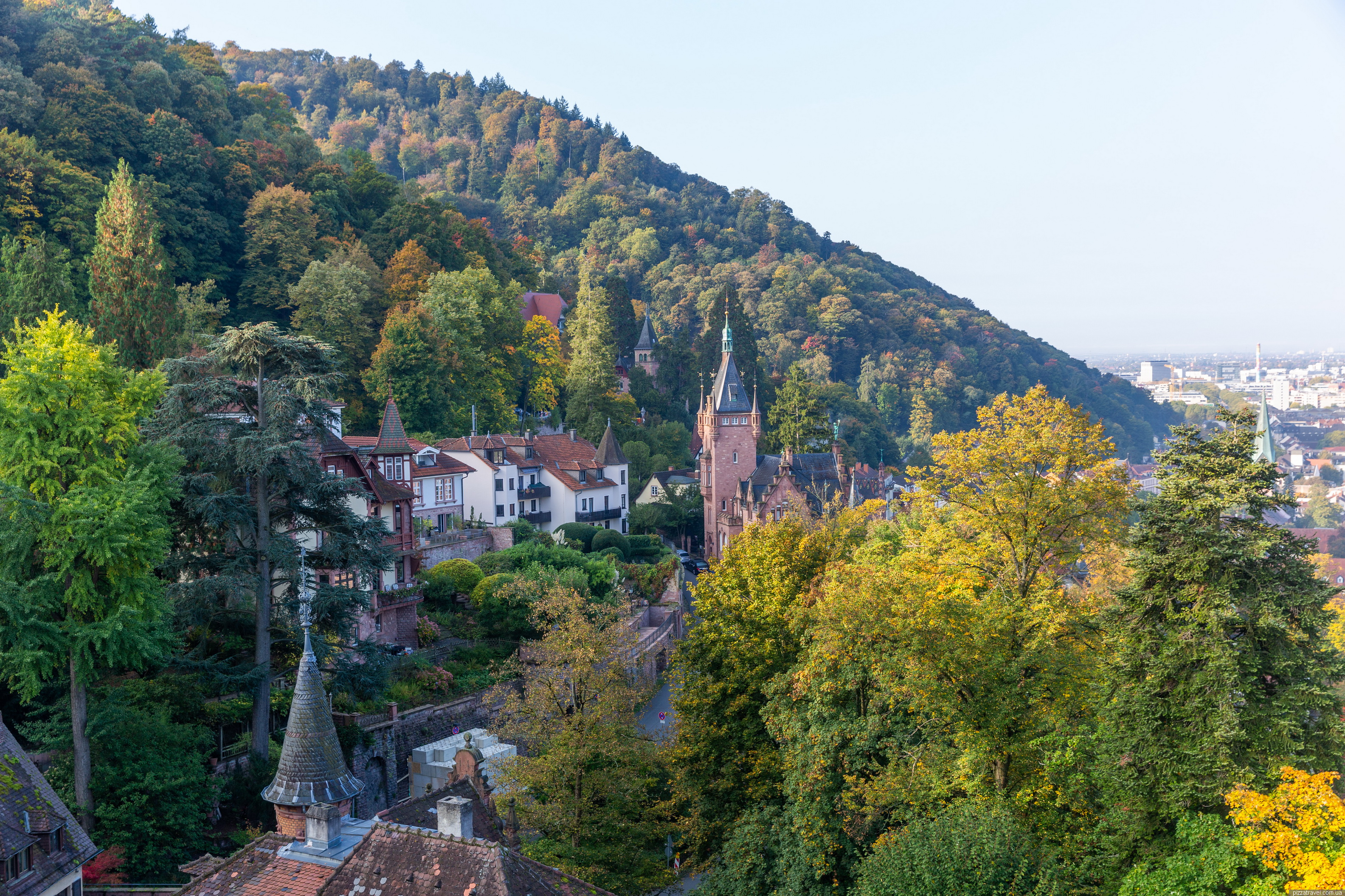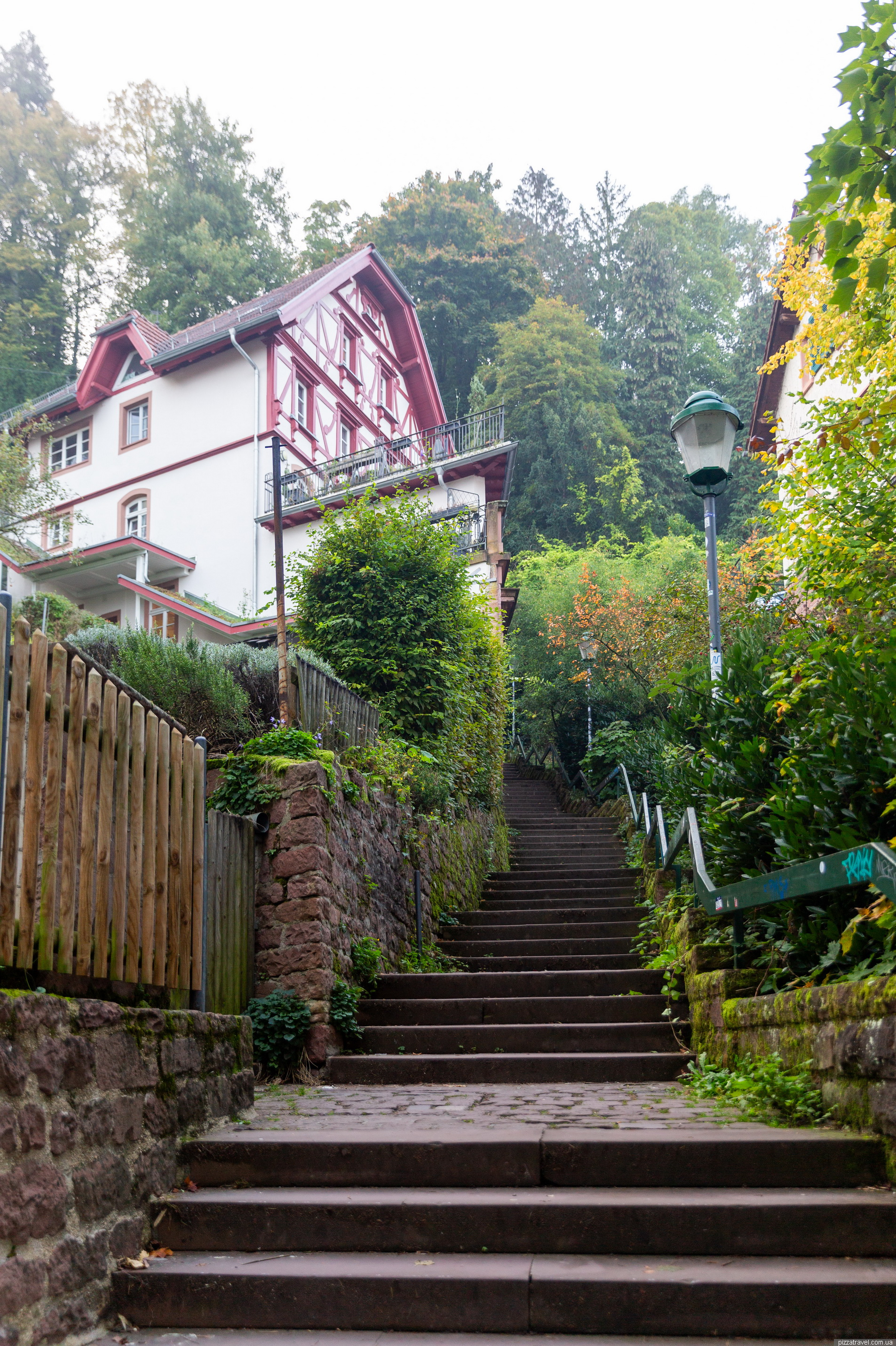 Зі старого міста до замку можна піднятися на фунікулері, у тій же будівлі є багаторівневий паркінг 49.410972, 8.712333. Фунікулер у жовтні починав роботу о 9:00 (https://www.bergbahn-heidelberg.de/), а ми приїхали раніше, тому пішли до замку пішки. По дорозі подивилися гарні віли.