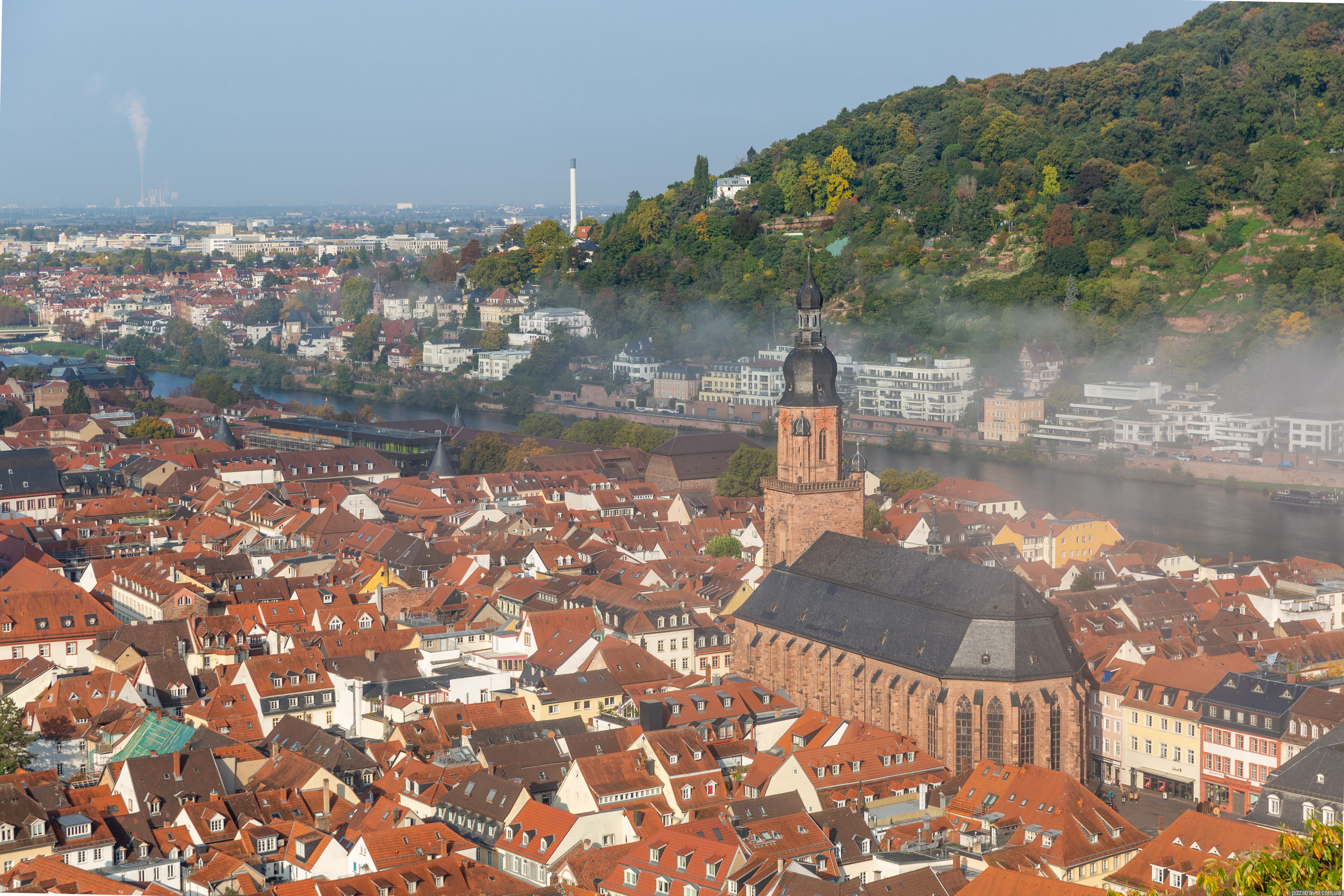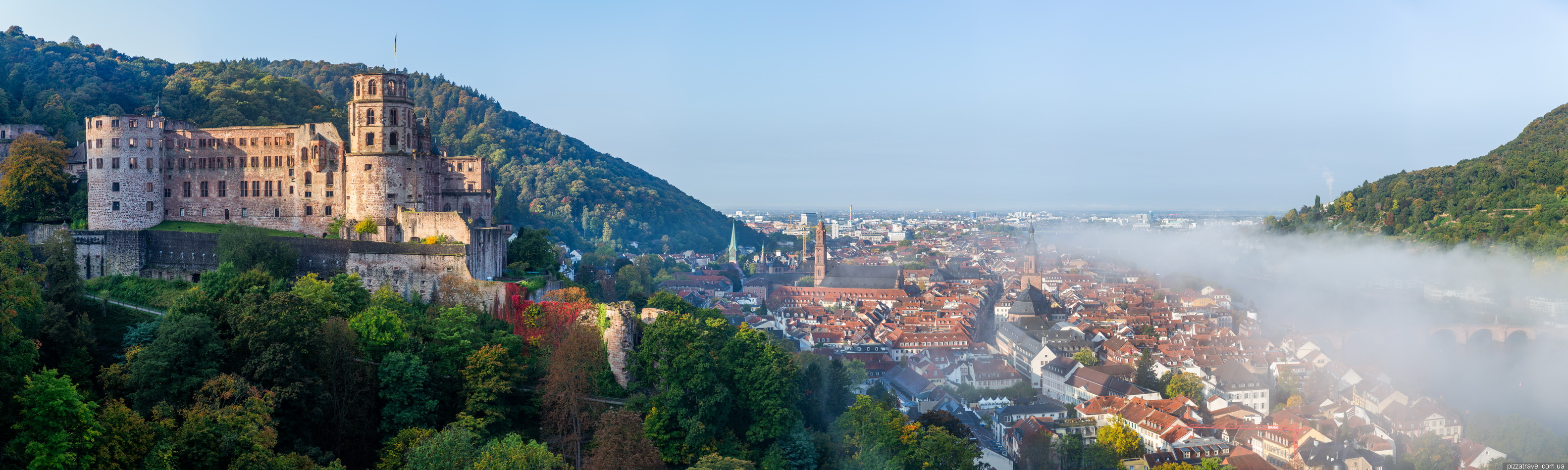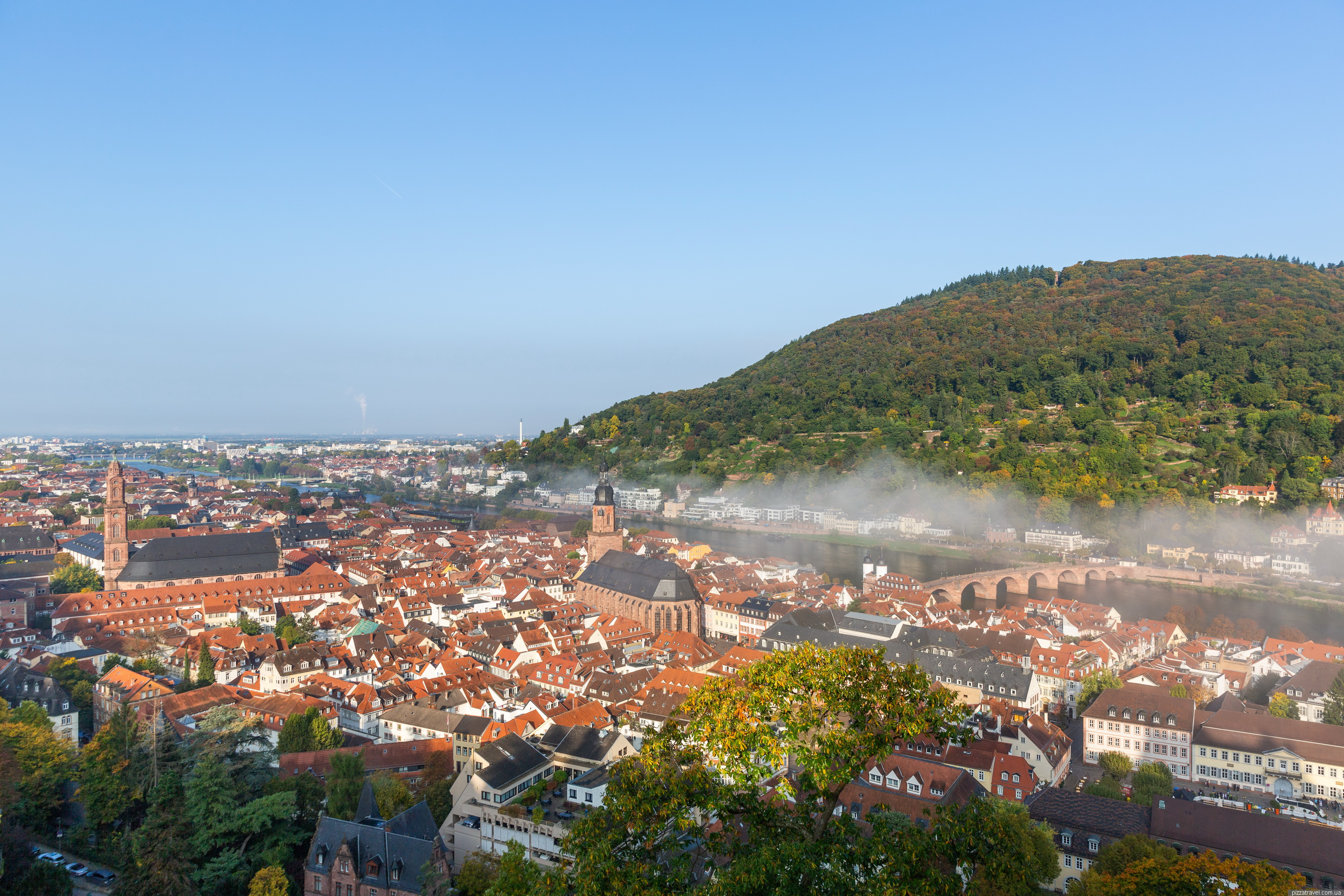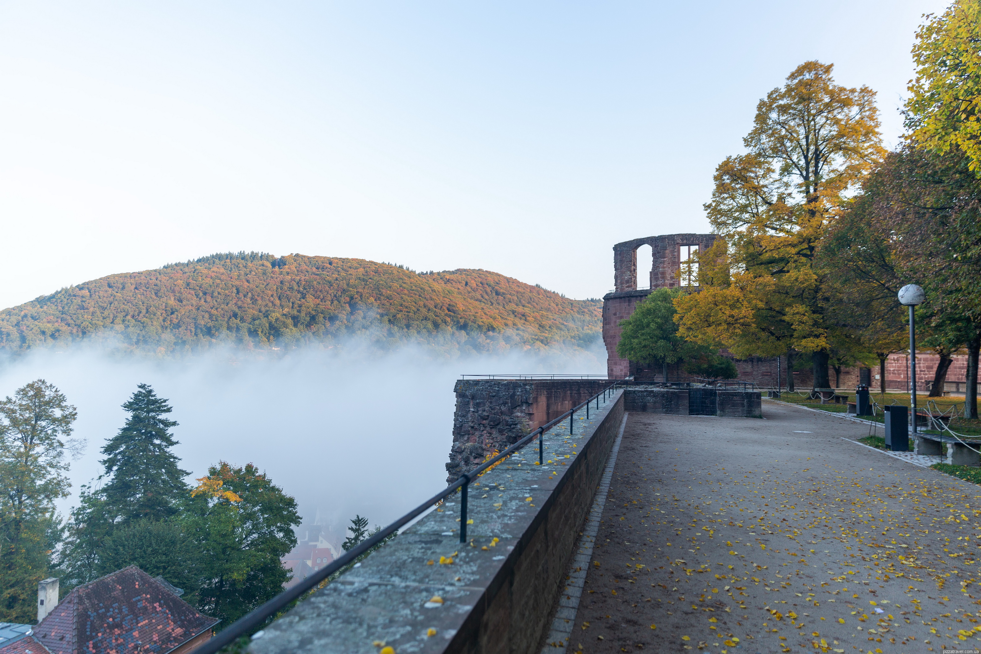 Обійшли замок по колу і дійшли до оглядового майданчика Scheffelterrasse. В цей час місто було вкрите туманом, тому почекали, поки він розсіється. З тераси відкривається найкращий вид на місто і на замок.