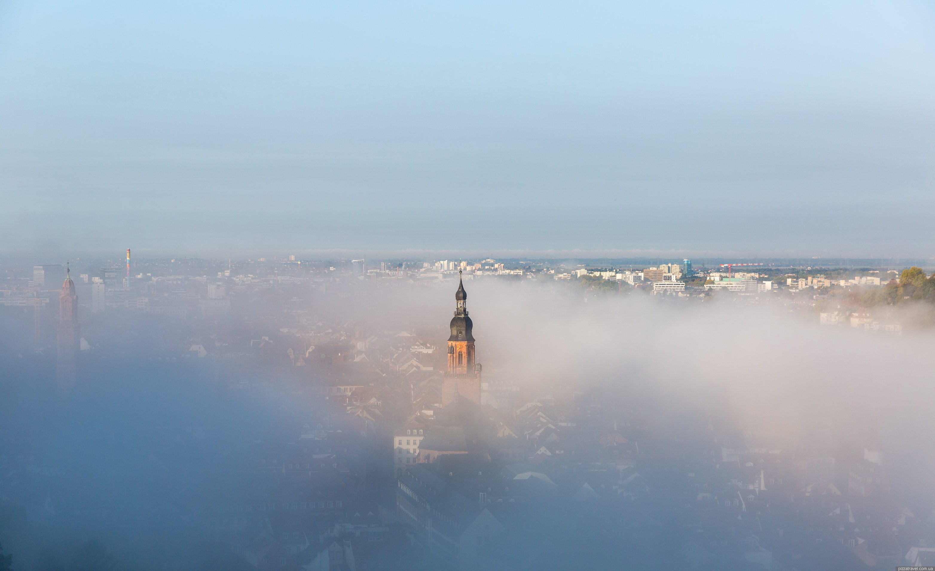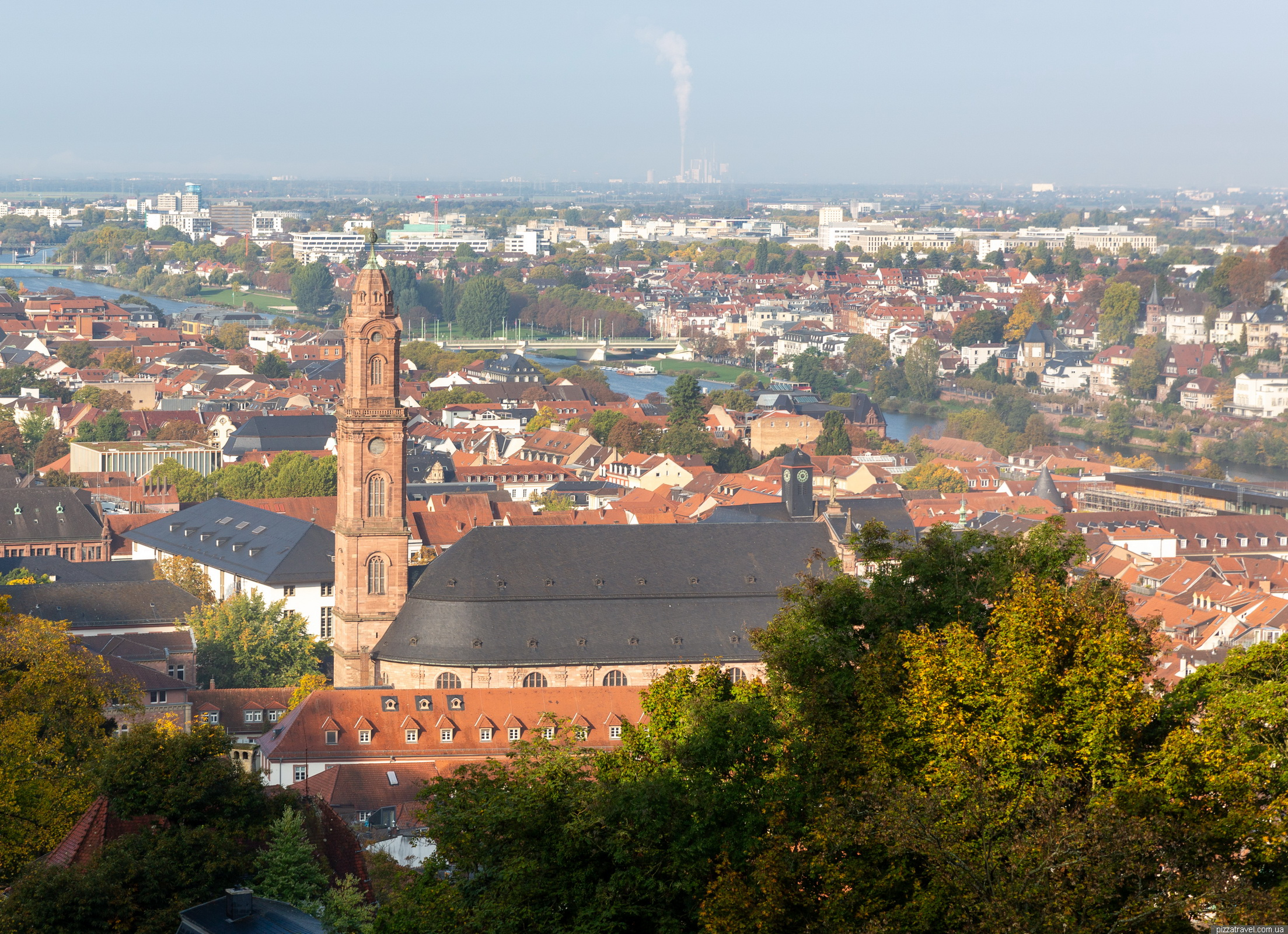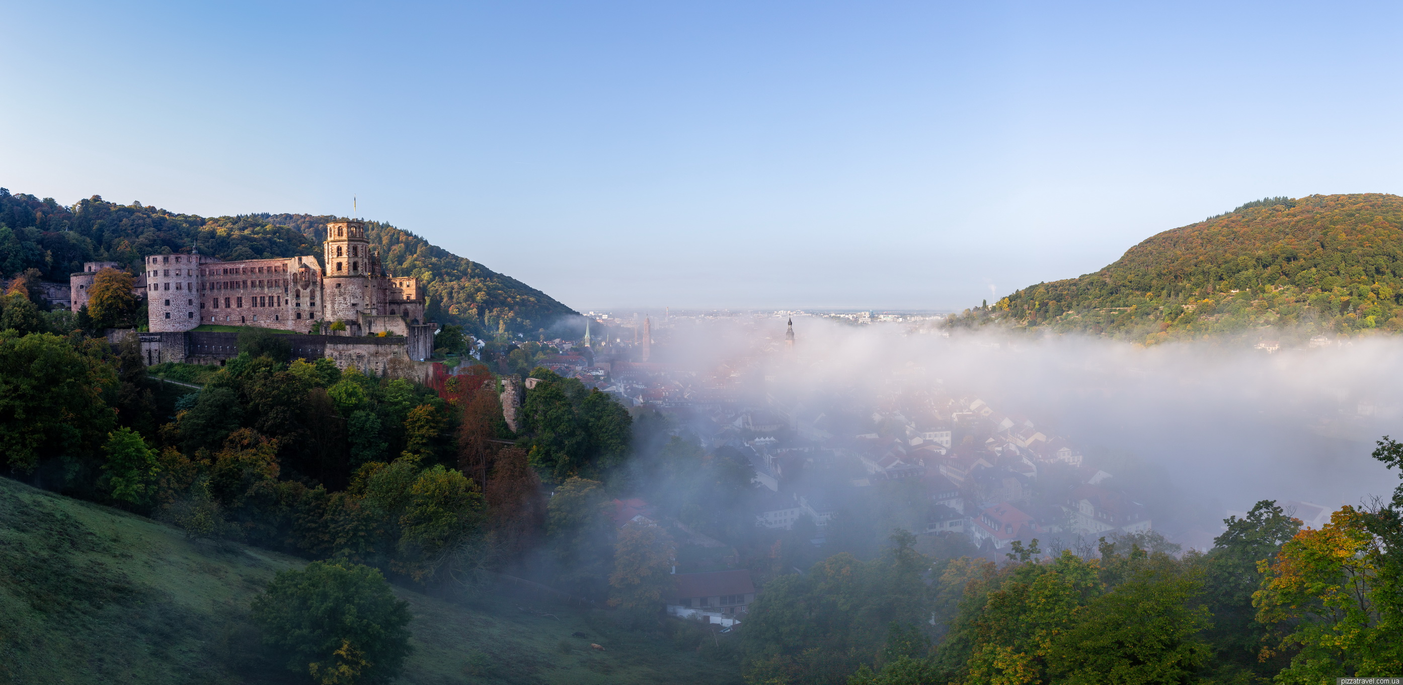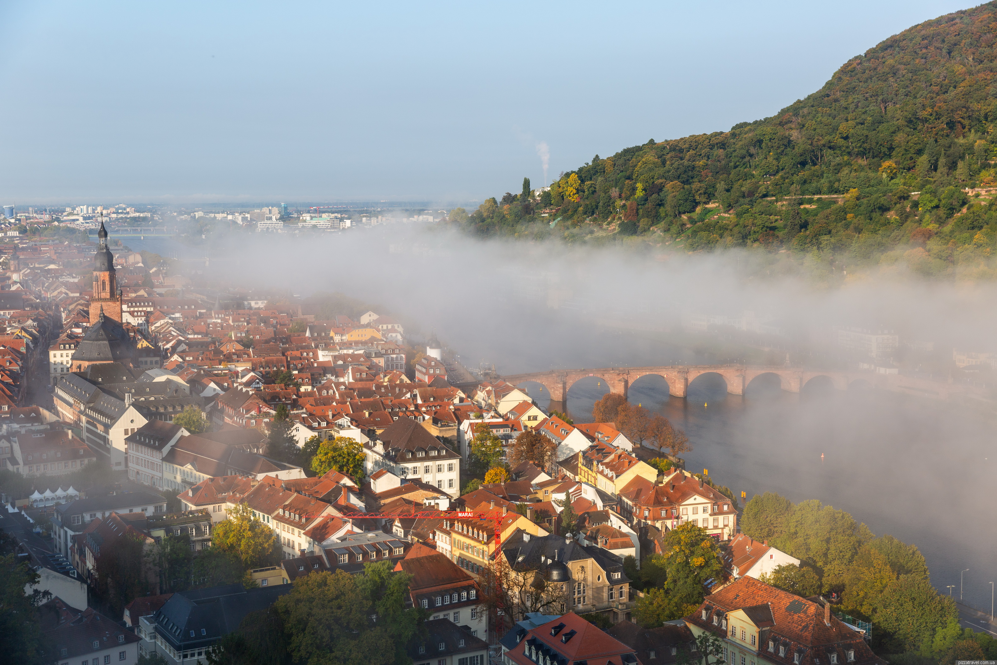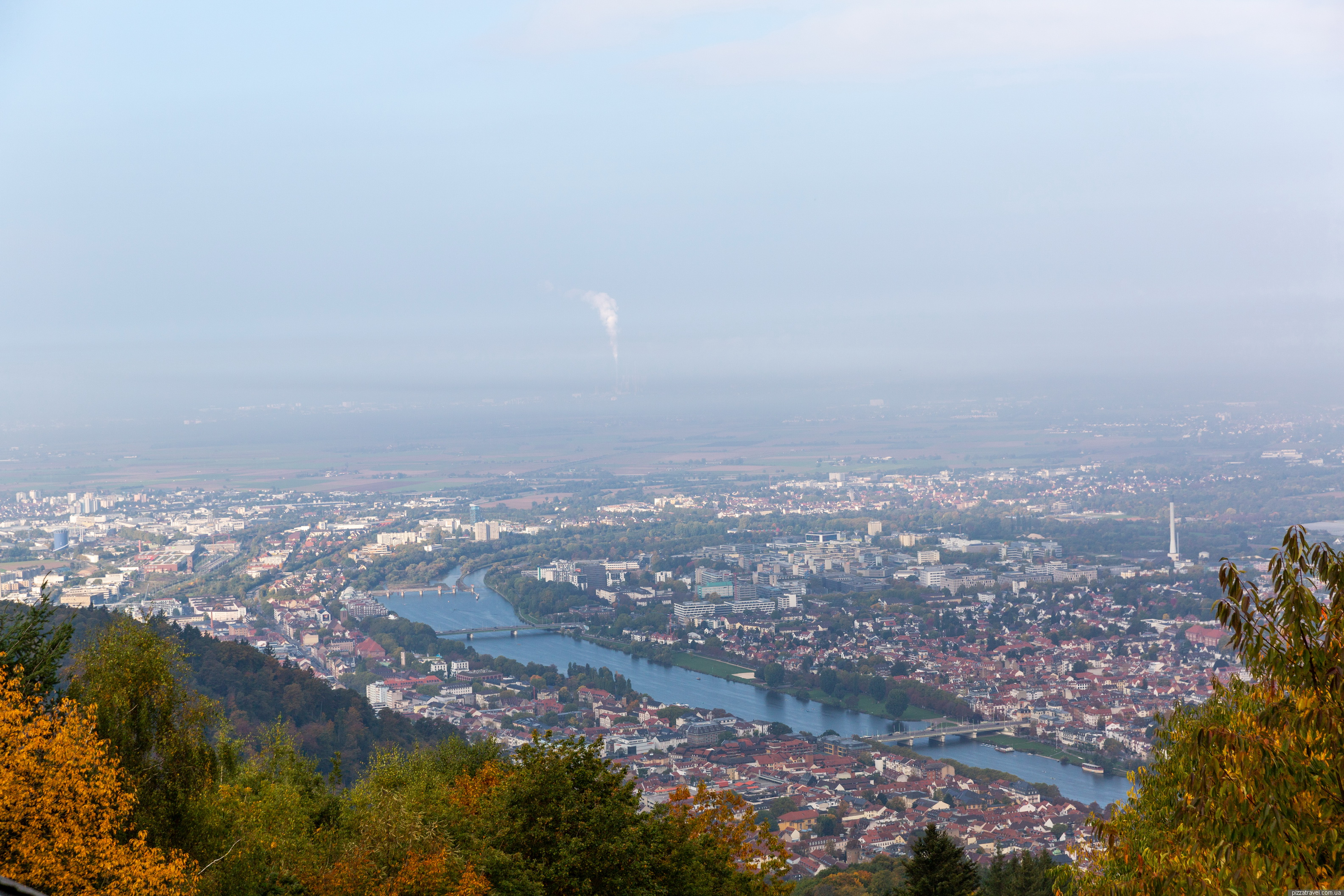 Обійшли замок по колу і дійшли до оглядового майданчика Scheffelterrasse. В цей час місто було вкрите туманом, тому почекали, поки він розсіється. З тераси відкривається найкращий вид на місто і на замок.