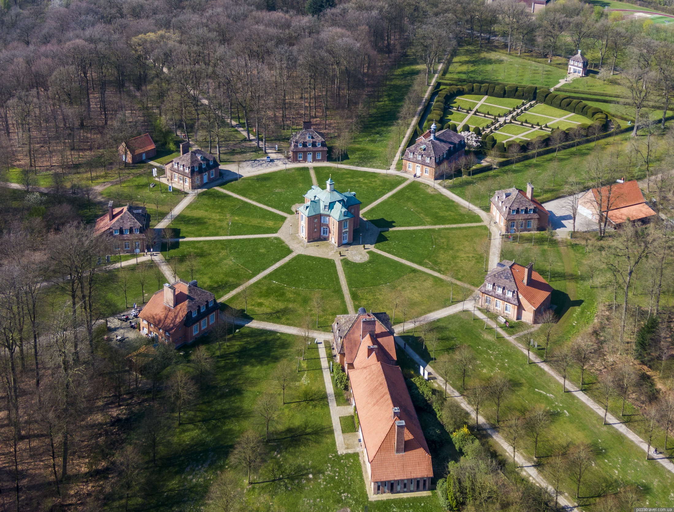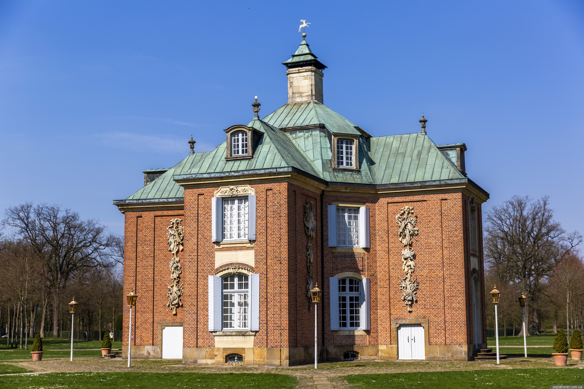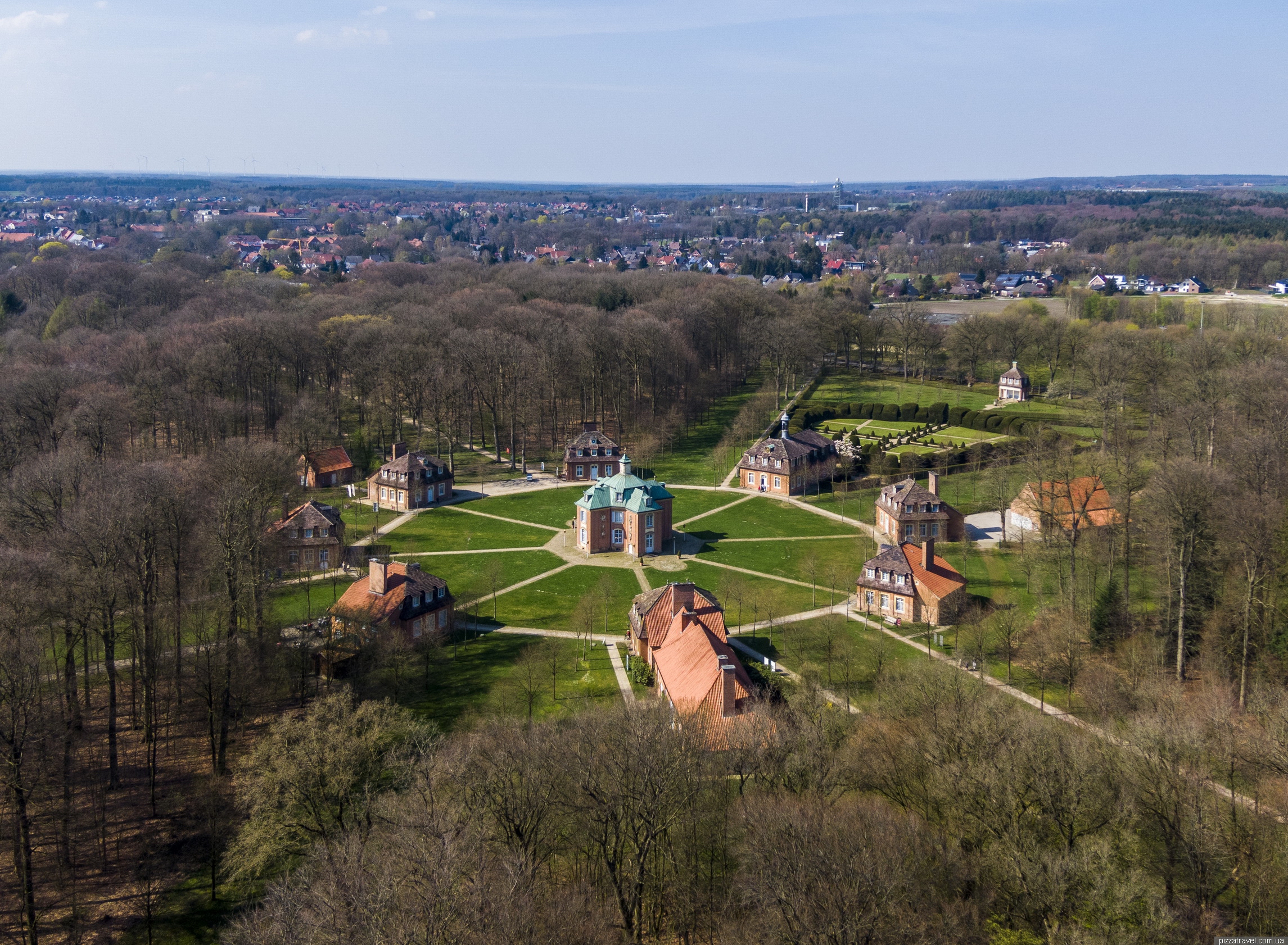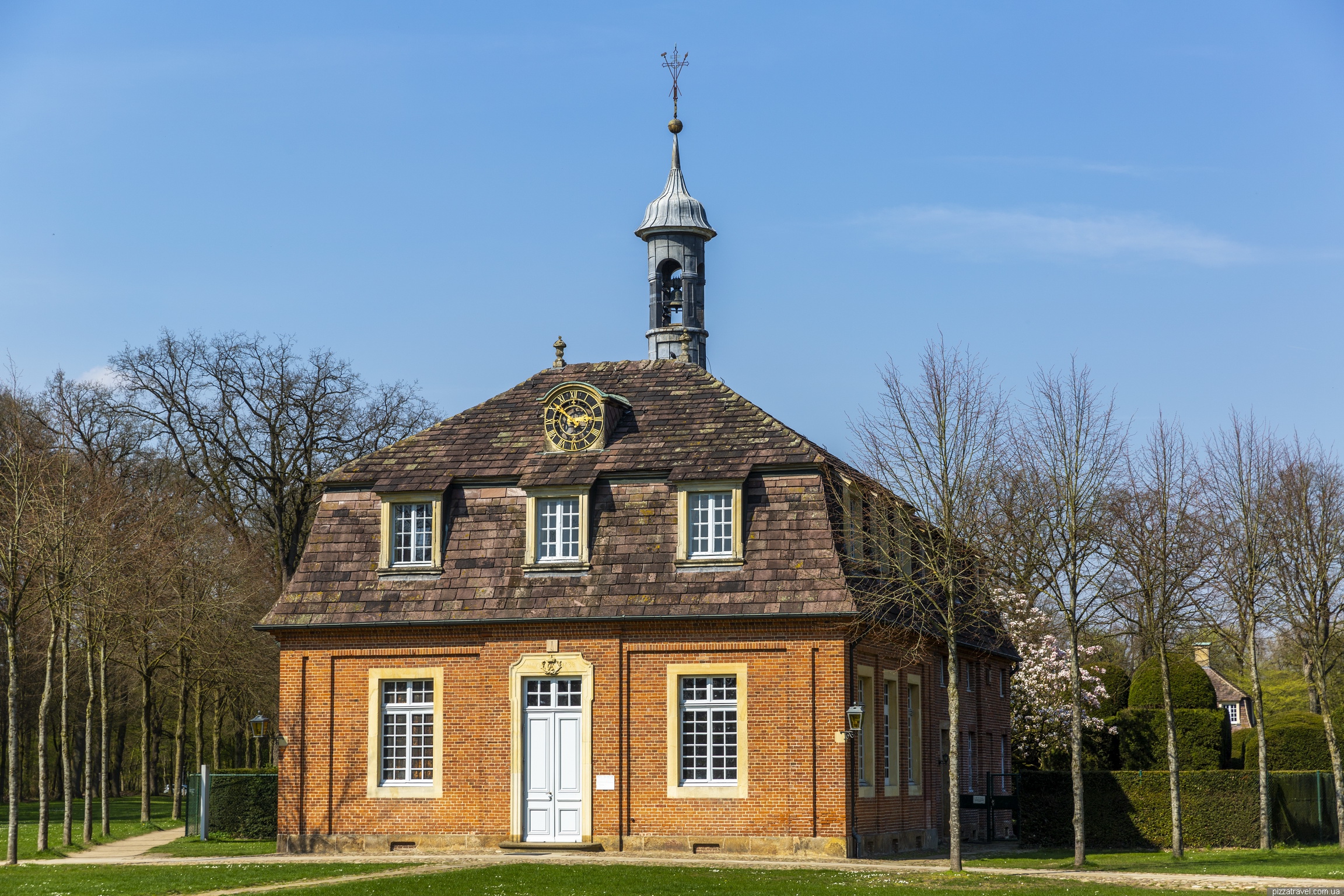 Архітектурний ансамбль Клеменсверт складається відразу з десятка будівель. Всі вони розташовані по колу, а в центрі стоїть головний павільйон. Це мисливський палац, де і жив принц. Ми не відвідували будови всередині, але вони відкриті для відвідування.