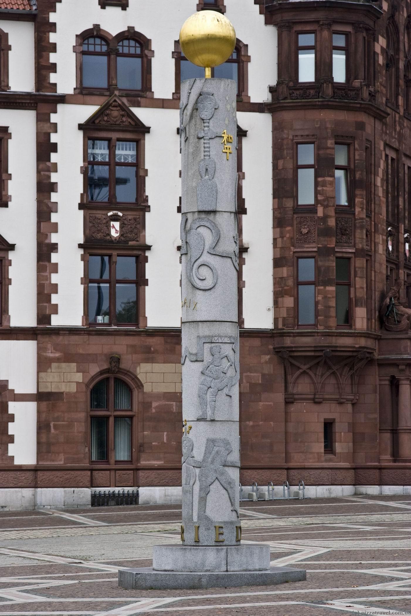 На площі встановлена ??колона, на якій на різних мовах написане слово "Мир".