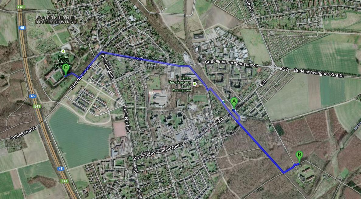 Шлях від станції DO-Westerfilde (A) до Schloss Westhusen (B) і Schloss Bodelschwingh (C) ©maps.google.com