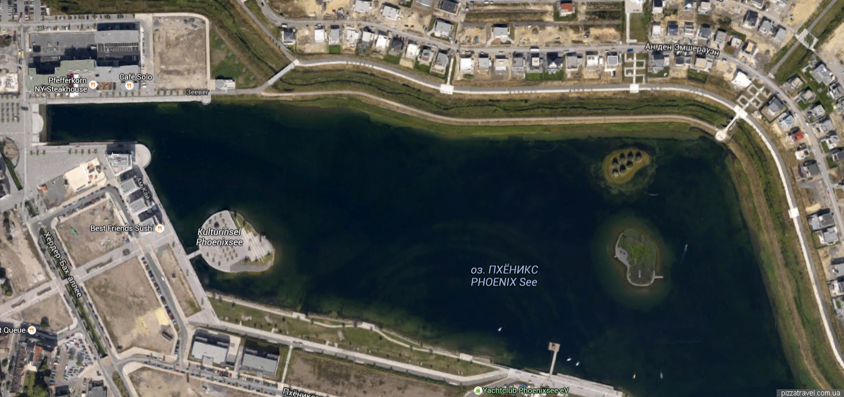 Я спеціально зробив скріншот озера Фенікс з гугл мапс, щоб порівняти зображення, коли воно оновиться. Кілька років тому тут був пустир, що залишився на місці заводу.