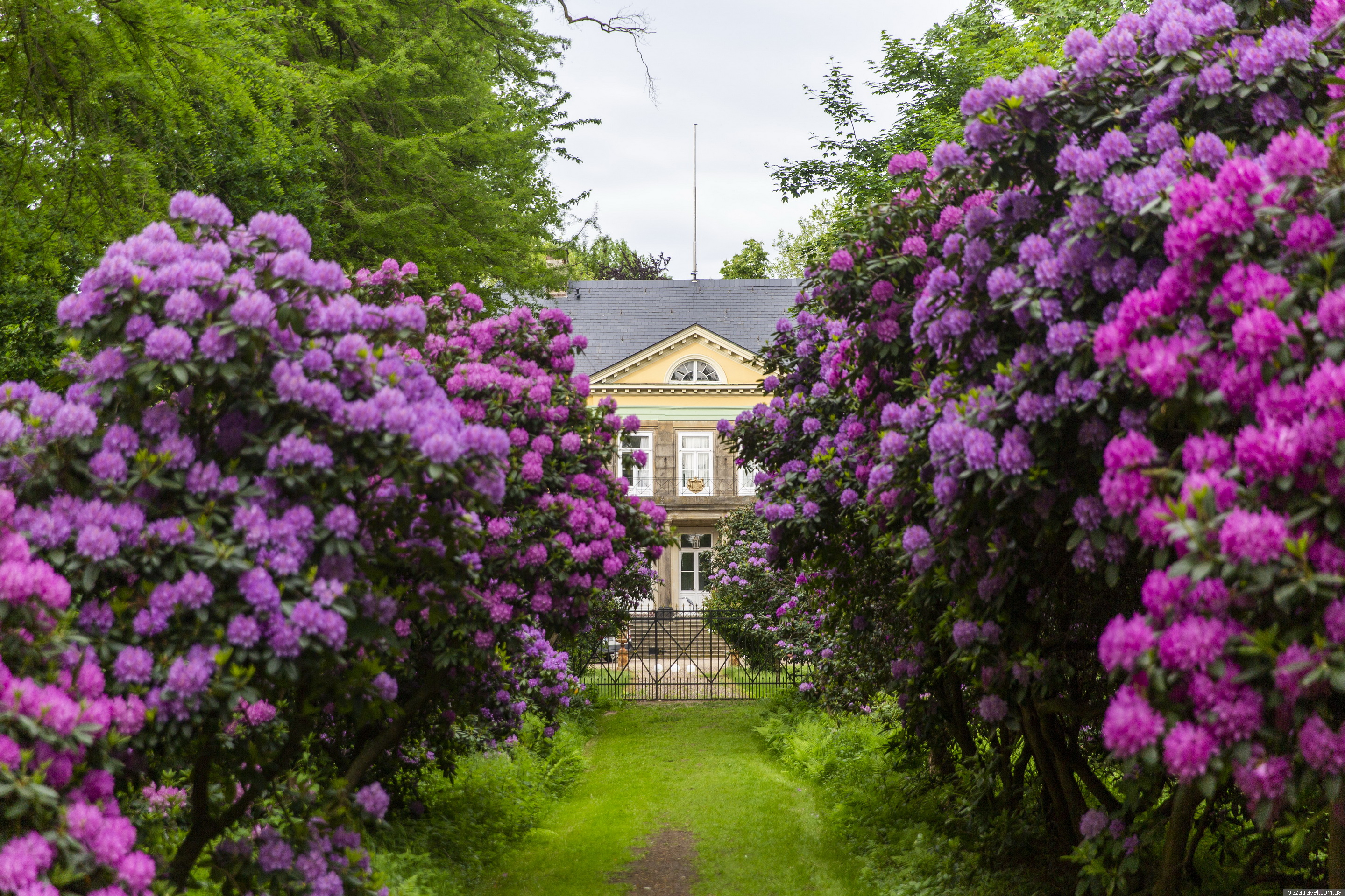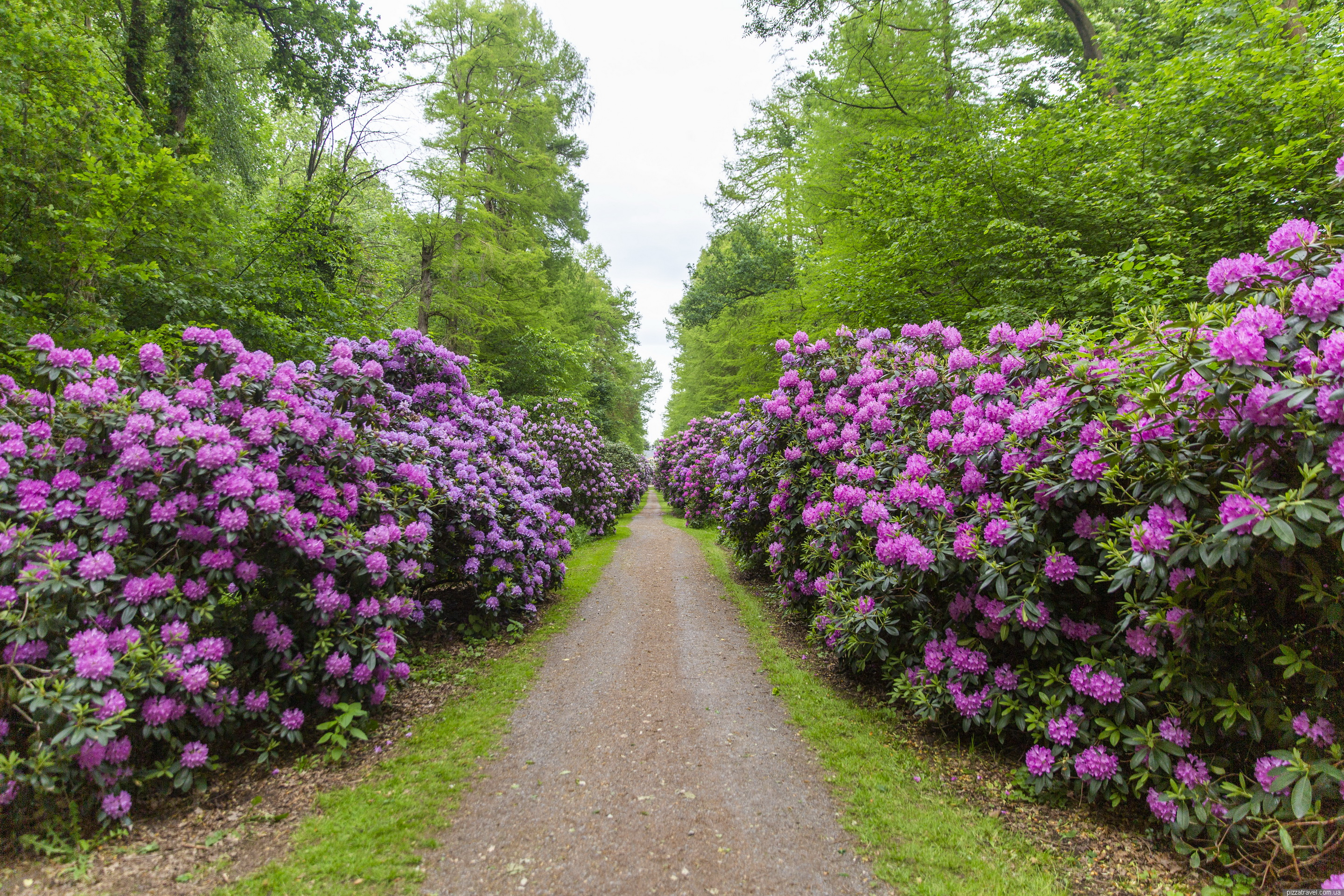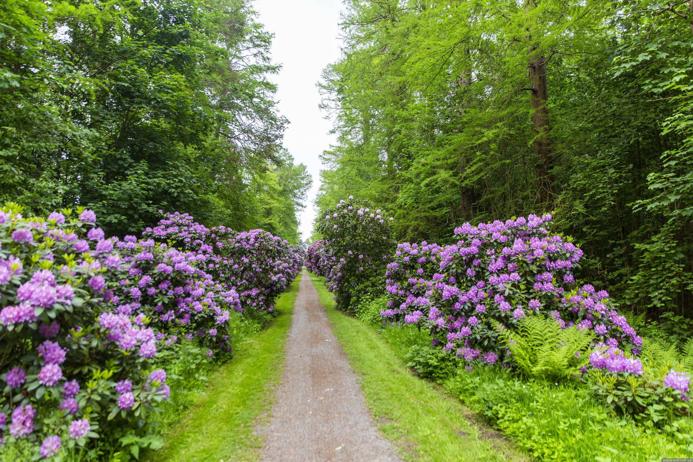 Красива алея рододендронів посеред лісу. Належить до приватного замку, але гуляти можна вільно. Сам замок можна побачити через паркан. Нагадуємо, що рододендрони цвітуть у травні, і не забудьте спрей від комарів.