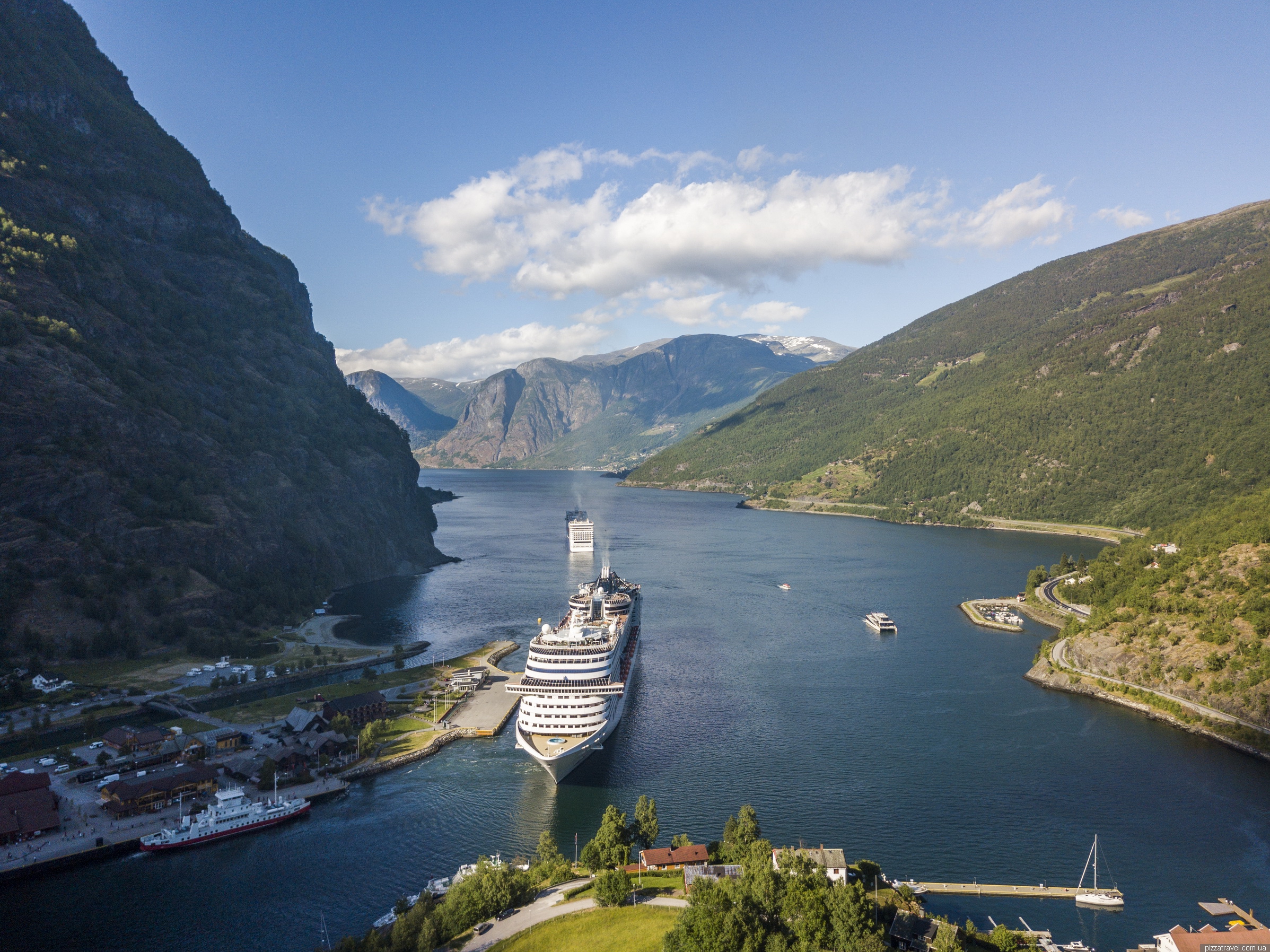 Днем сюди припливають кілька величезних туристичних лайнерів і на берег сходять тисячі туристів. Можна прогулятися, поїсти в ресторані, можна піднятися на найближчий пагорб і подивитися на фьорд зверху. Ці фото зняті з дрона, але з пагорба теж гарний вид, його видно на фото, там де будиночки.