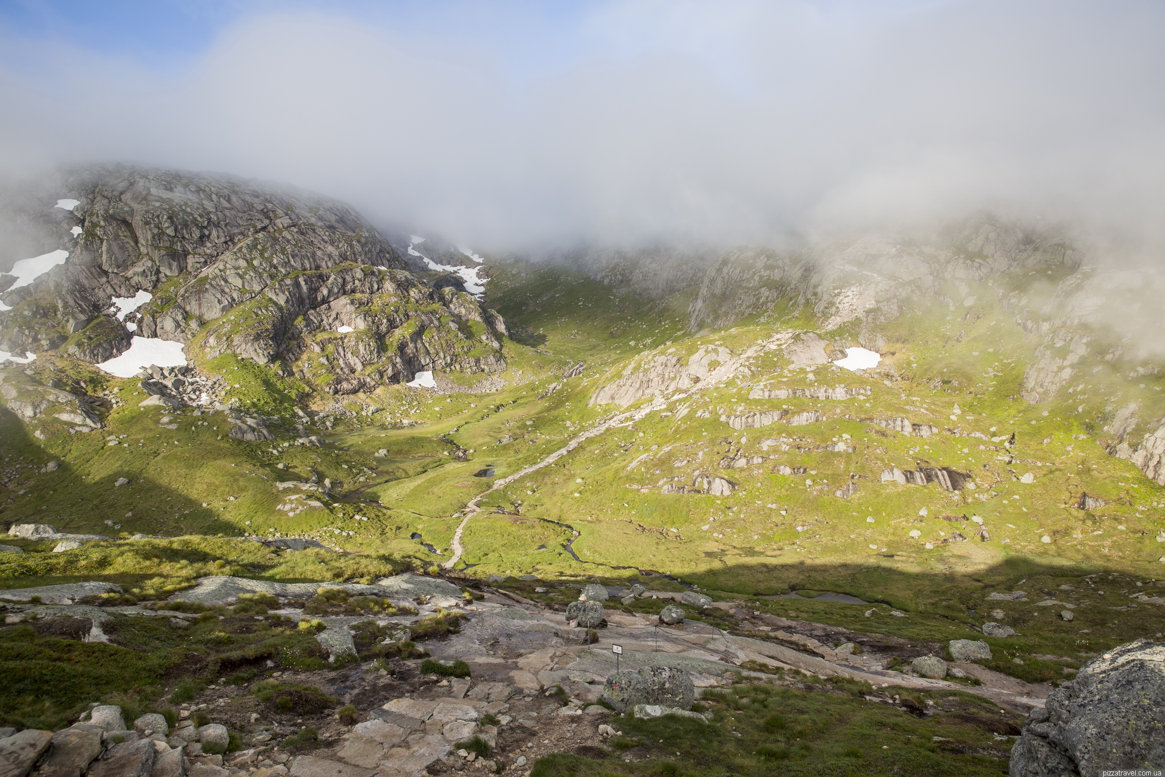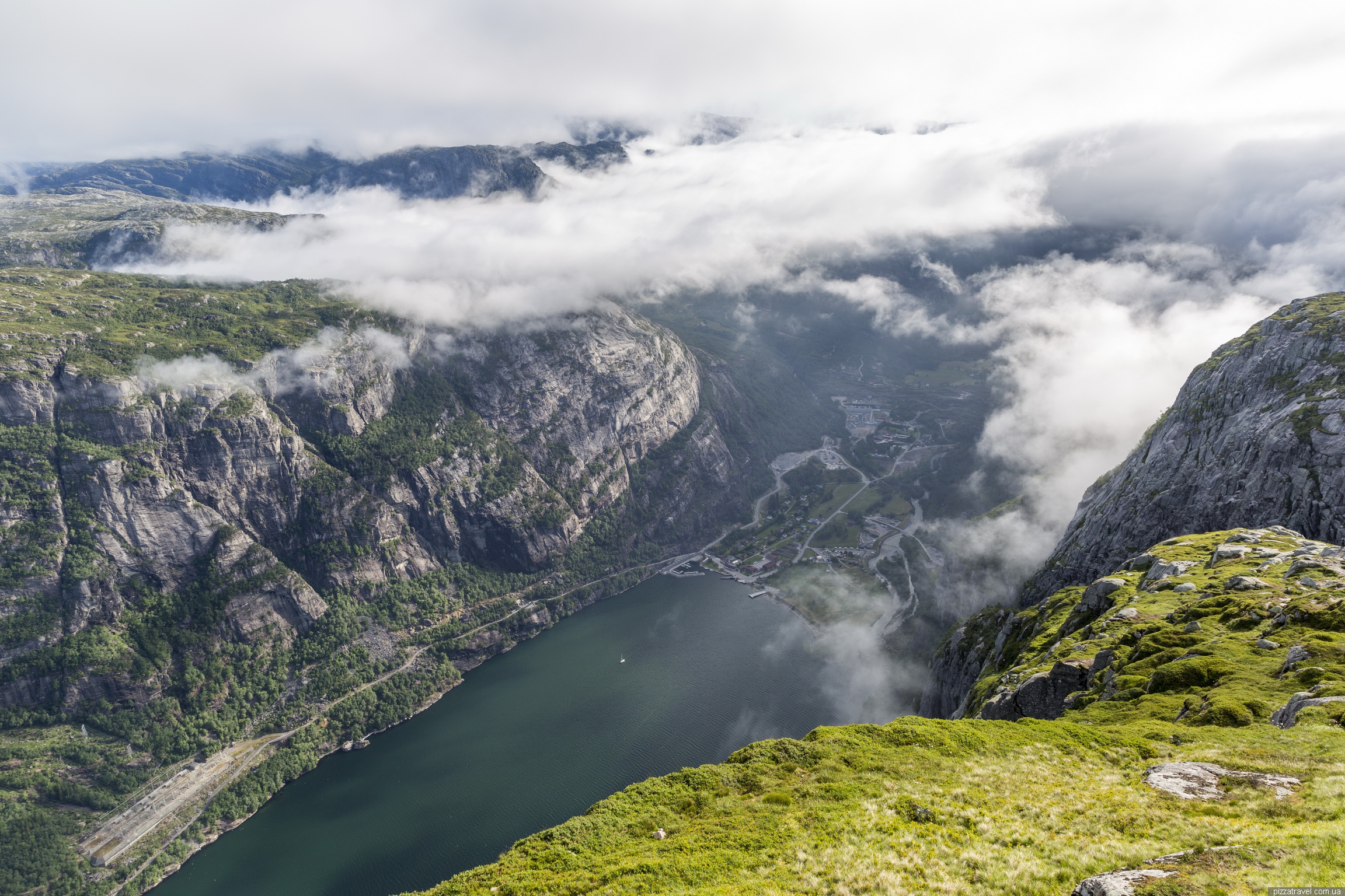 Ми планували стартувати рано вранці, тому заночували в селищі Lysebotn, яке розташоване на березі Люсефьорда. Ось вид на селище зі стежки.