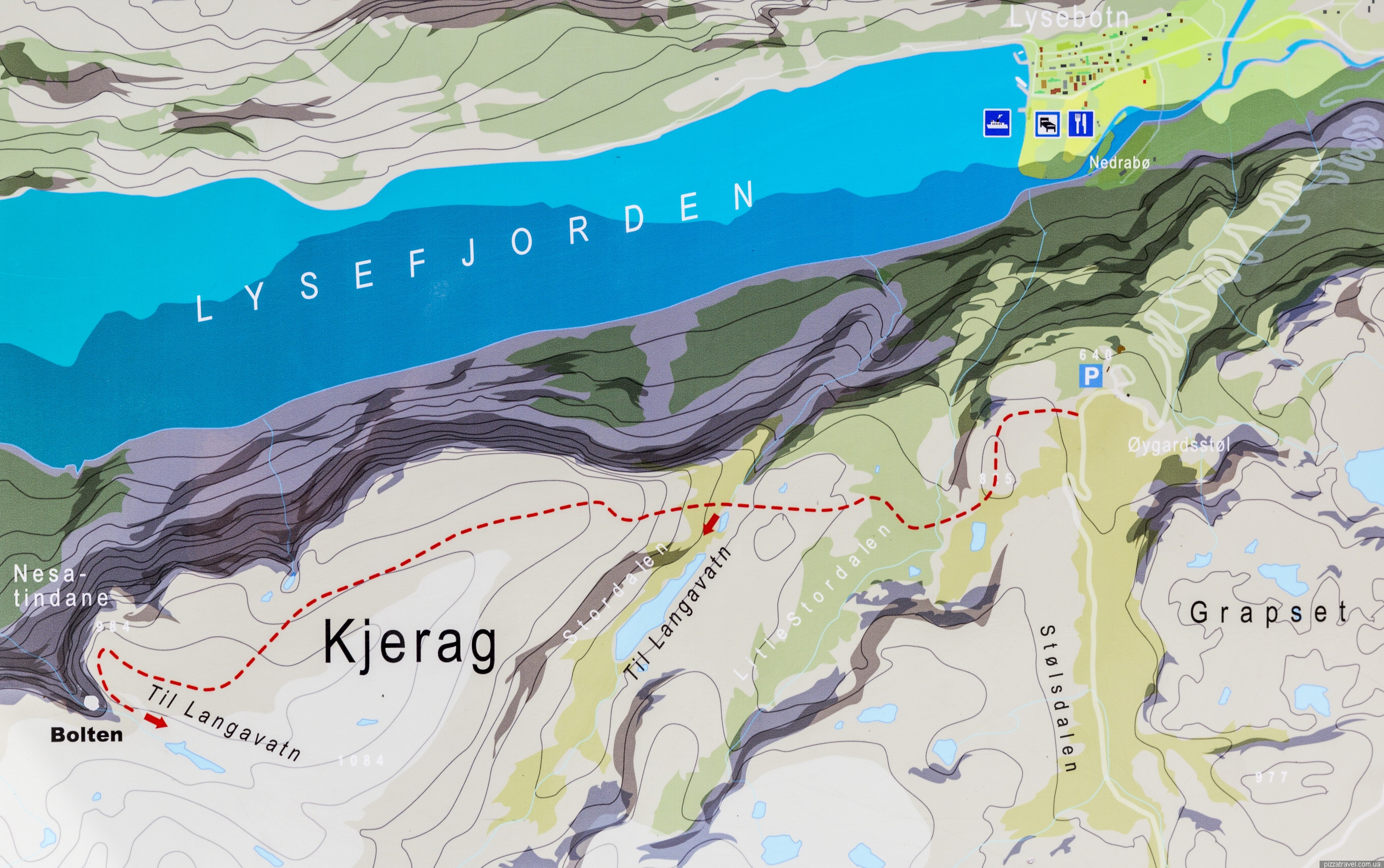 Як дістатися: Компанія Go Fjords організує автобусні екскурсії з Ставангера за 640 NOK (64 EUR), інформацію дивіться тут. Автомобільна парковка N 59 02.743 E 6 39.077. На автомобілі можна доїхати як по дорозі, через Sinnes і Suleskard, так і на поромі до Lysebotn (інформація). Якщо ви приїхали в Lysebotn на поромі, то піднятися на початок треку (Øygardstøl) можете на таксі. Якби ми їхали таким чином, то просто б попросили когось нас підвезти, так як з порома всі їдуть тільки туди.