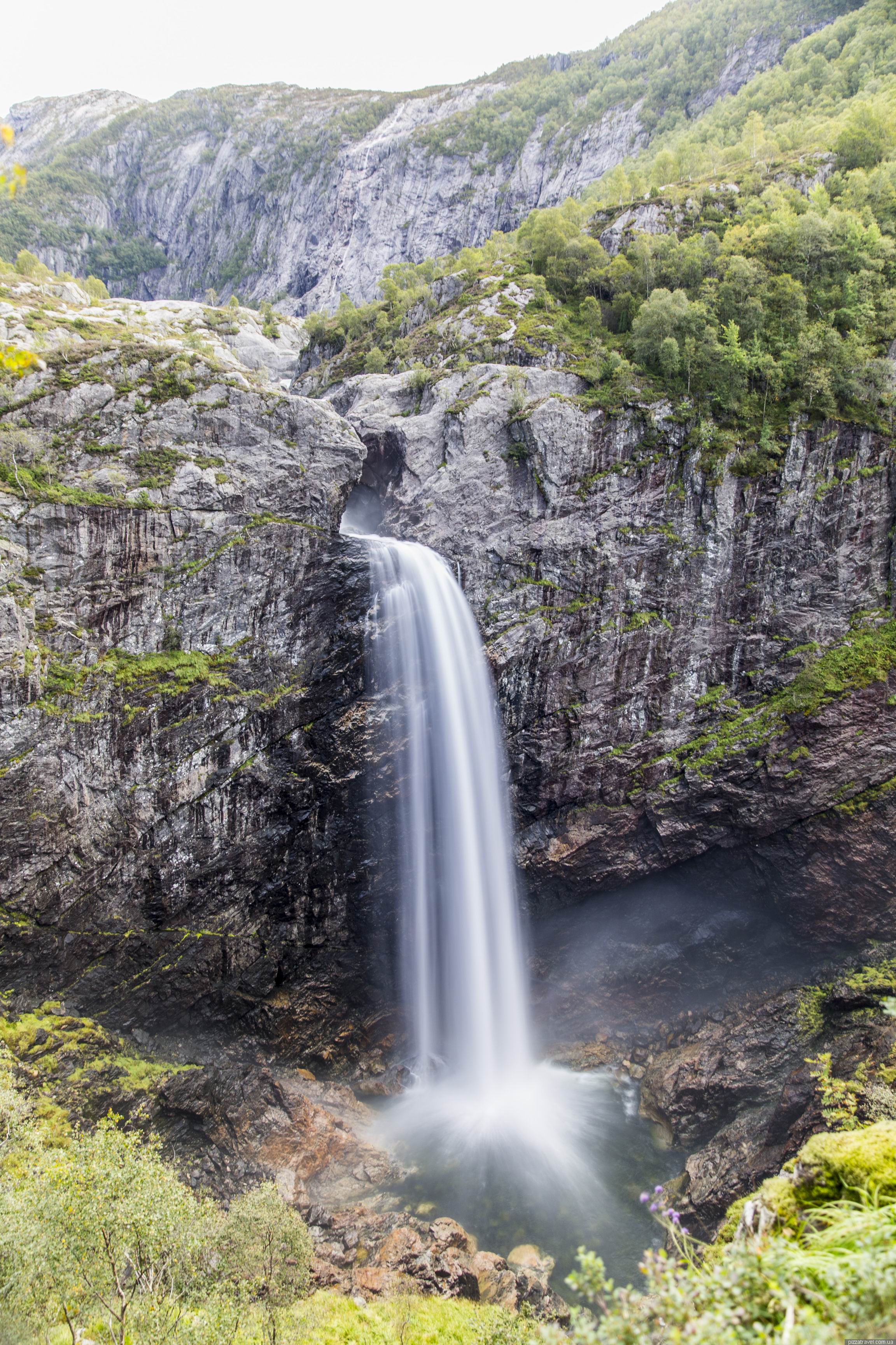 Монафоссен - це мальовничий водоспад заввишки 92 метри. Його особливістю є наявність чудового оглядового майданчика, одного з кращих, які ми бачили. Від паркувки до оглядового майданчику веде досить крута стежка, в багатьох місцях потрібно підніматися за допомогою залізного ланцюга, підвішеного на поручнях. Перепад висот 250 метрів, у нас підйом зайняв 30 хвилин.