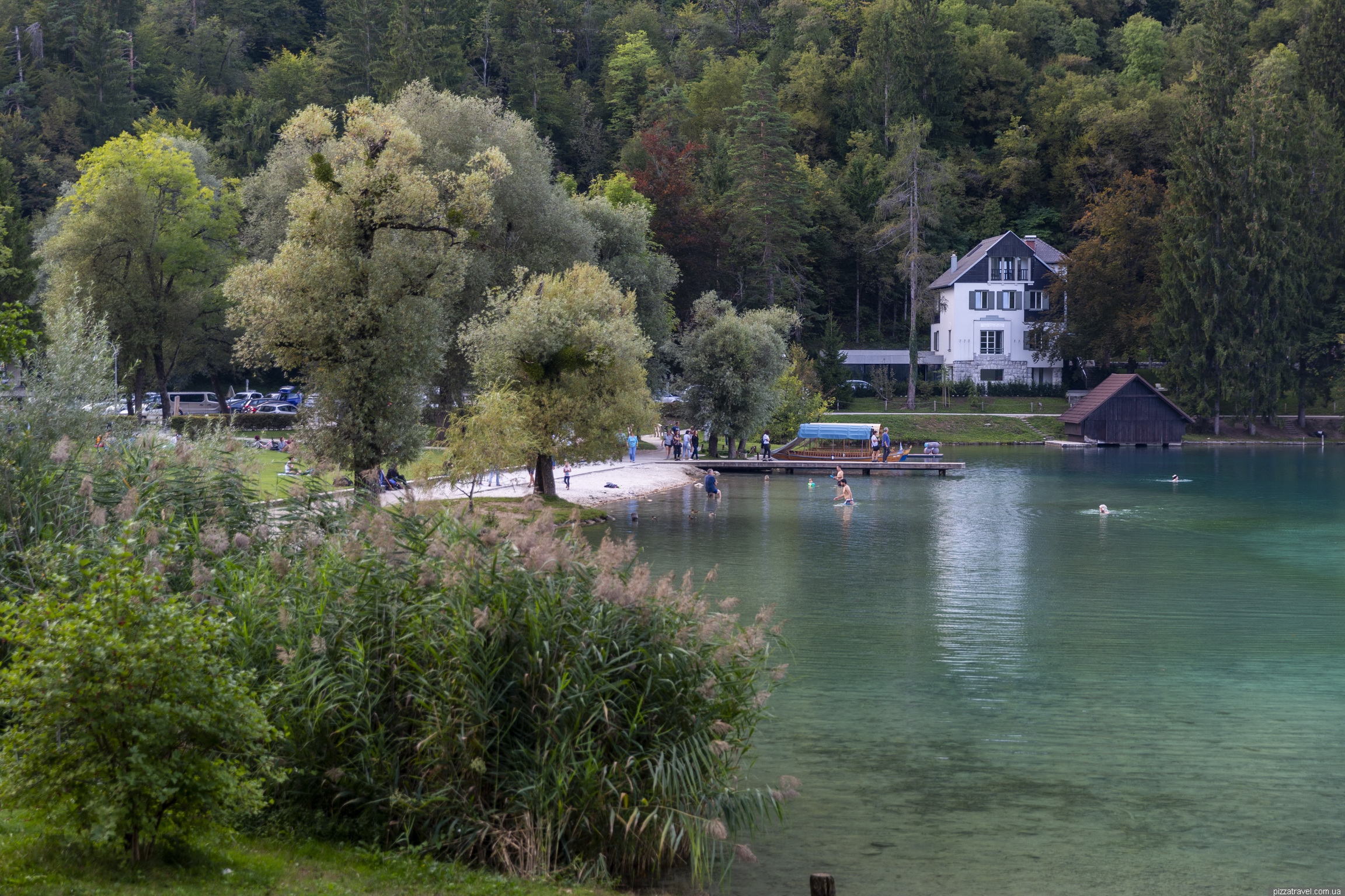 Справжній пляж, з берегом, є тільки на іншому кінці озера, там же і одна з небагатьох парковок N 46 21.746 E 14 04.898. На обох пляжах можна орендувати човен і допливти до острова.