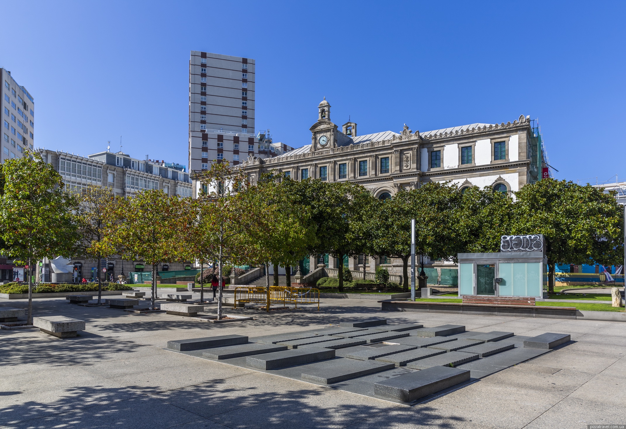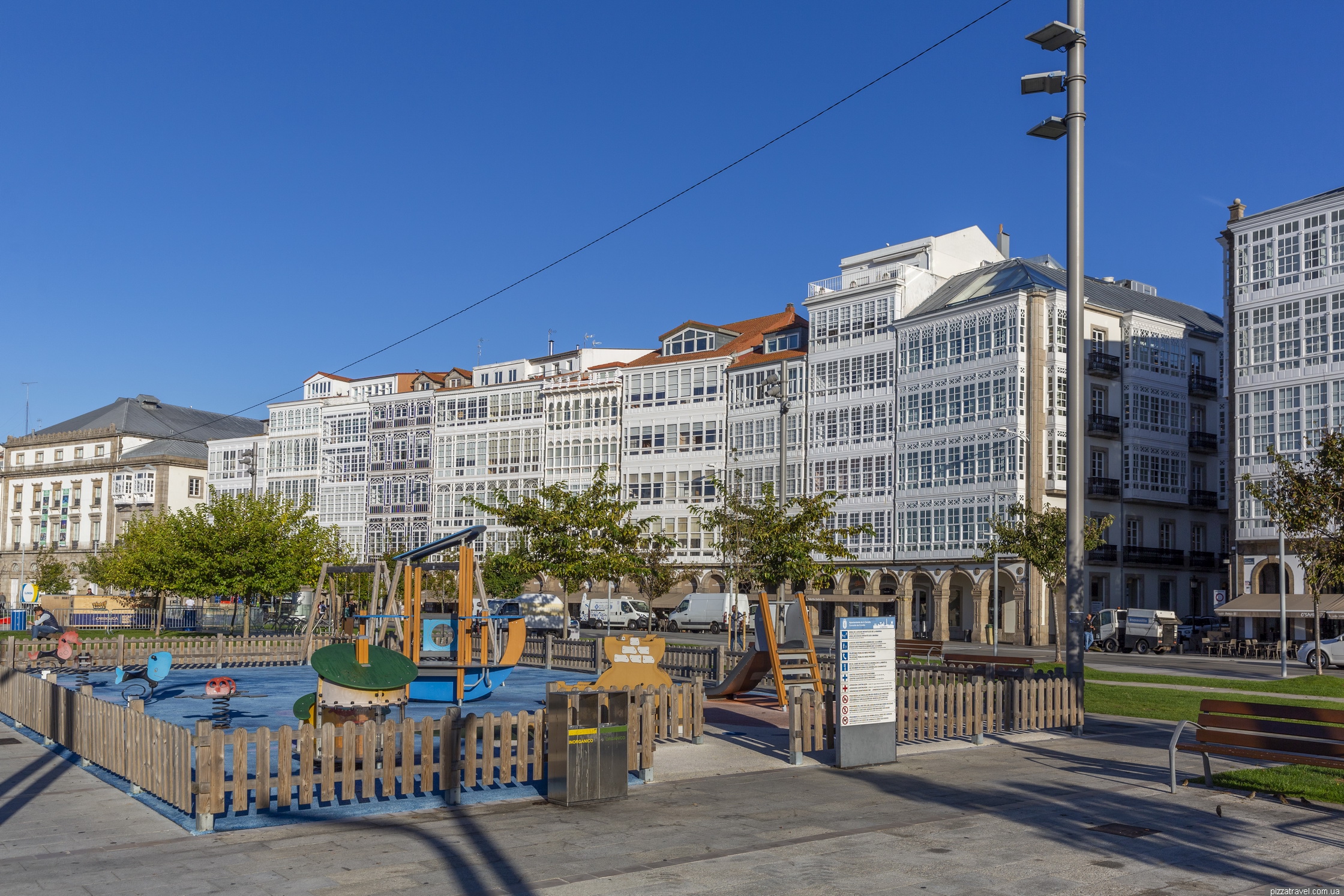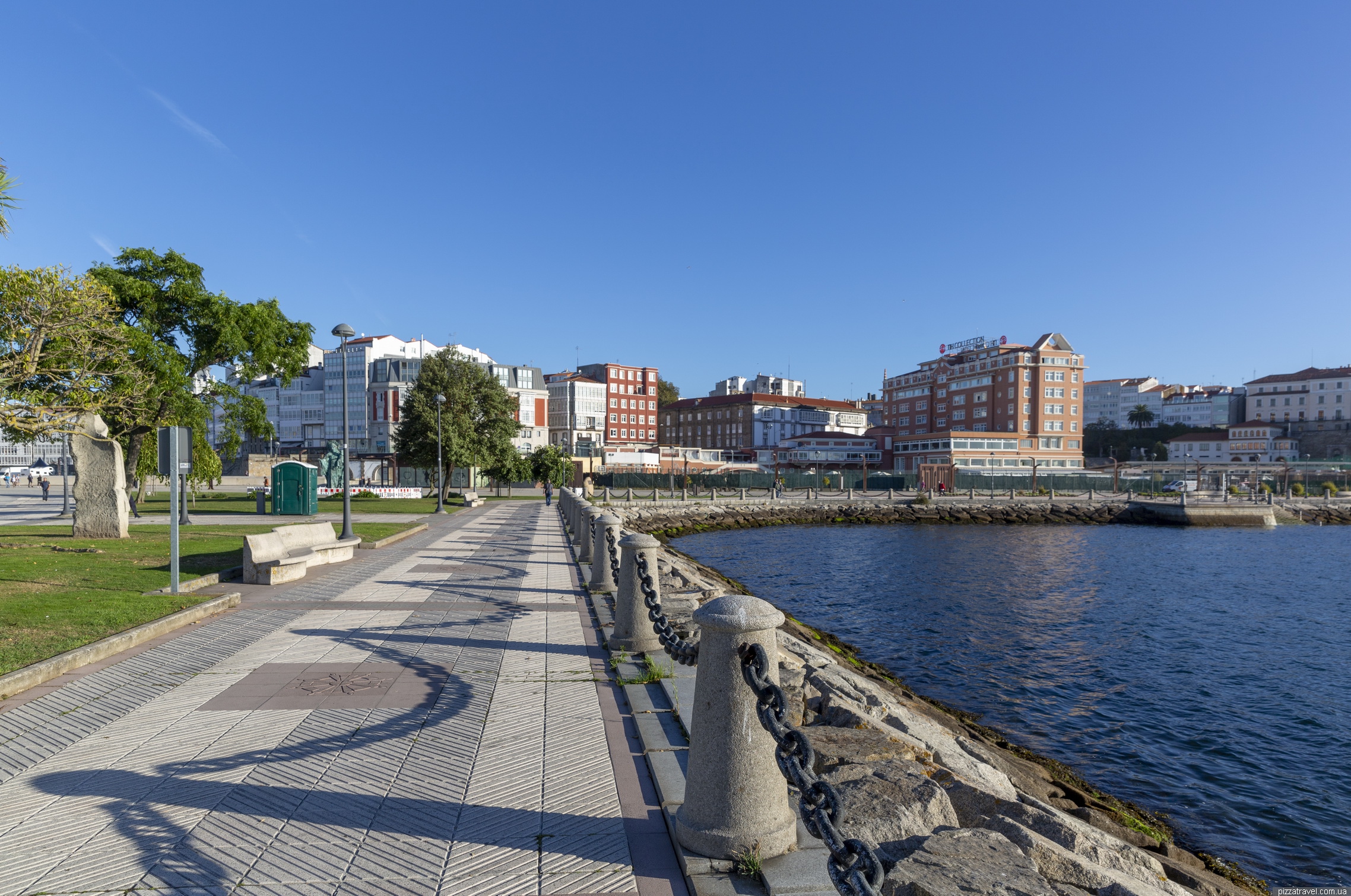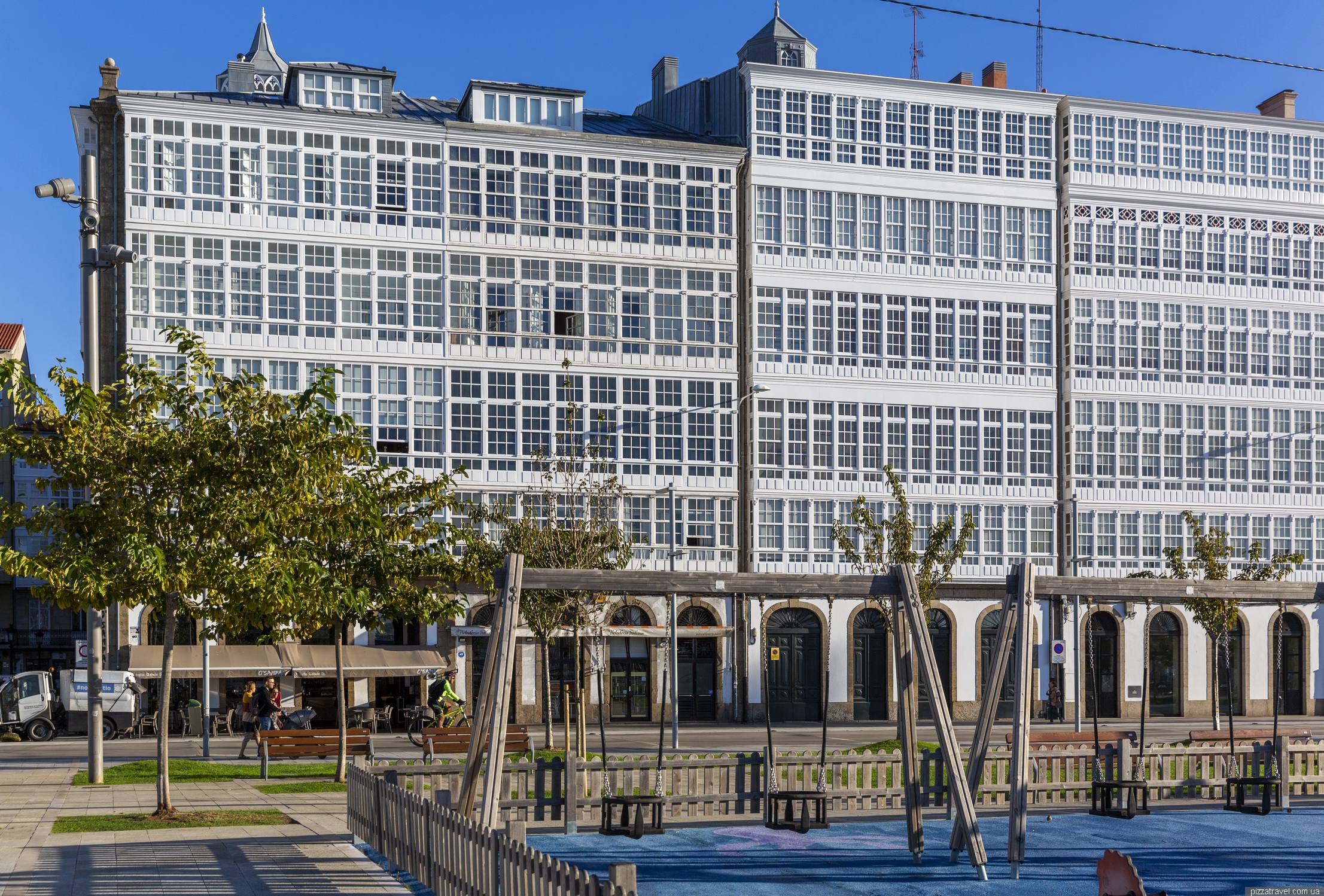 На набережній можна побачити досить багато засклених будівель, характерних для цього регіону. Така архітектура допомагає захиститися від дощу і вітру. Відразу за ними розташована центральна площа міста Плаза де Марія Піта (María Pita).
