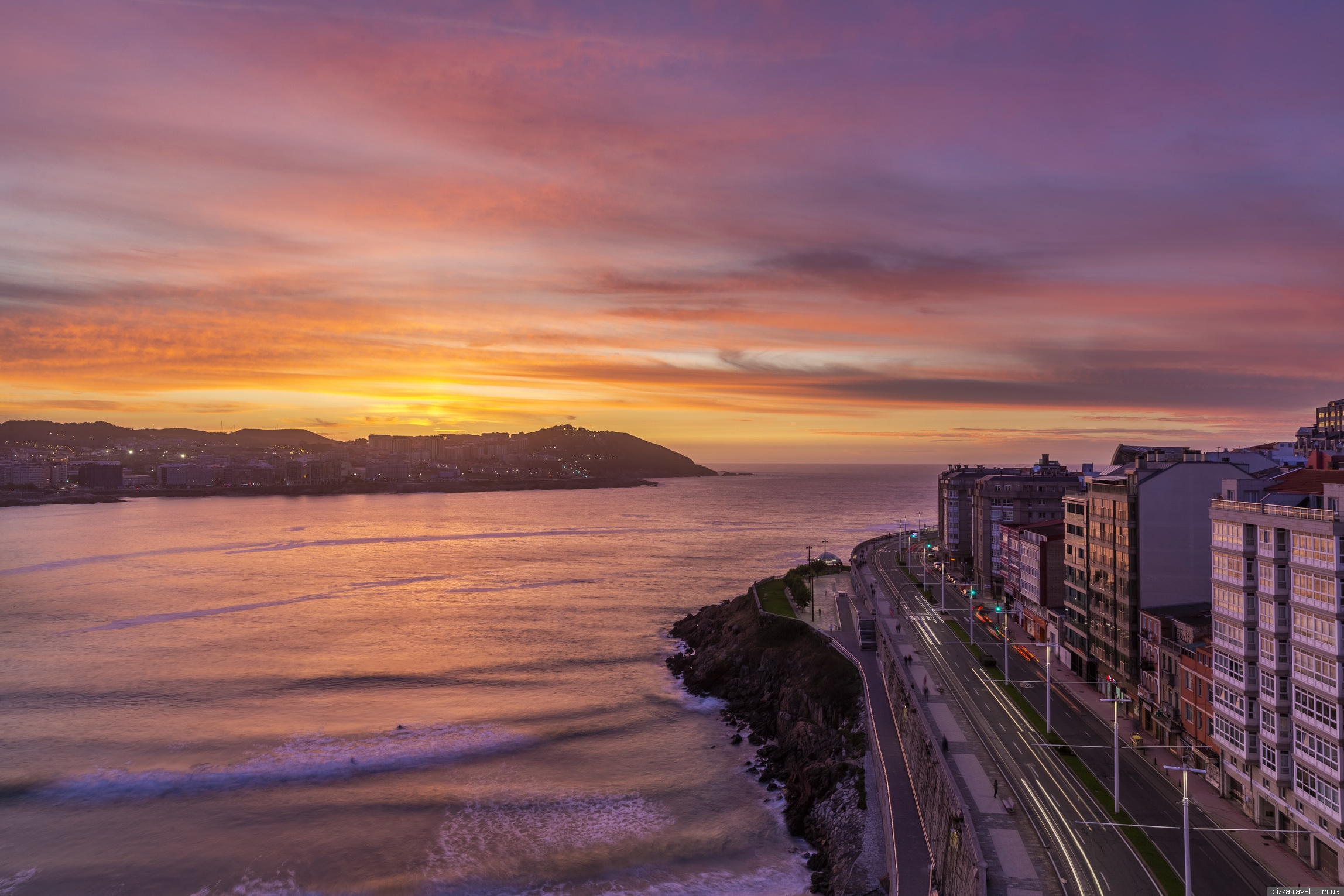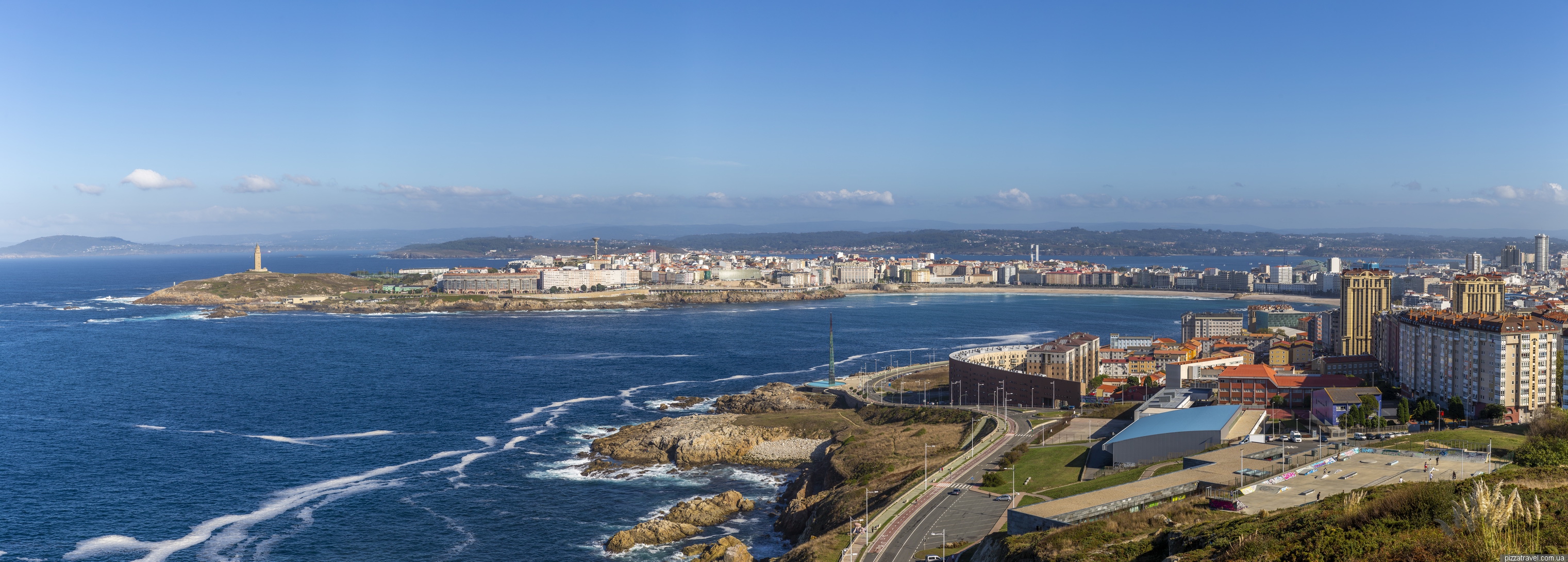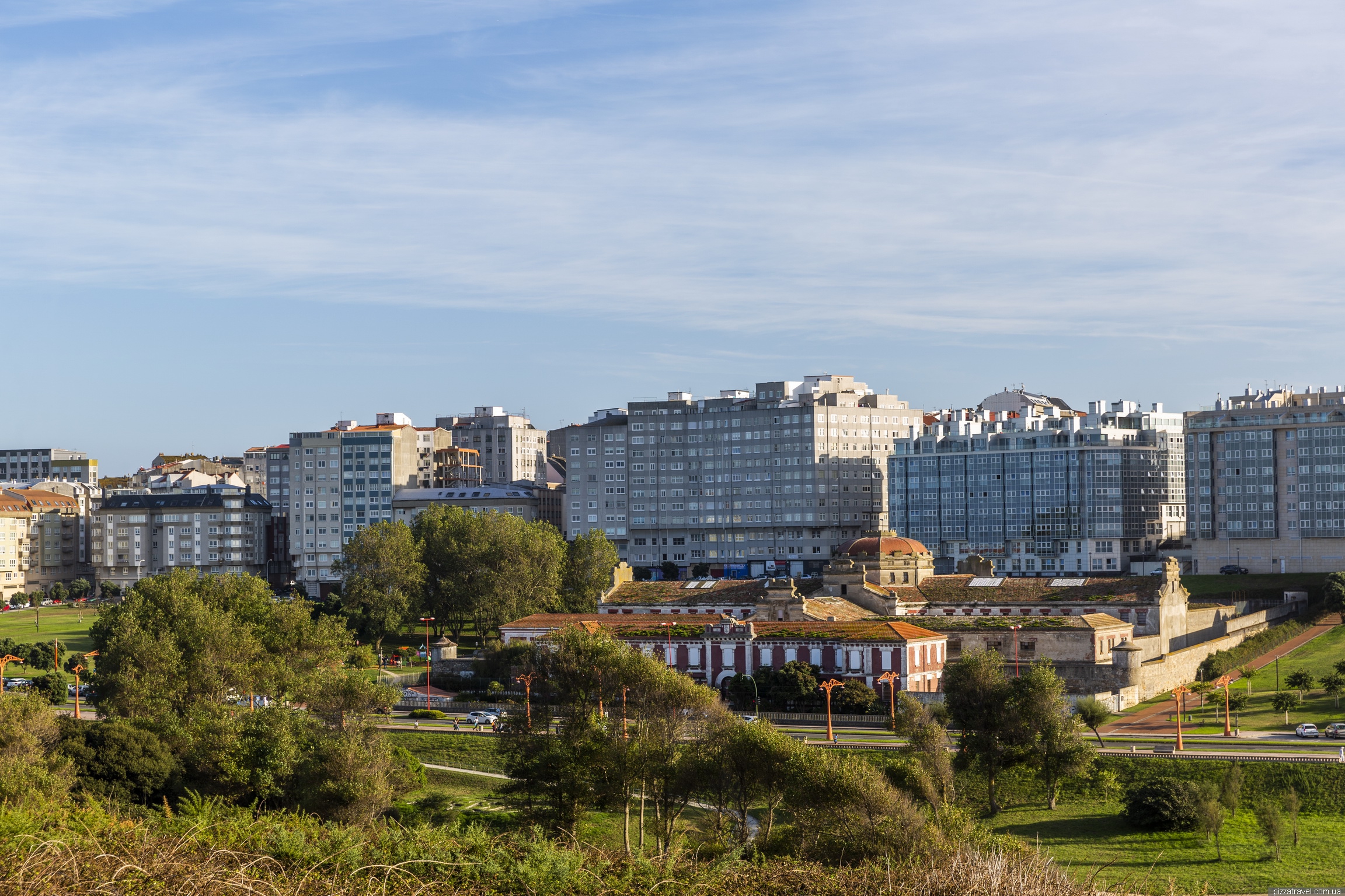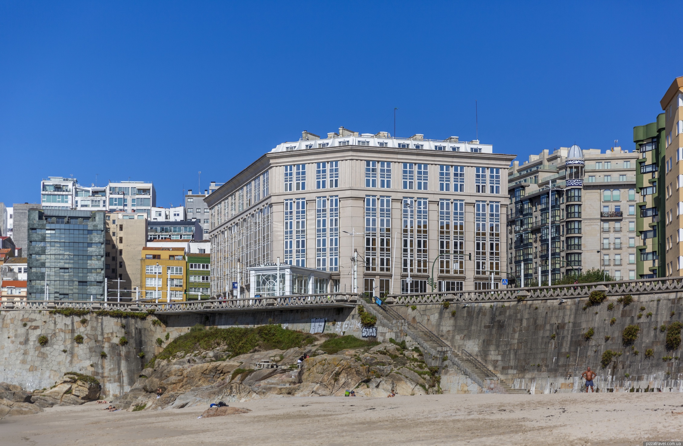 На набережній можна побачити досить багато засклених будівель, характерних для цього регіону. Така архітектура допомагає захиститися від дощу і вітру. Відразу за ними розташована центральна площа міста Плаза де Марія Піта (María Pita).