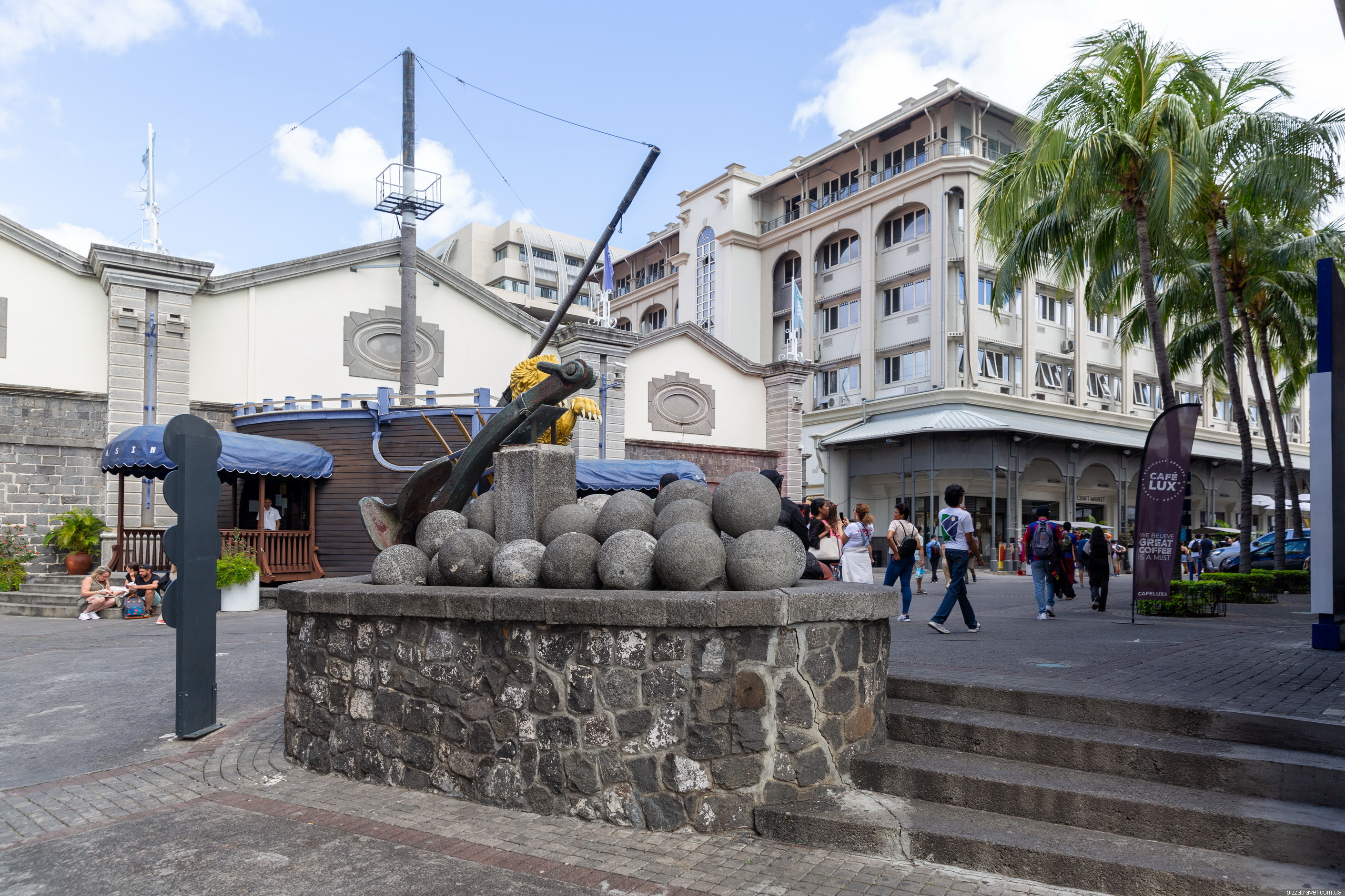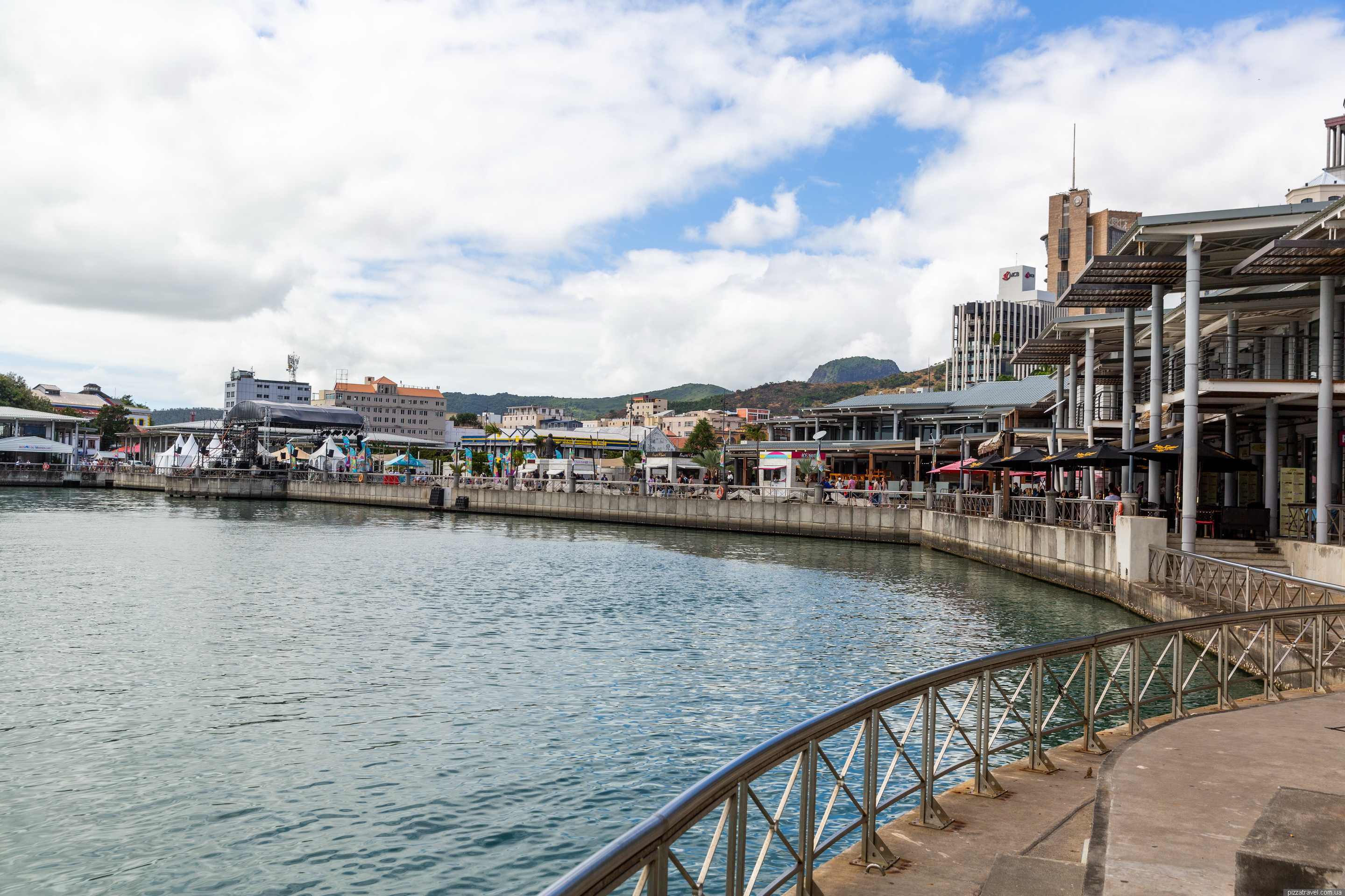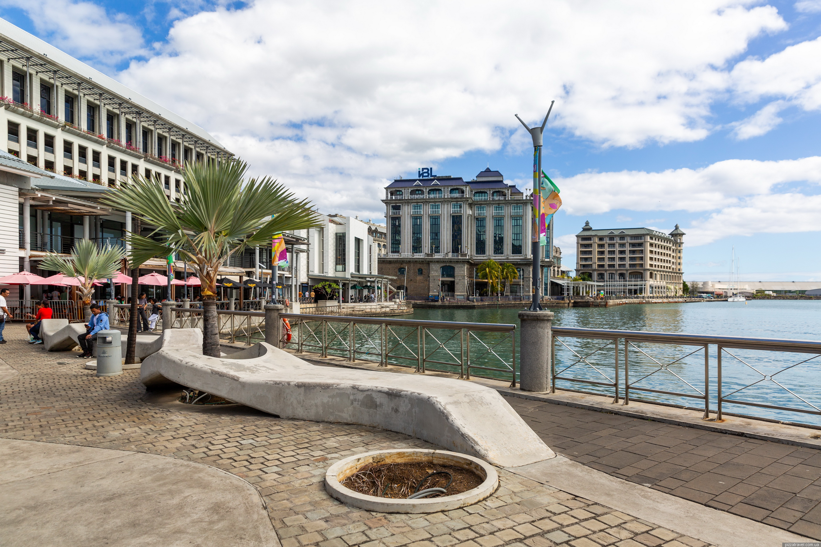 Набережна Caudan Waterfront нам чимось нагадала Скоп'є, тут немає скульптур, але архітектура схожа і все залите бетоном. По суті, це єдине місце в Порт-Луї де можна погуляти європейському туристу навіть з дітьми. Район побудували у 1980-х роках на місці старих портових складів і доків. Проєкт став частиною великої реконструкції портової території, щоб перетворити її на сучасний туристичний і комерційний центр.