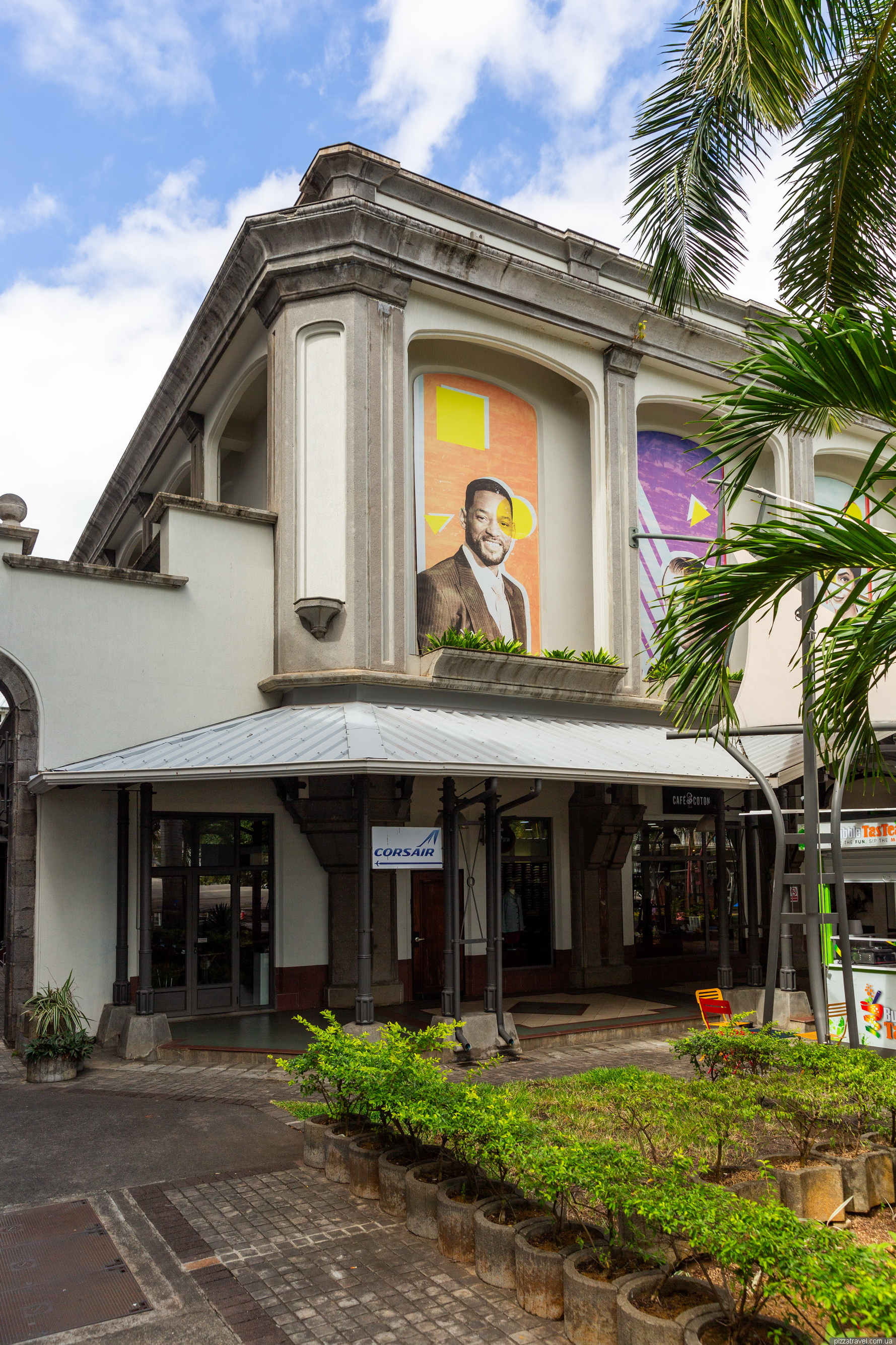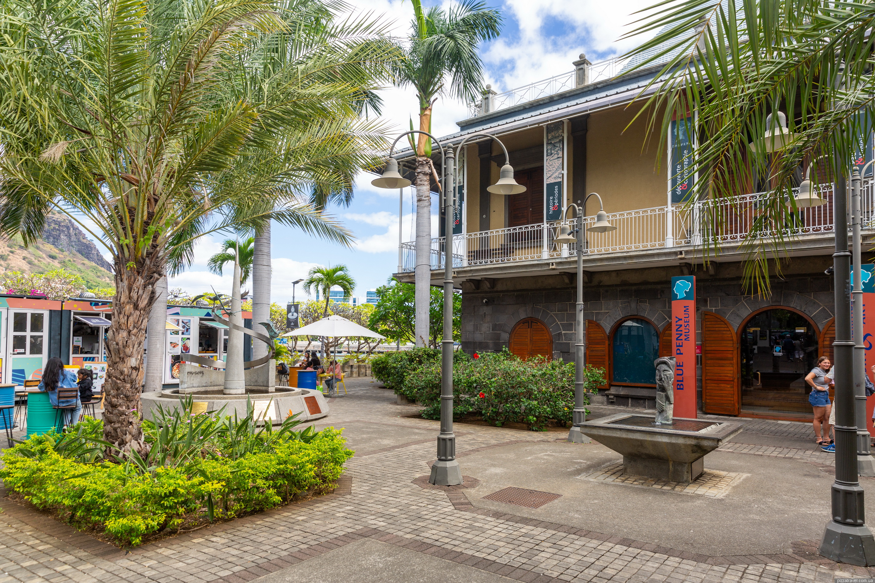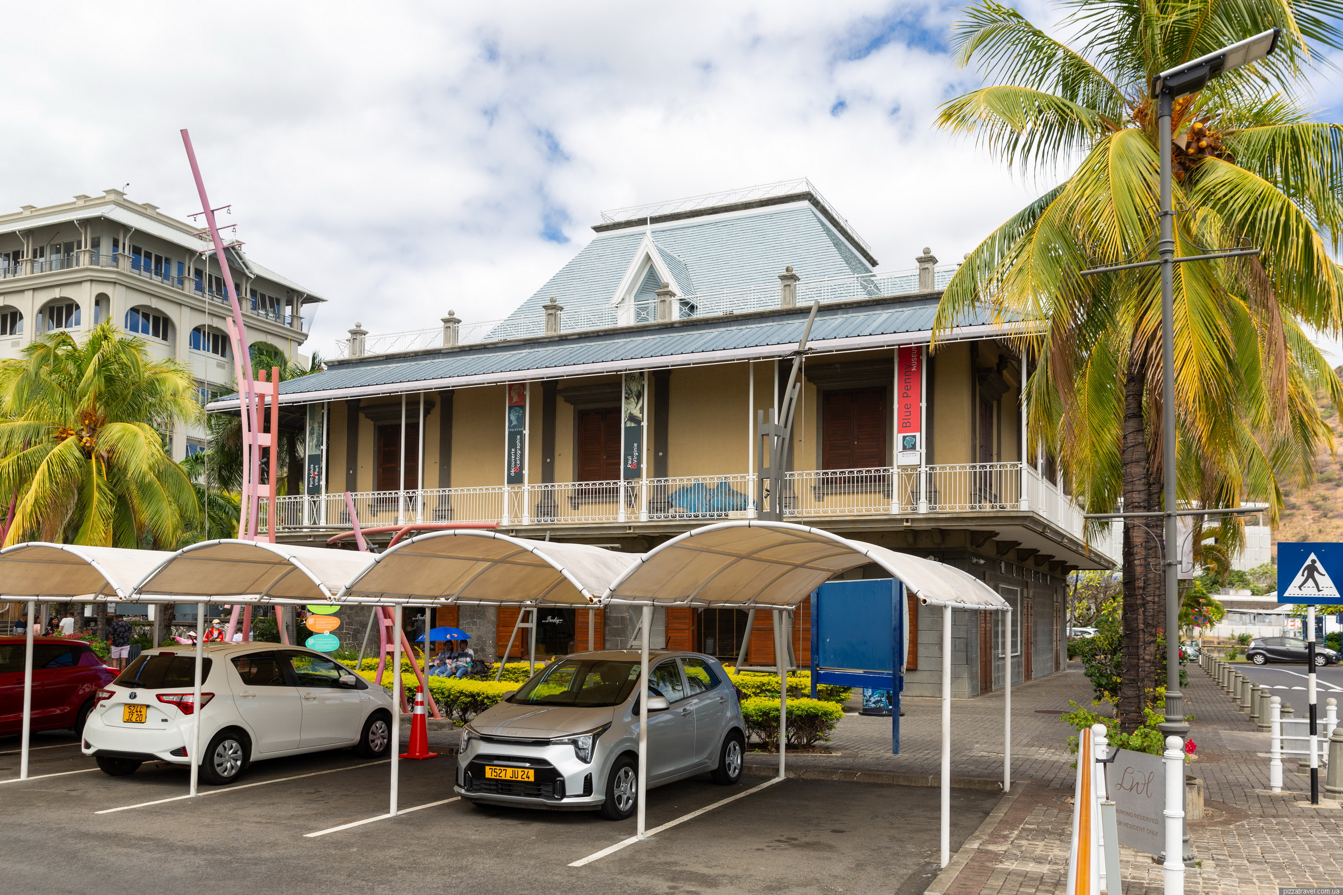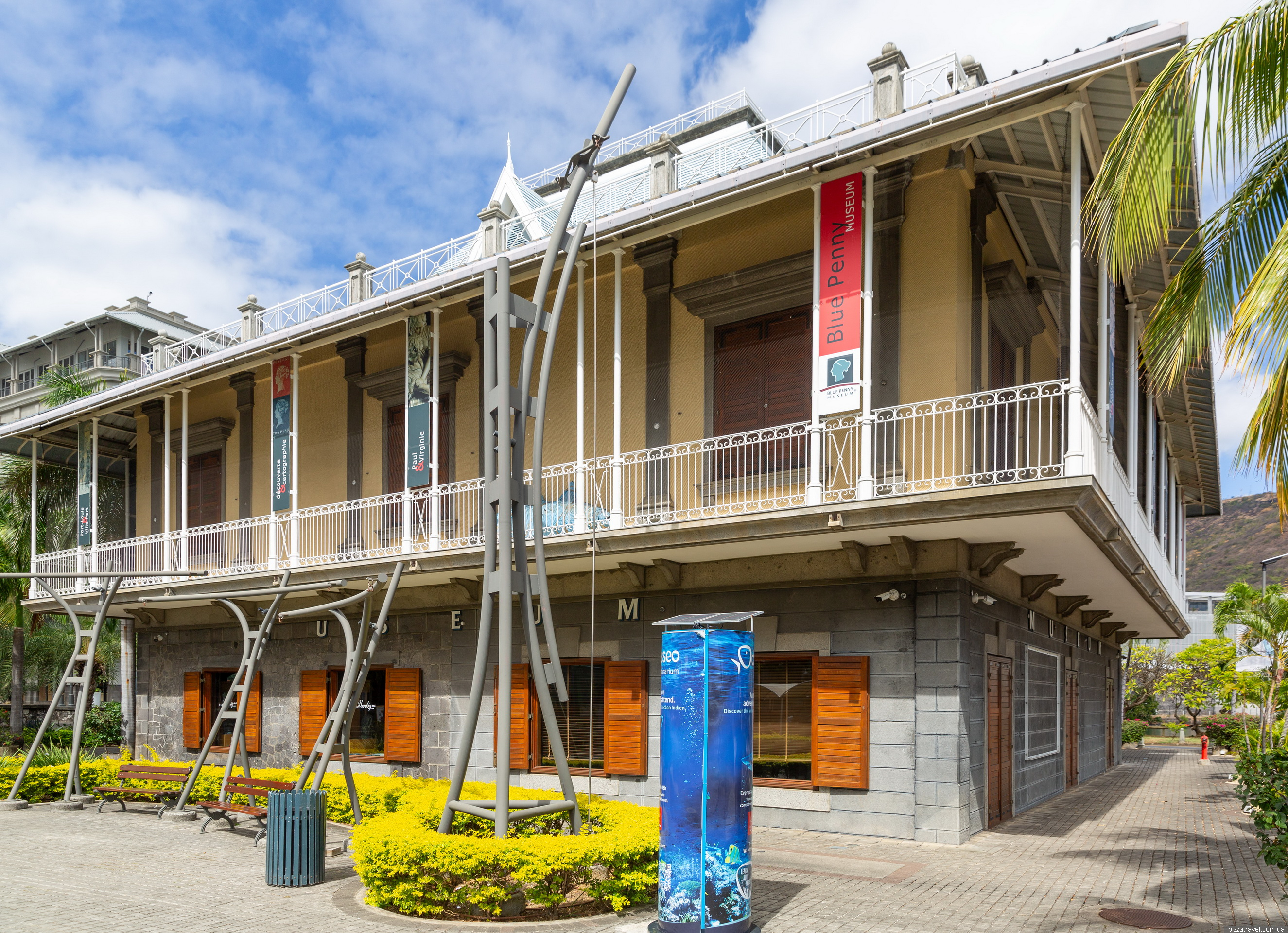 Після форту, поїхали на набережну. У порту є гарна і зручна парковка, рекомендуємо (-20.160556, 57.496694). Одразу біля парковки є красивий Музей Блакитного Пенні (Blue Penny Museum), де зберігається знаменита поштова марка Blue Penny — одна з найрідкісніших у світі.